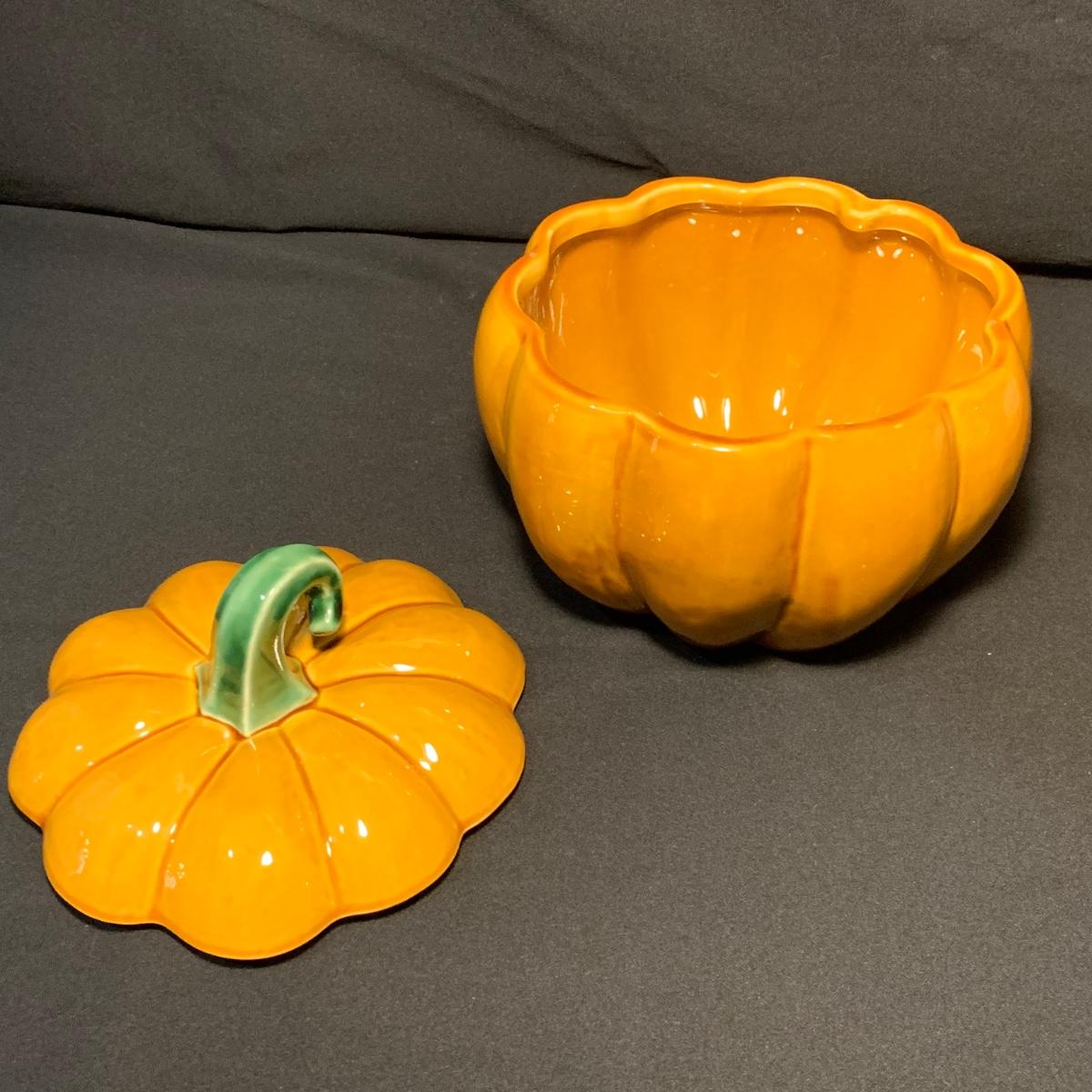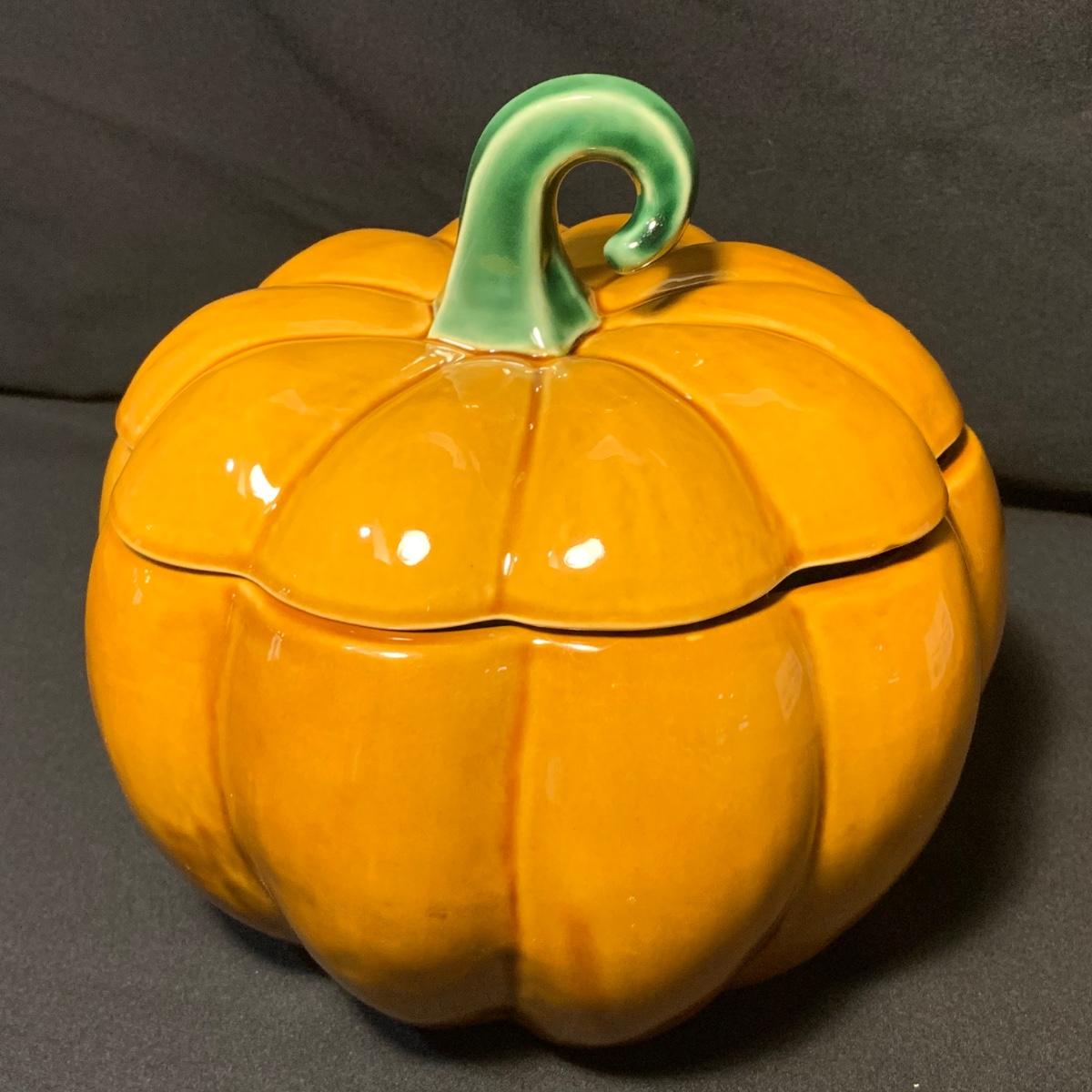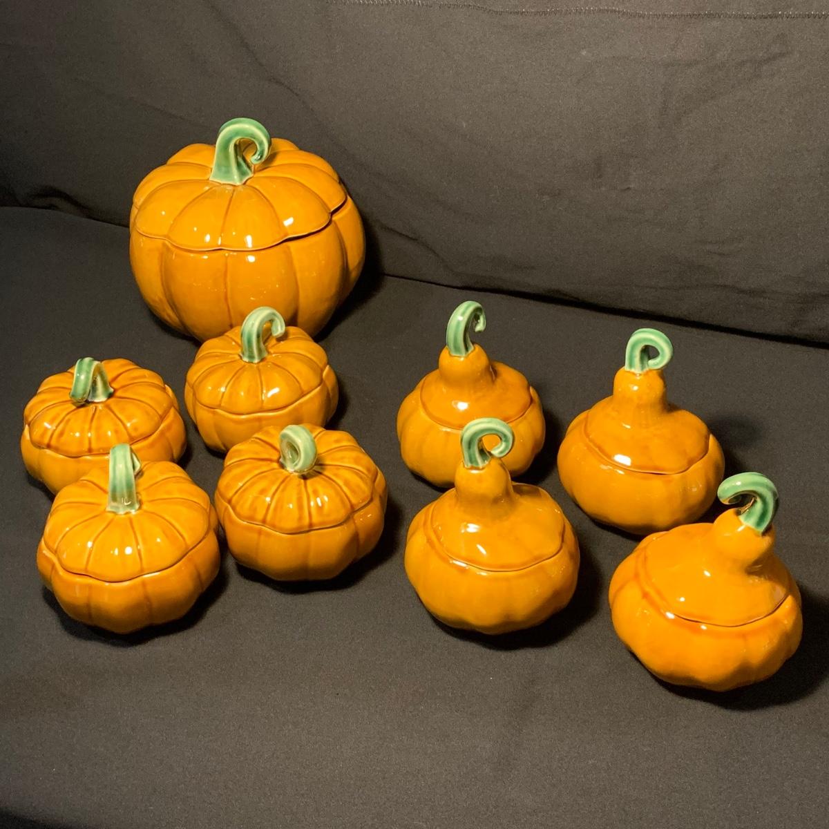 Williams-Sonoma gourd themed soup server with eight bowls. This ceramic serving set features four pumpkin lidded soup bowls and four lidded squash soup bowls. All items have lids and set is complete. Larger serving bowl measures, 9”D x 8.5”H.