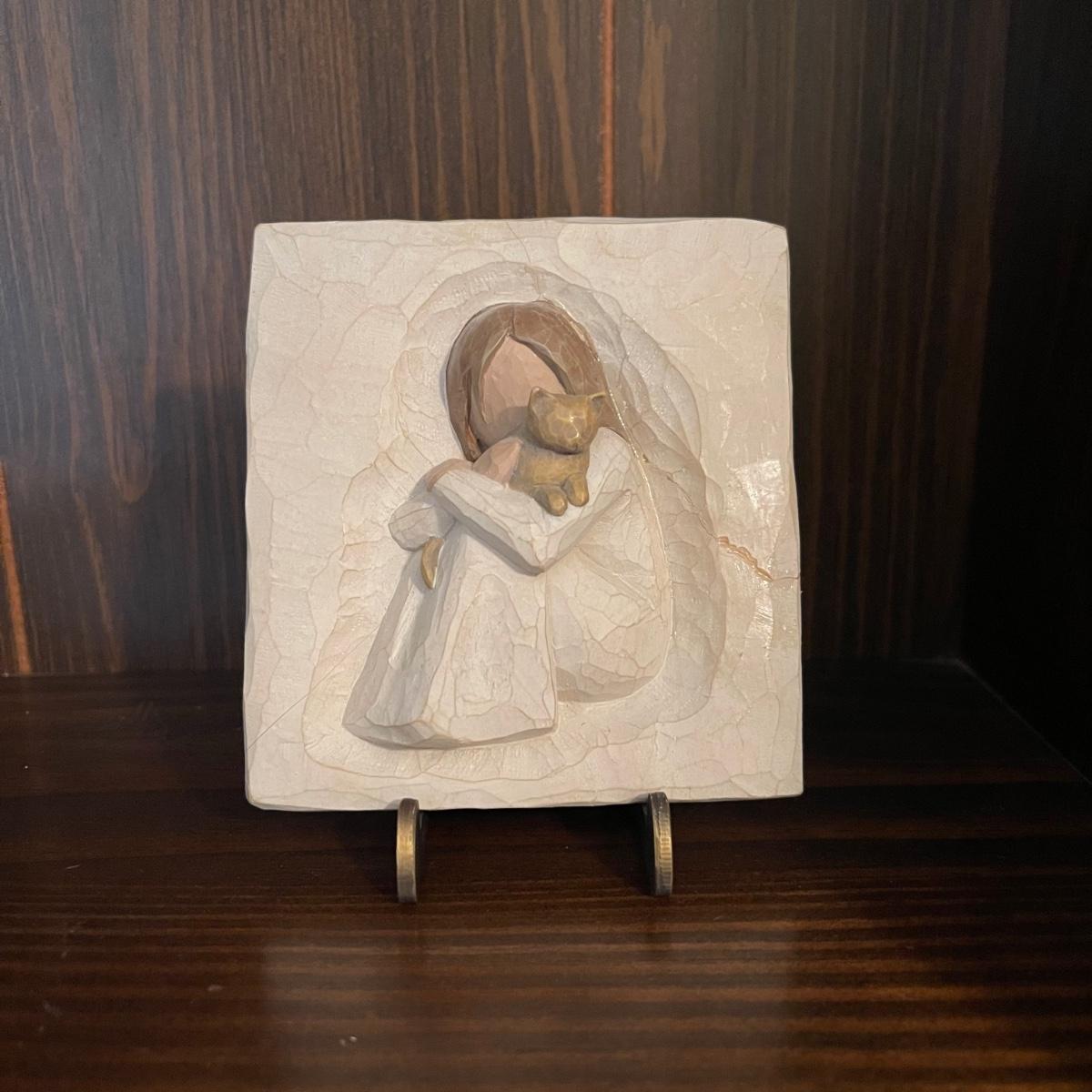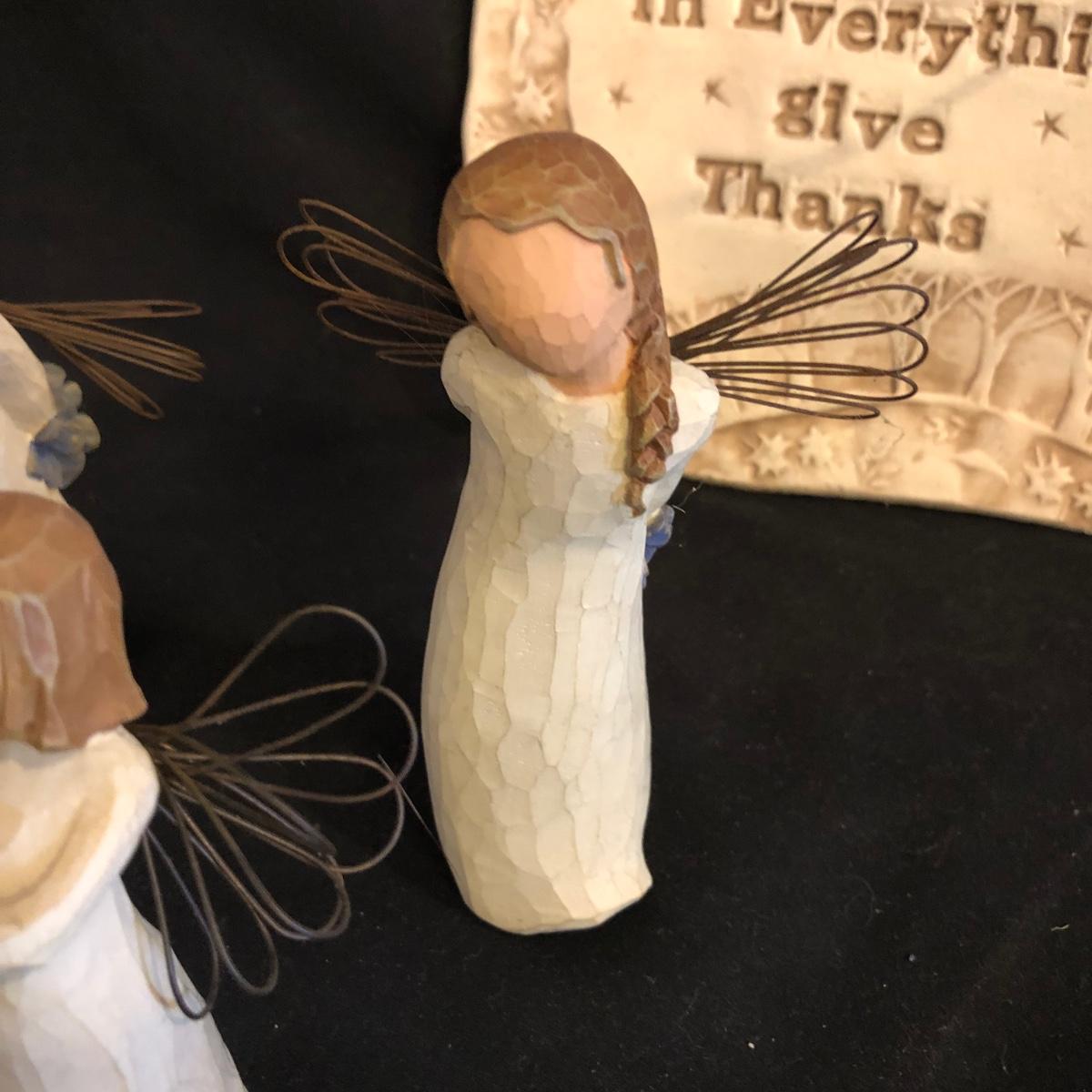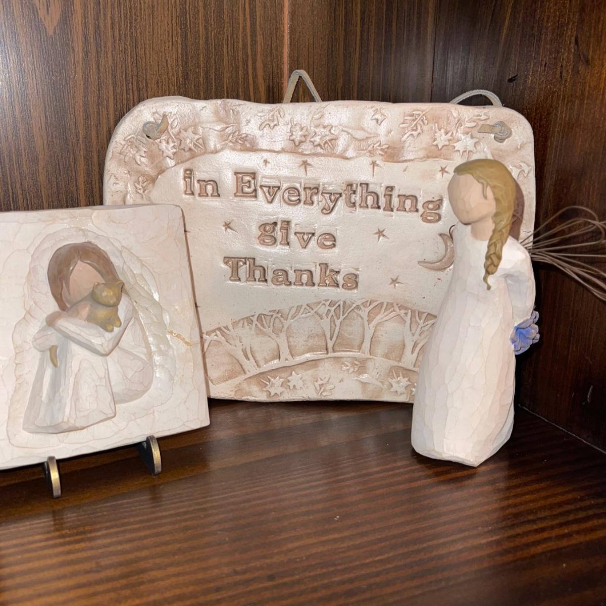 This lot includes three Willow Tree angels, a prayer plaque and a wall plaque. Three (two are alike) Willow Tree angels are named “Thank you” and “Angel of Friendship.” The wall plaque is titled “An Embrace of Comfort and Love” and measures (4” x 4”) . It does have a crack but seems securely attached. The ceramic plaque says “In Everything give Thanks” and was made by Sky Pottery in Burnsville, NC. and measures 8.5” x 6”.