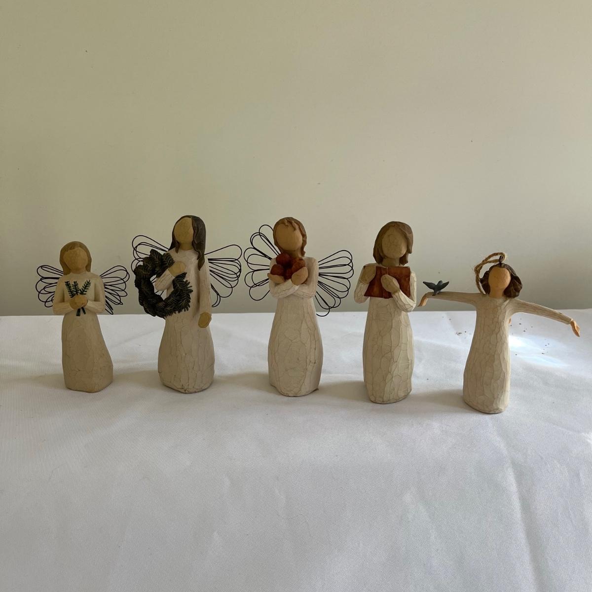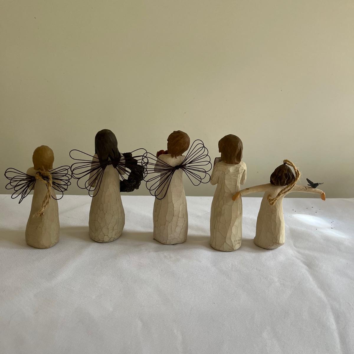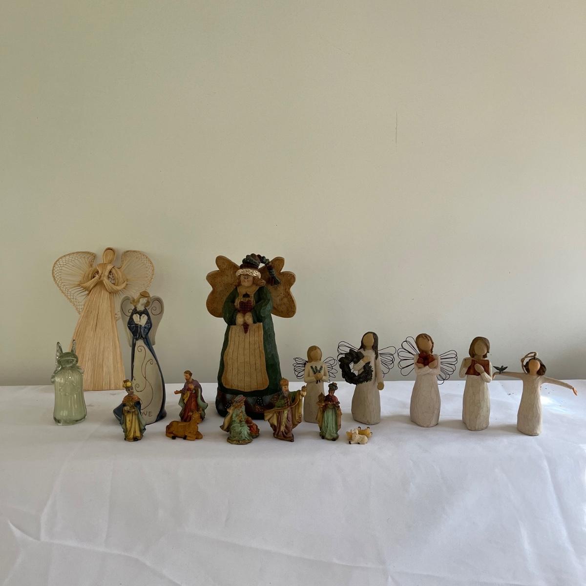 This lot contains five Willow Tree figurines, a glass angel figurine, ceramic and resin angel figurines and more. Largest angel figurine measures 3.5” x 5.6” x 10”.