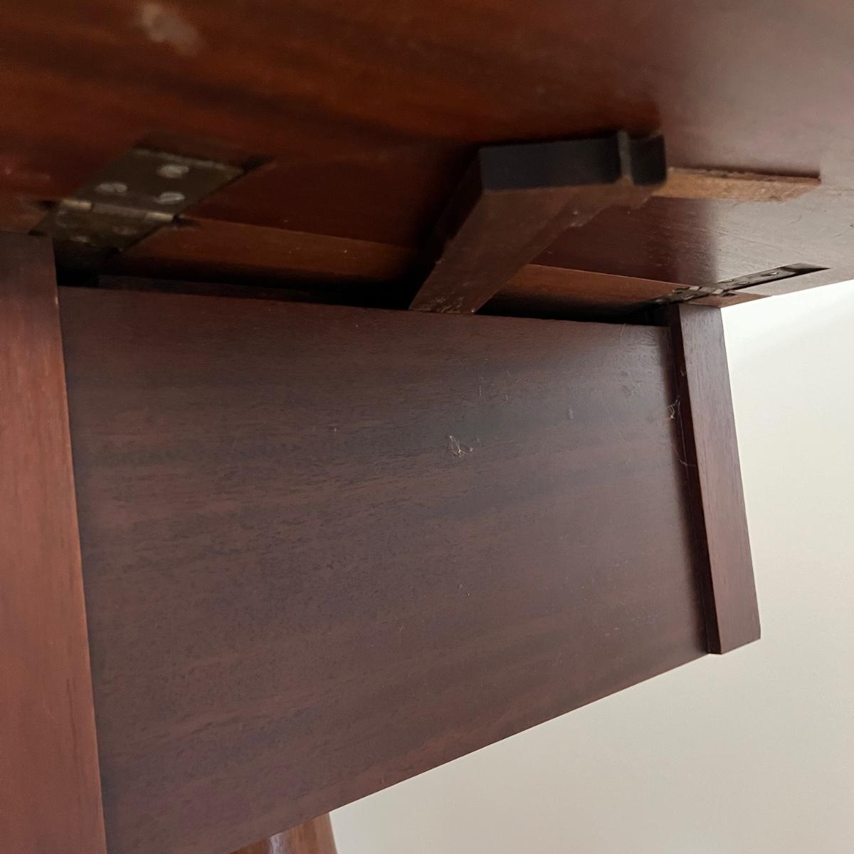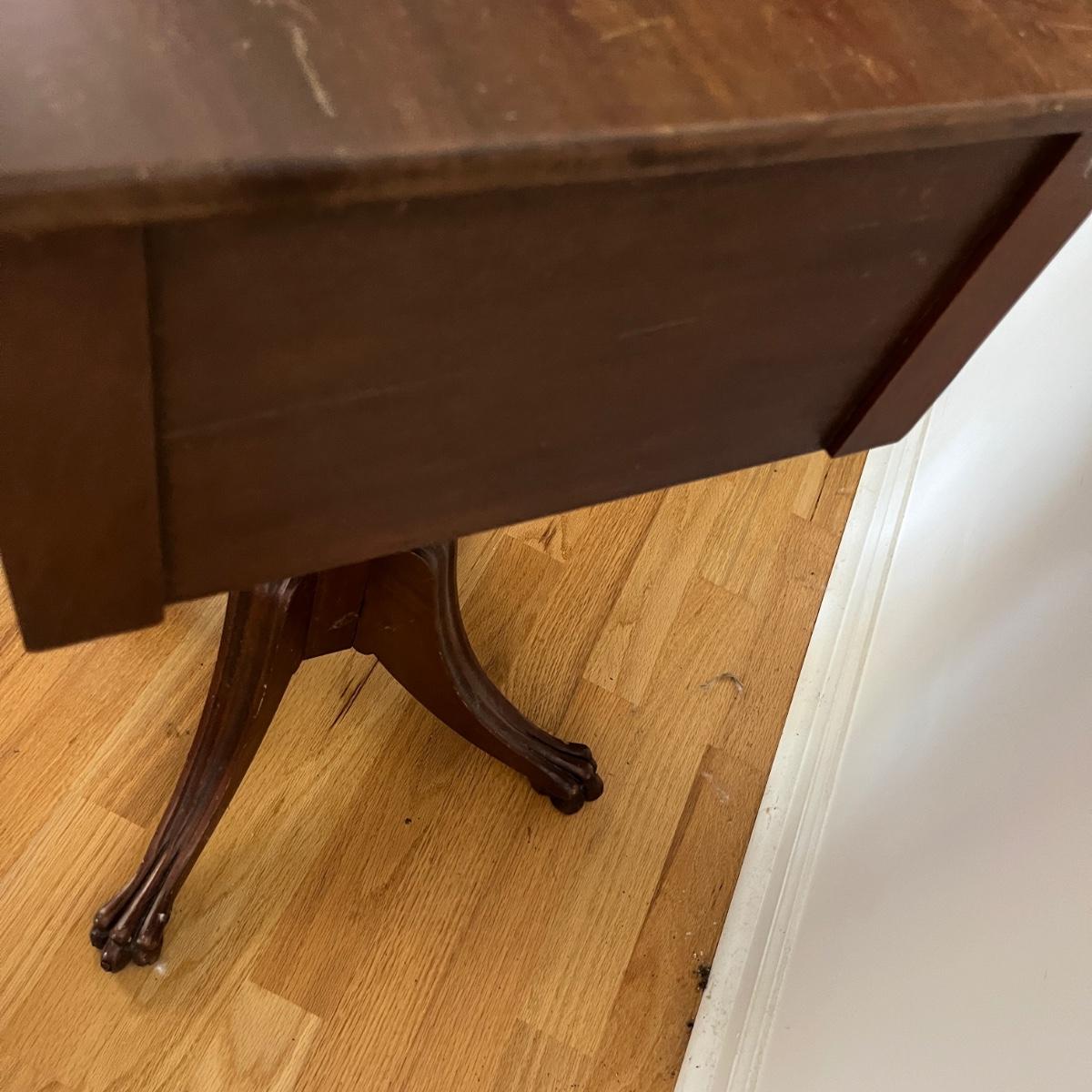 Lot includes a vintage Wilson & Mayers pedestal drop leaf side table with two dovetailed drawers and claw feet. Table measures 35” x 17” x 27.5”H when open and 18” x 17” x 27.5”H when closed. Table has scratches and nicks. Please see pictures.