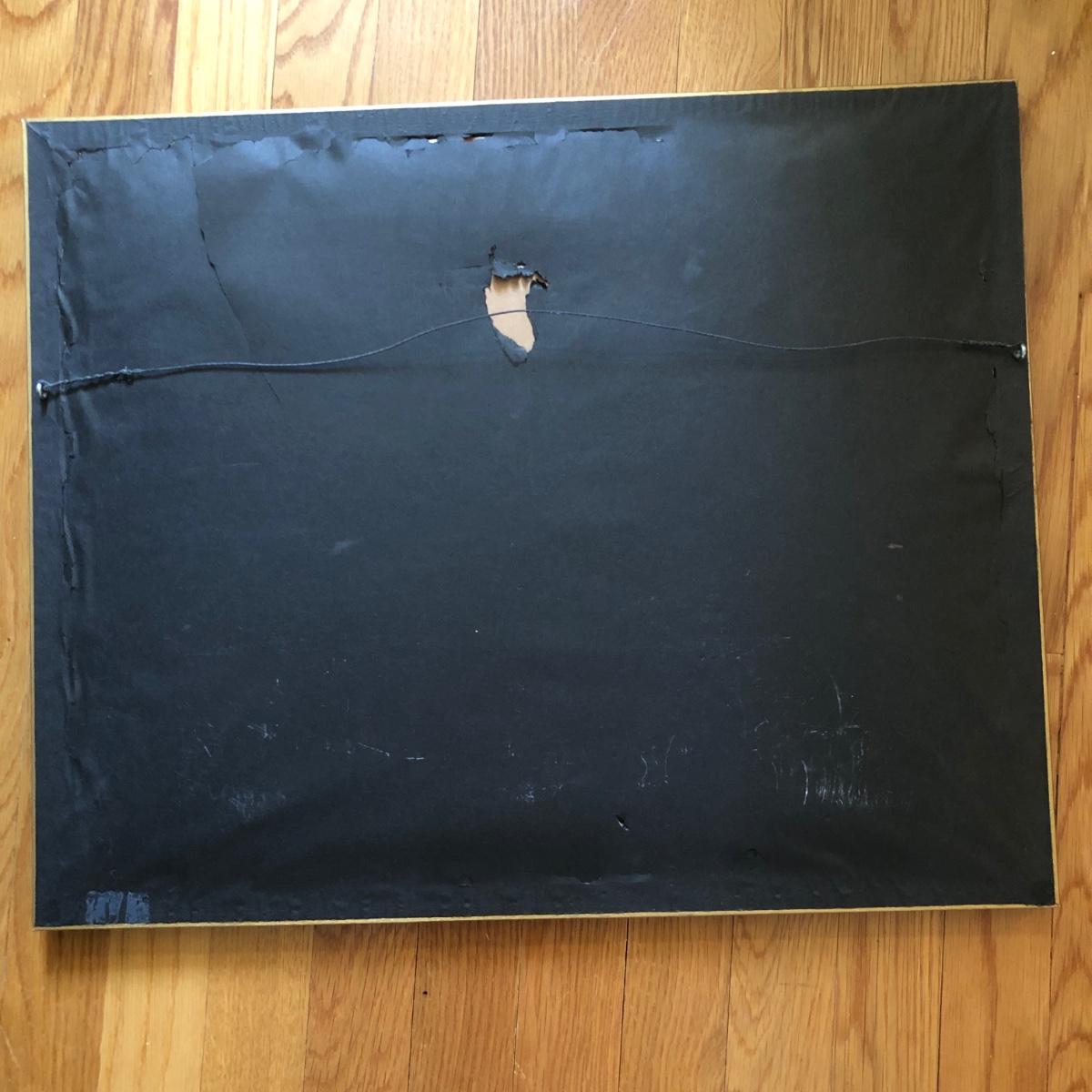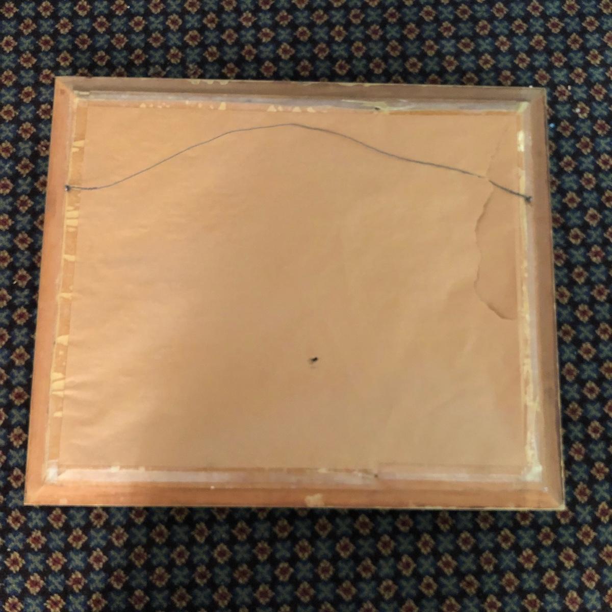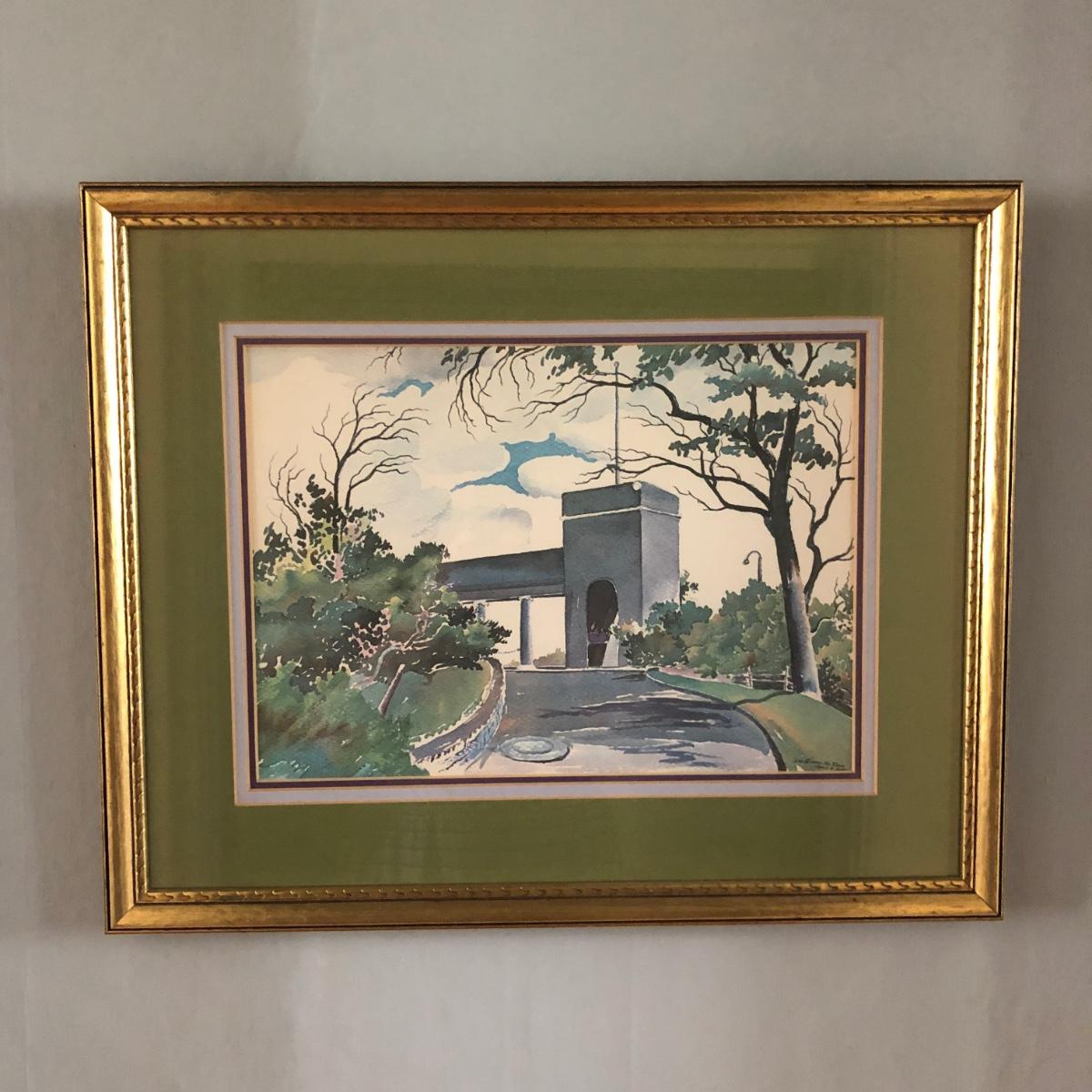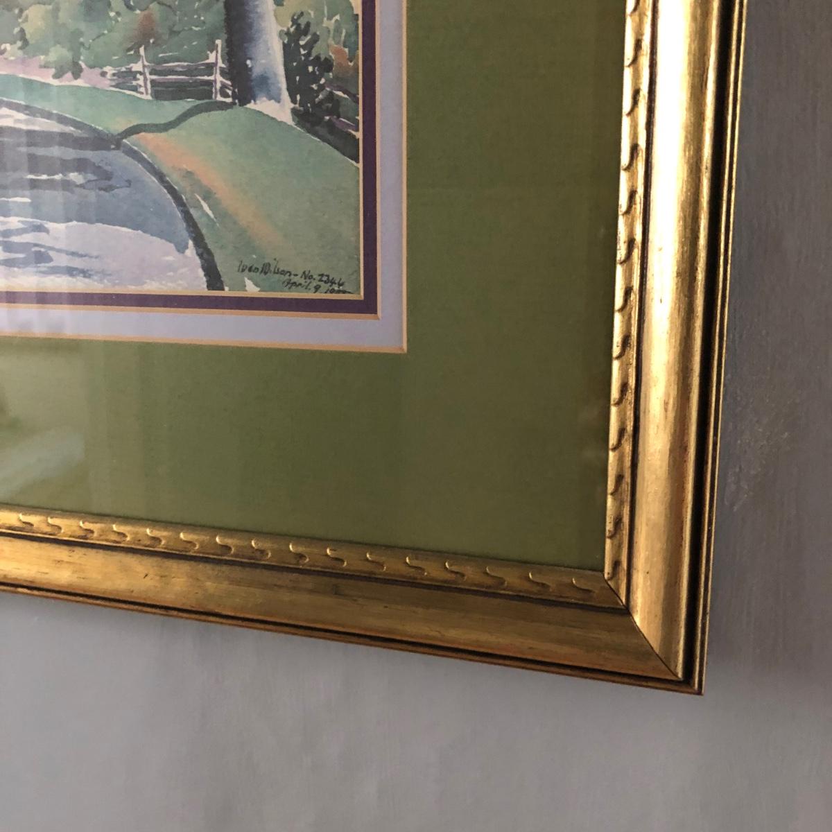 A print of a watercolor signed “Ivan Wilson No. 2346 April 9” with a year that is covered by the mat is together with a gold framed mirror in this lot. The print of the watercolor is framed in gold with green, light blue, and purple mats that bring out the minimalist greens and blues of the print. The painting measures 22” x 17.5” x 1”. The gold painted wood mirror has raised embellishments and measures 25.5” x 21.5” x 2.5”. Shipping available. Shipping art can be costly. Please contact the local UPS store to get a shipping quote.