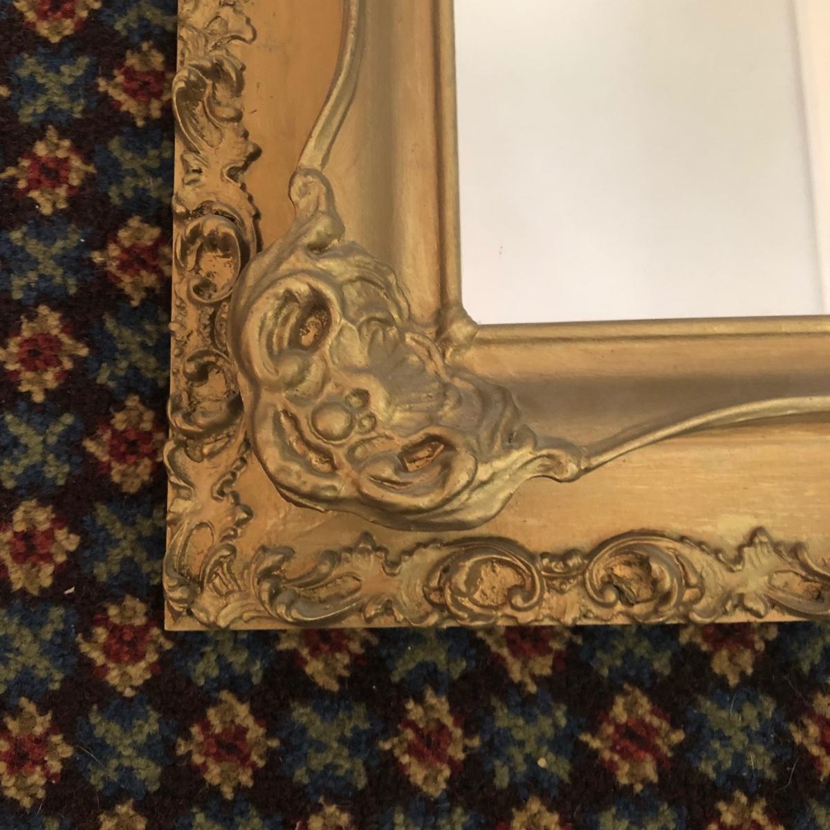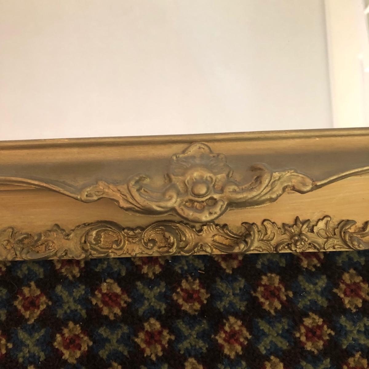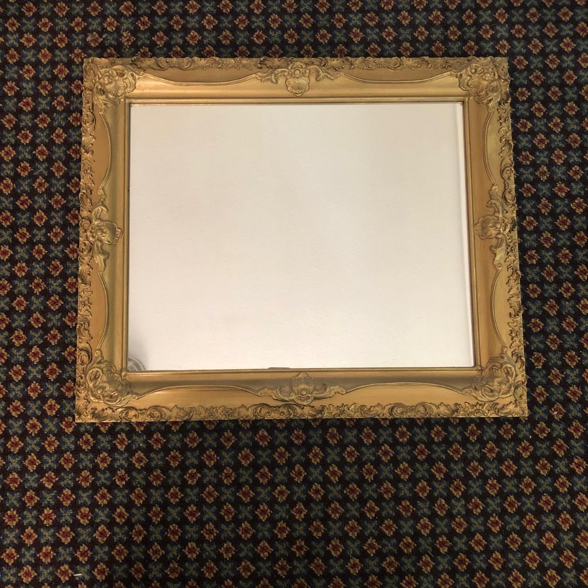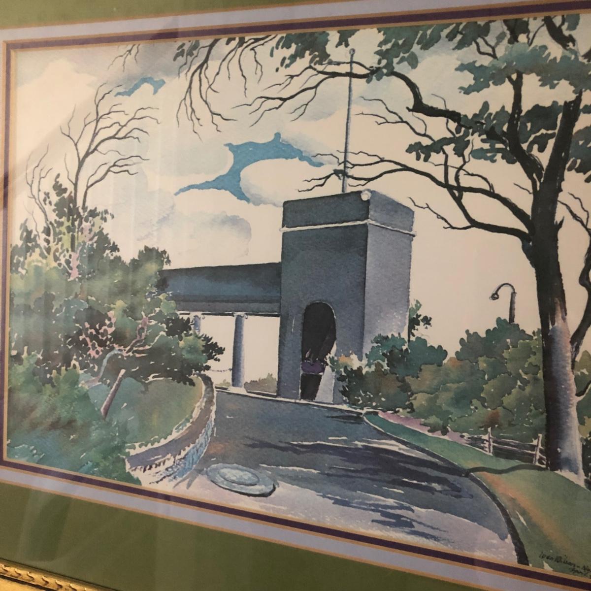 A print of a watercolor signed “Ivan Wilson No. 2346 April 9” with a year that is covered by the mat is together with a gold framed mirror in this lot. The print of the watercolor is framed in gold with green, light blue, and purple mats that bring out the minimalist greens and blues of the print. The painting measures 22” x 17.5” x 1”. The gold painted wood mirror has raised embellishments and measures 25.5” x 21.5” x 2.5”. Shipping available. Shipping art can be costly. Please contact the local UPS store to get a shipping quote.