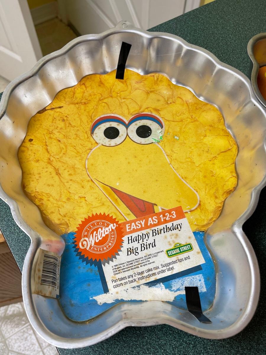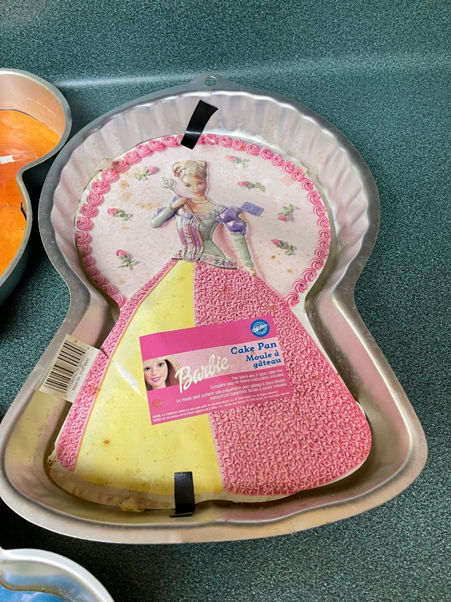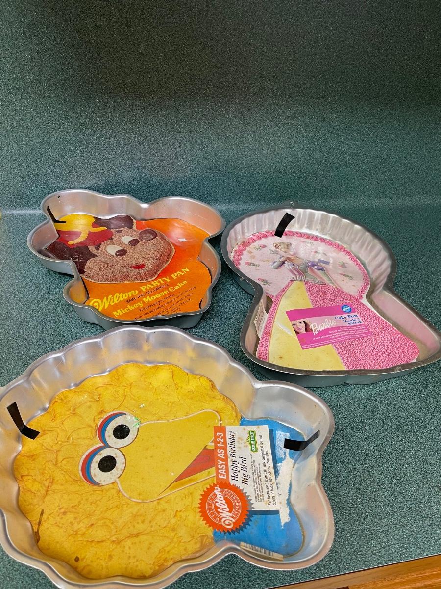 Three Wilton cake pans-Barbie , big bird, Mickey Mouse