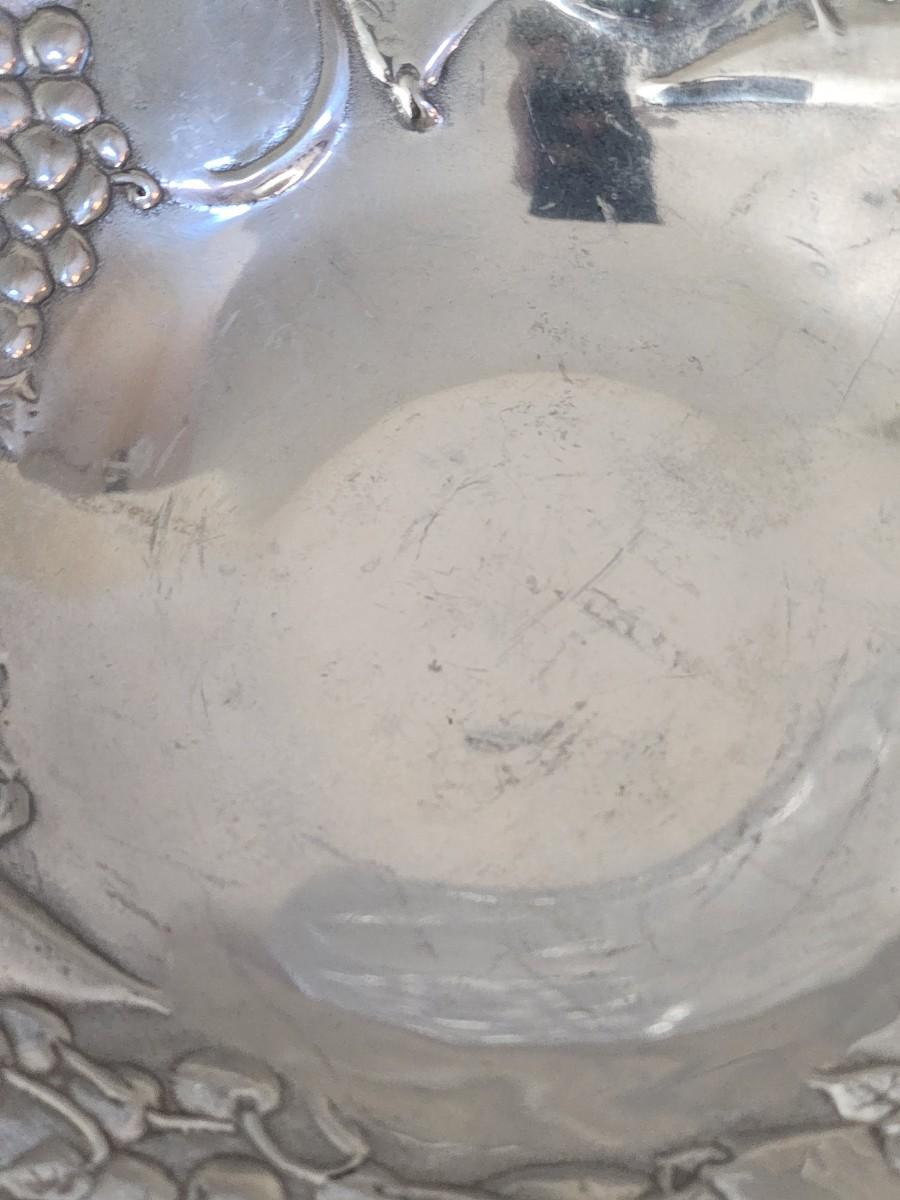 Bowl is 12.5" diameter, 3" tall. Very large - beautiful for fruit or other display. Rim is decorated with raised motif of grapes, apples, peaches, pears and bananas.. Light utensil scratches in the center.