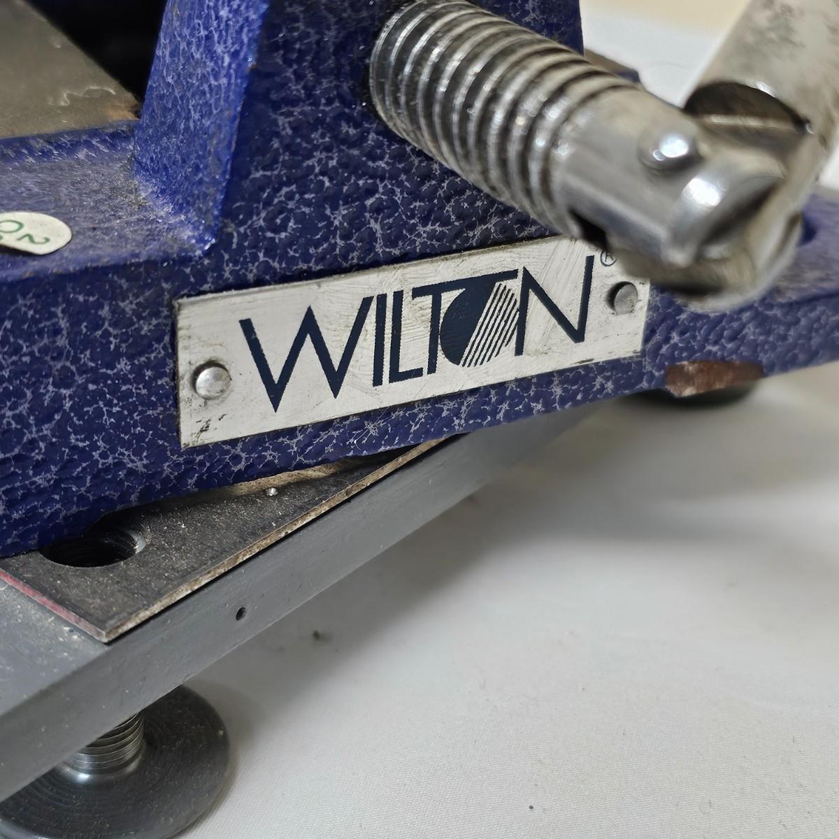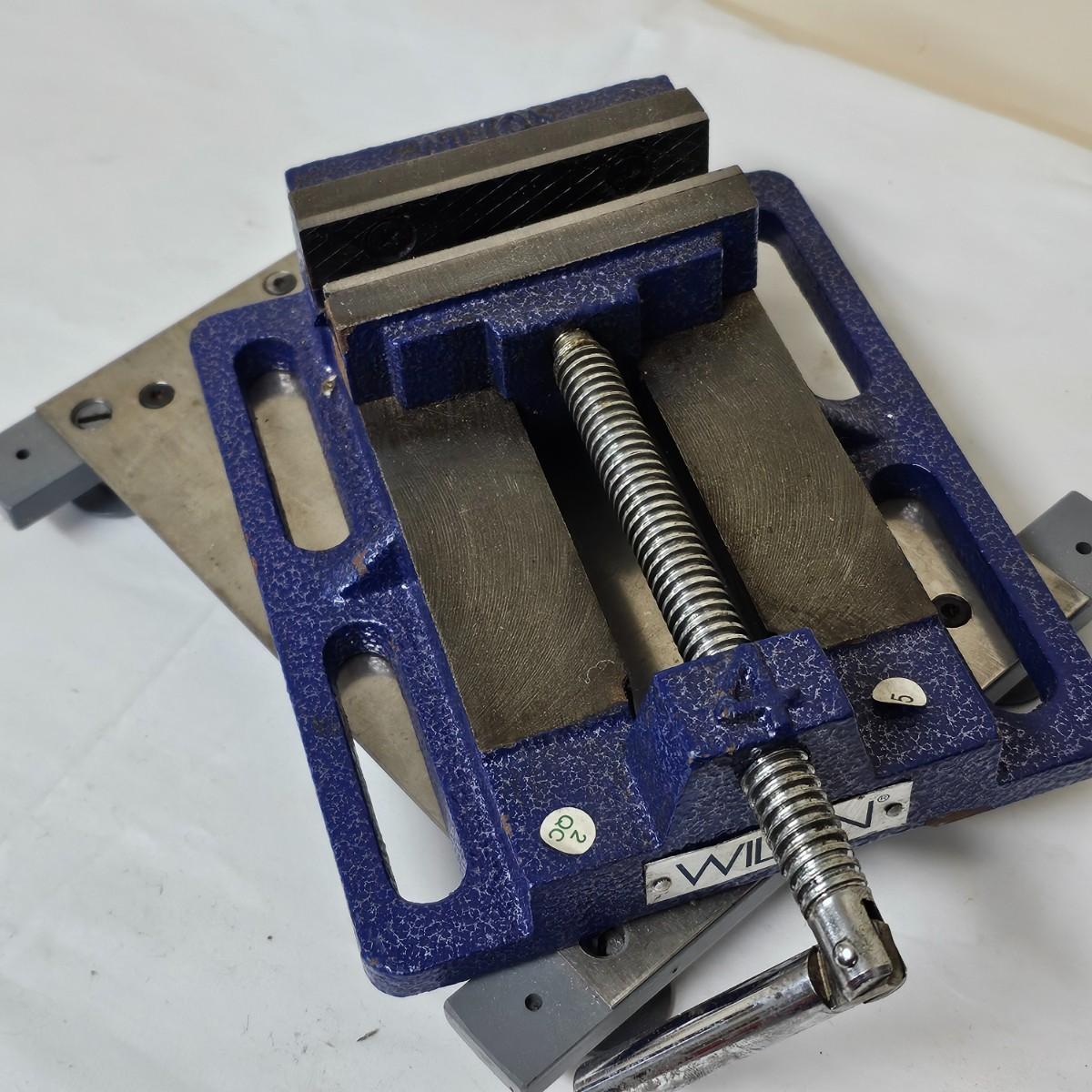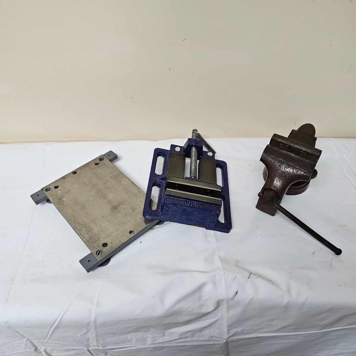 One Wilton flat vise for use on drill presses and other items that require a firm grip. Vise is 6" x 9" x 2.5"H, has 4" jaw. Other item is standard bench top swivel vise, measures 4" x 10" x 5"H, has 3.5" jaw. Also small stand that fits under Wilton item. See photos for details. Local pickup only.