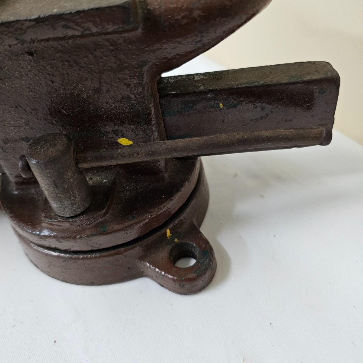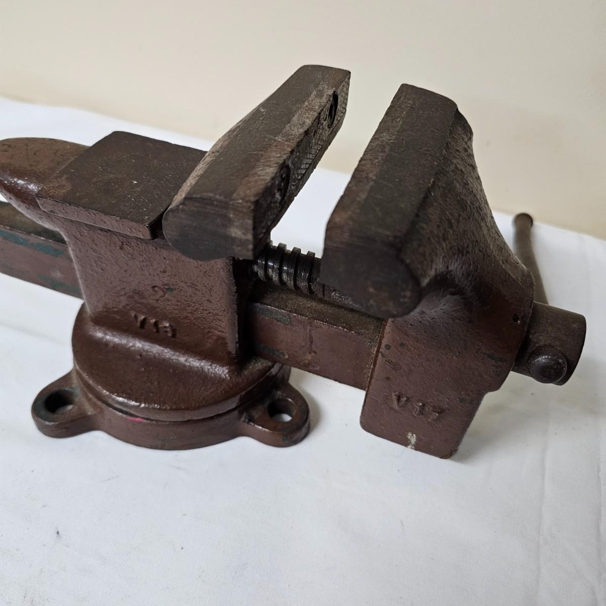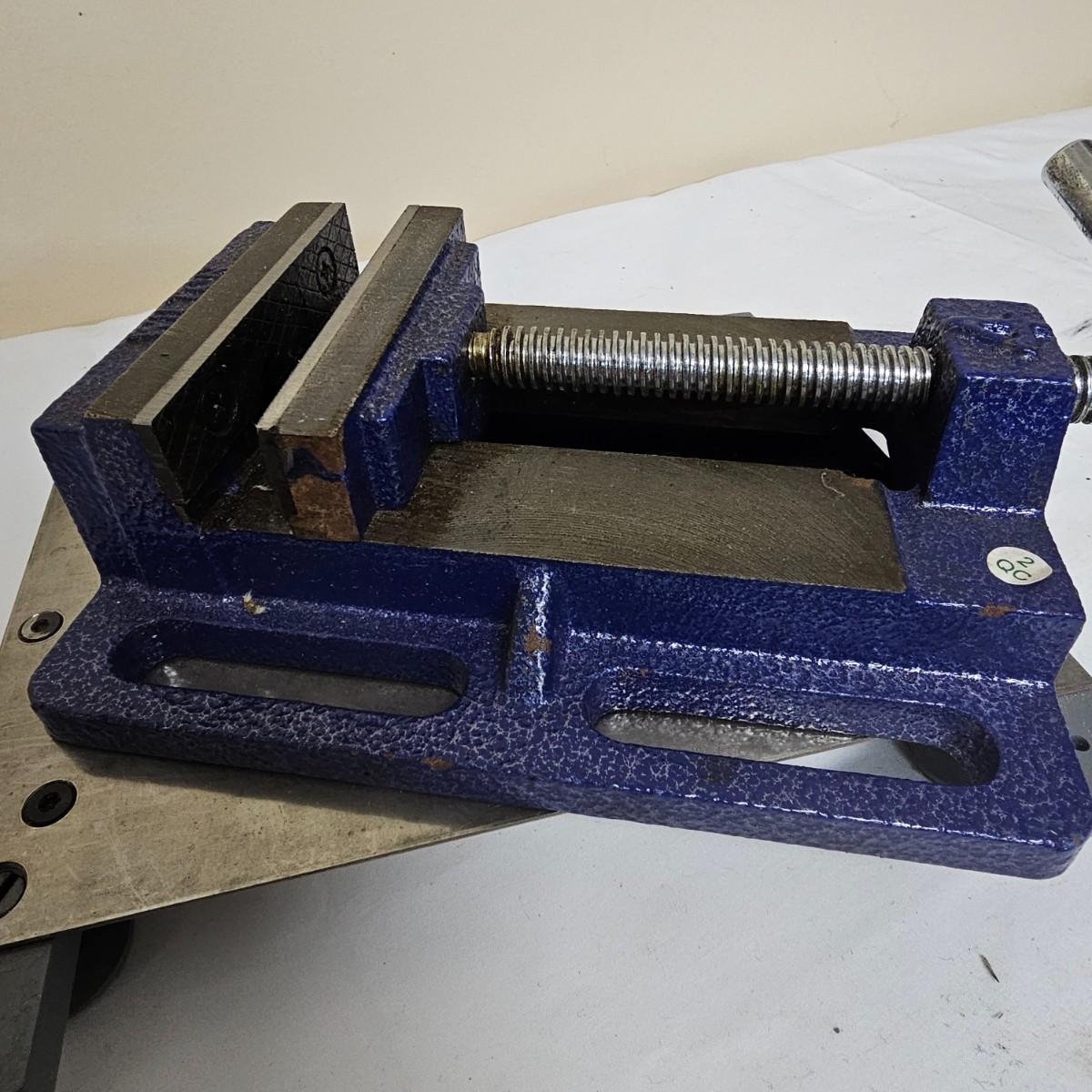 One Wilton flat vise for use on drill presses and other items that require a firm grip. Vise is 6" x 9" x 2.5"H, has 4" jaw. Other item is standard bench top swivel vise, measures 4" x 10" x 5"H, has 3.5" jaw. Also small stand that fits under Wilton item. See photos for details. Local pickup only.
