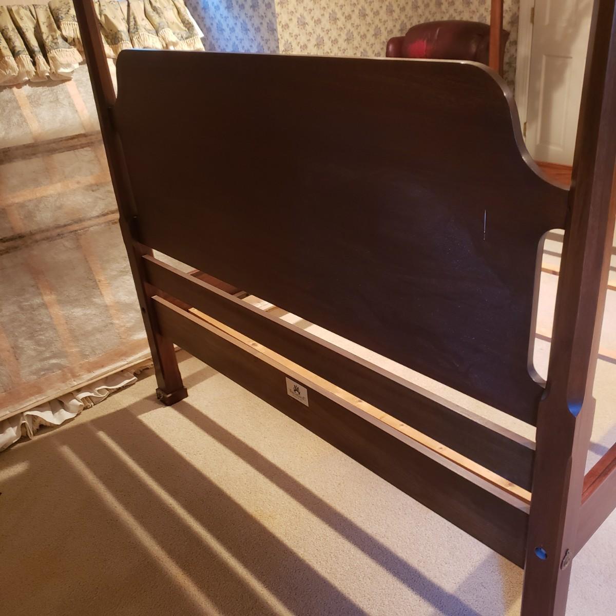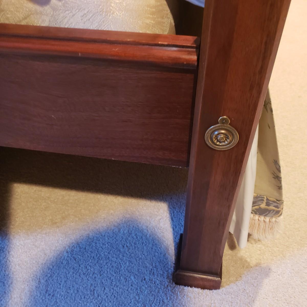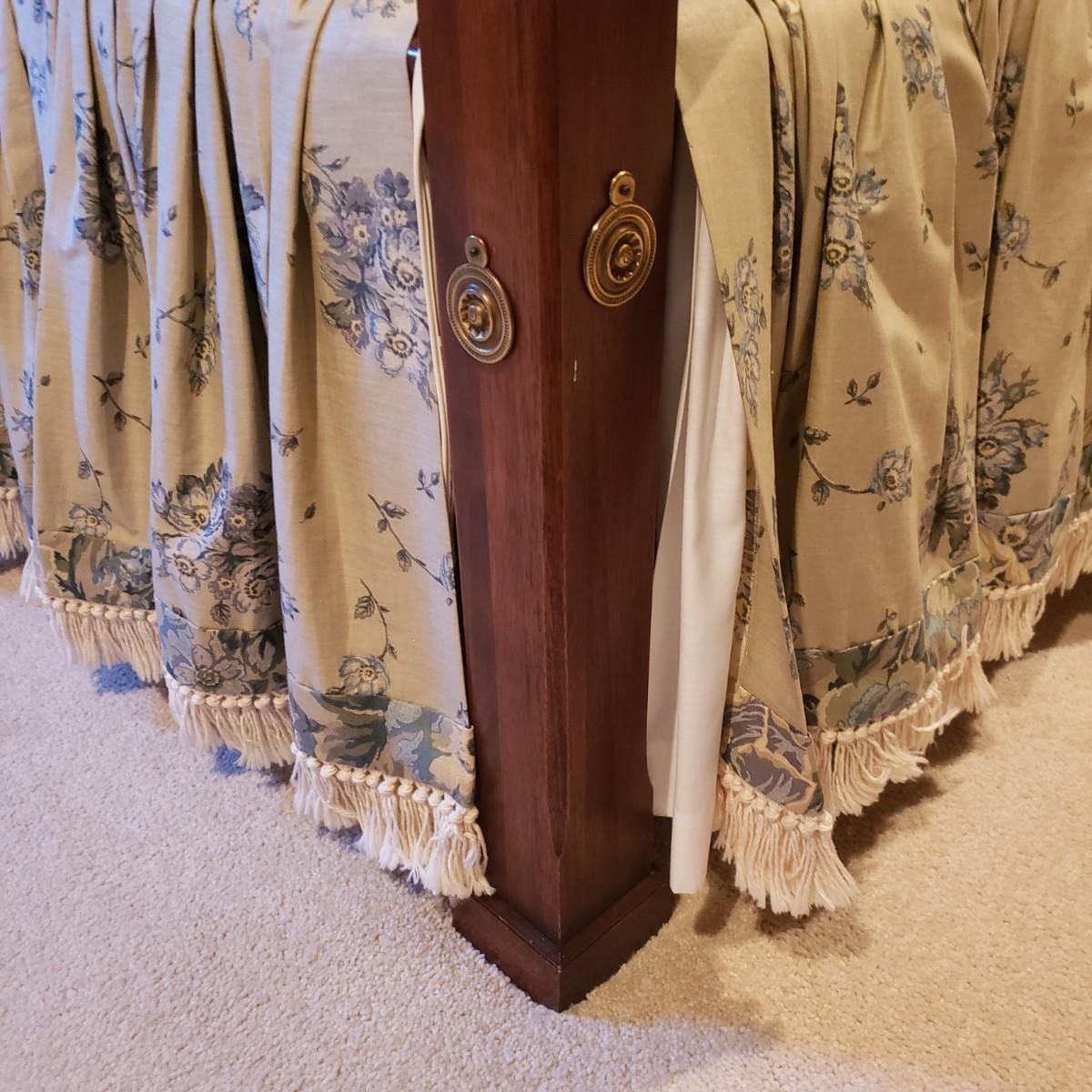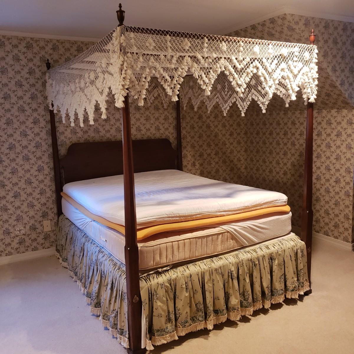 This wooden queen size canopy bed frame is made by Wiltshire of Winchester and measures 65" x 87" x 86" H. The bed comes apart with hexagon screws, see pictures. The top canopy is easily assembled with slats that just lift up. The cream canopy netting with tufted tassels is included, as well as the hand-sewn bed skirt which is sewn directly to the box spring.