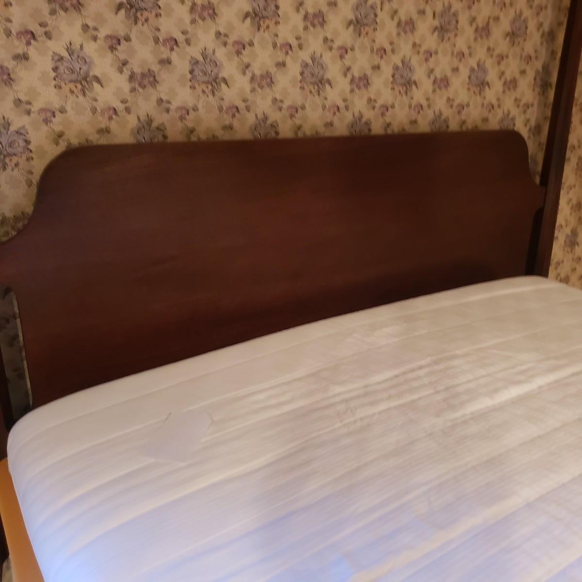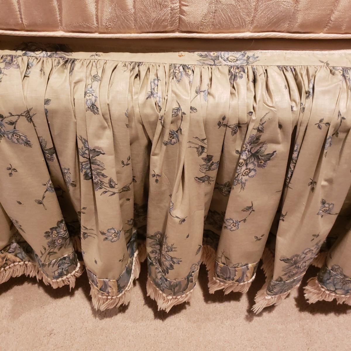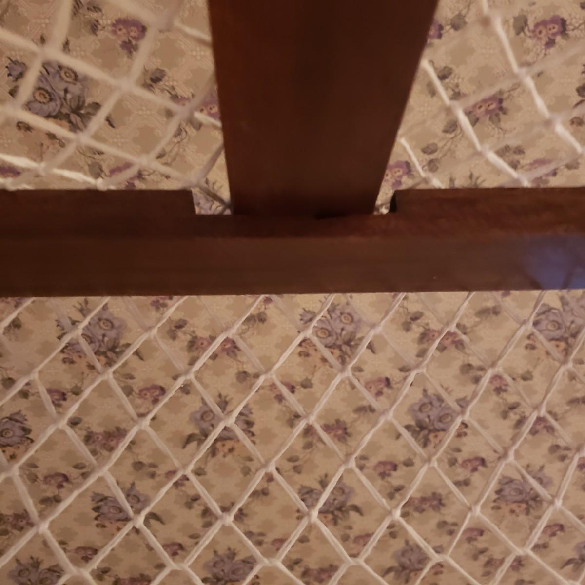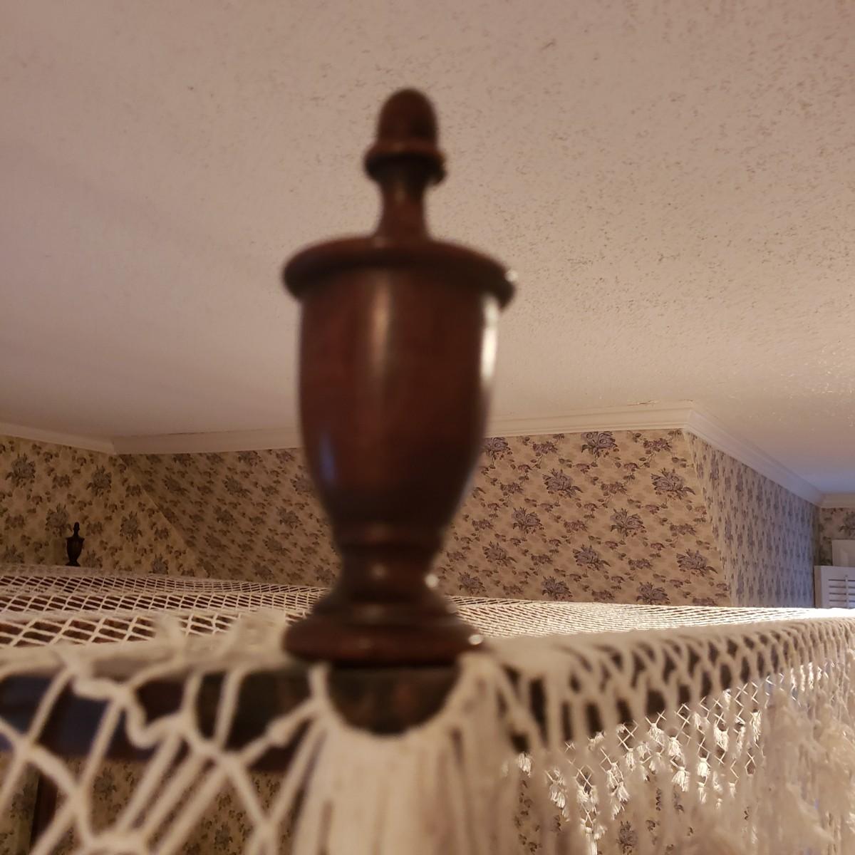 This wooden queen size canopy bed frame is made by Wiltshire of Winchester and measures 65" x 87" x 86" H. The bed comes apart with hexagon screws, see pictures. The top canopy is easily assembled with slats that just lift up. The cream canopy netting with tufted tassels is included, as well as the hand-sewn bed skirt which is sewn directly to the box spring.