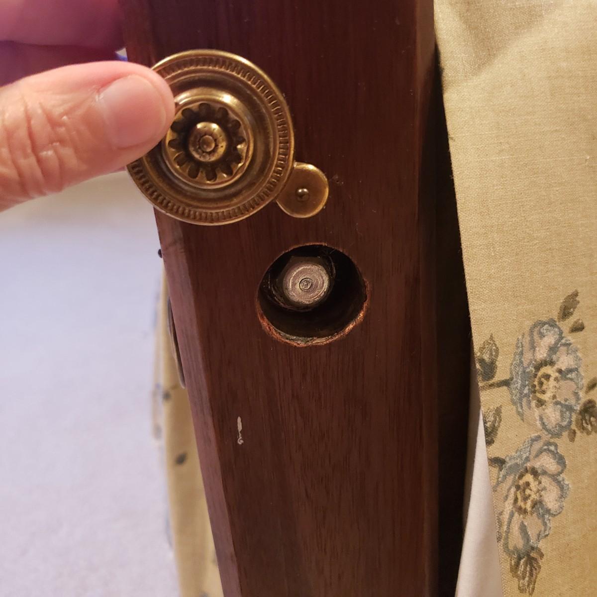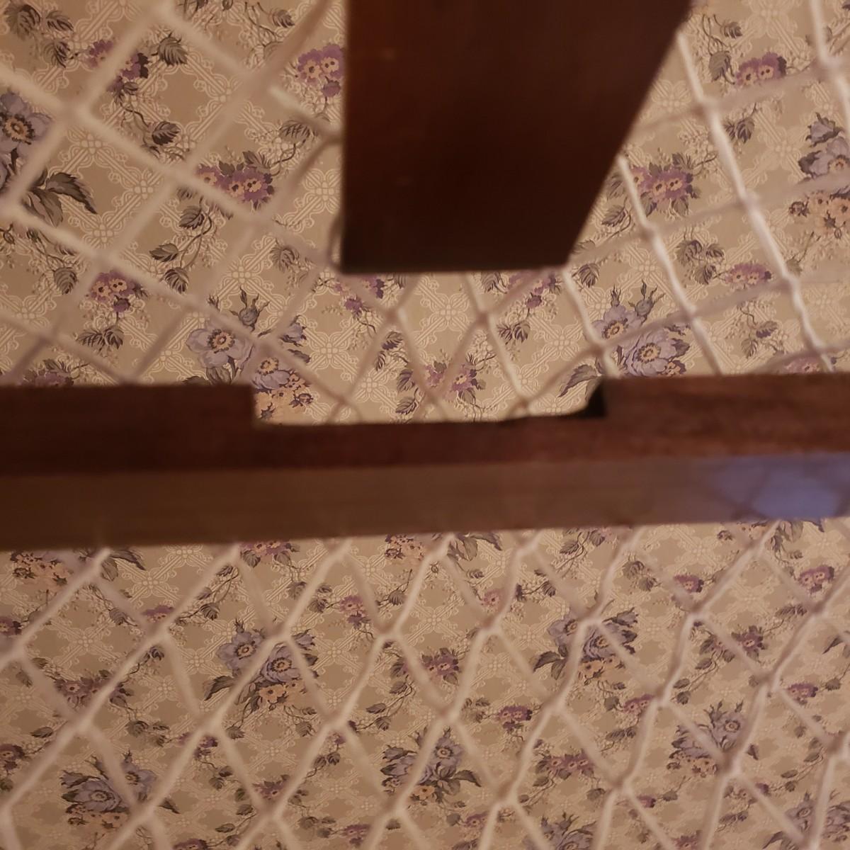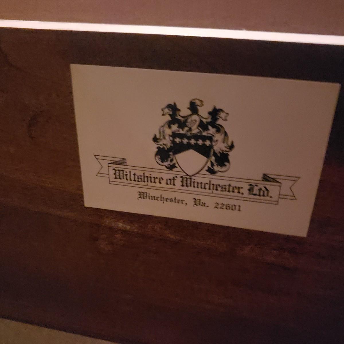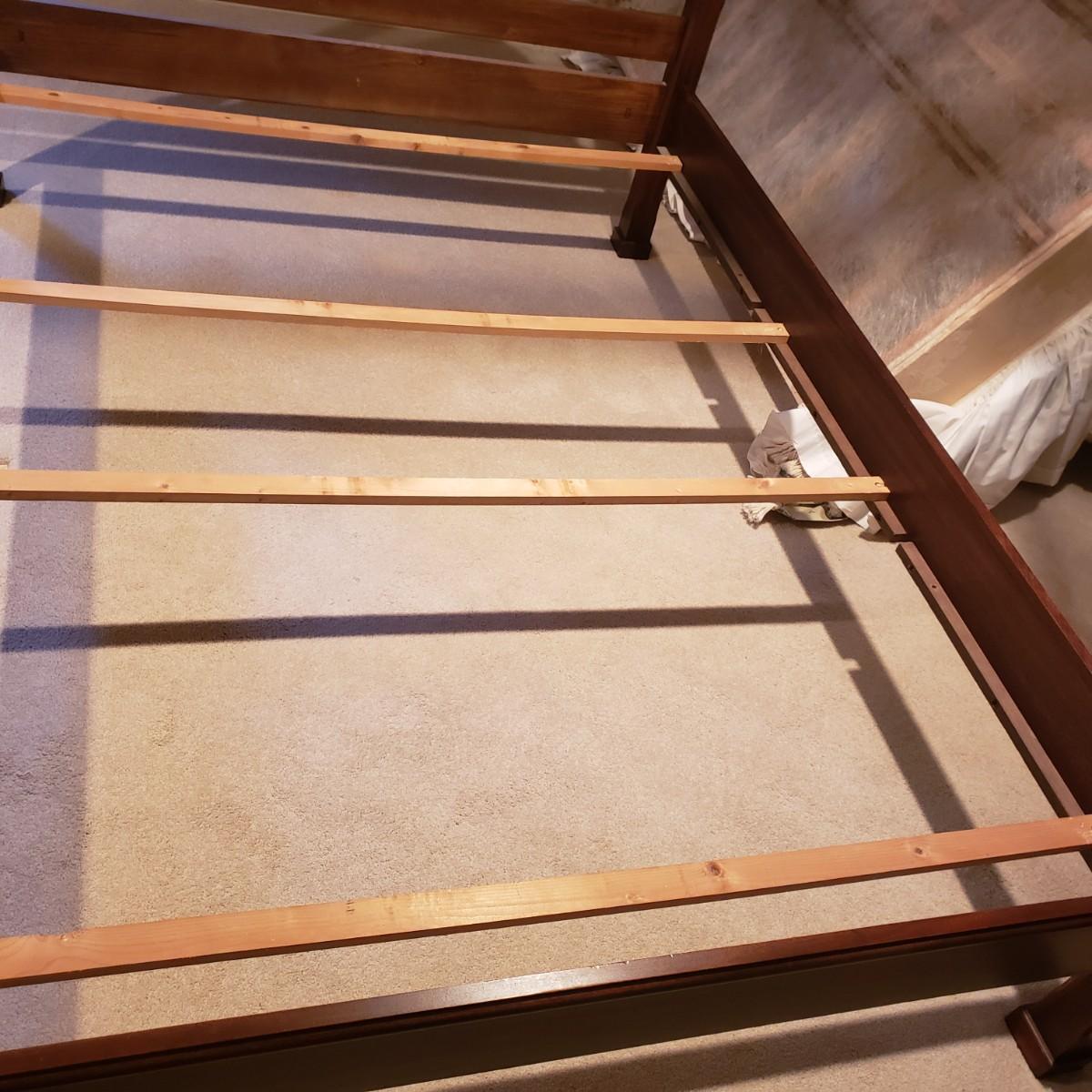 This wooden queen size canopy bed frame is made by Wiltshire of Winchester and measures 65" x 87" x 86" H. The bed comes apart with hexagon screws, see pictures. The top canopy is easily assembled with slats that just lift up. The cream canopy netting with tufted tassels is included, as well as the hand-sewn bed skirt which is sewn directly to the box spring.