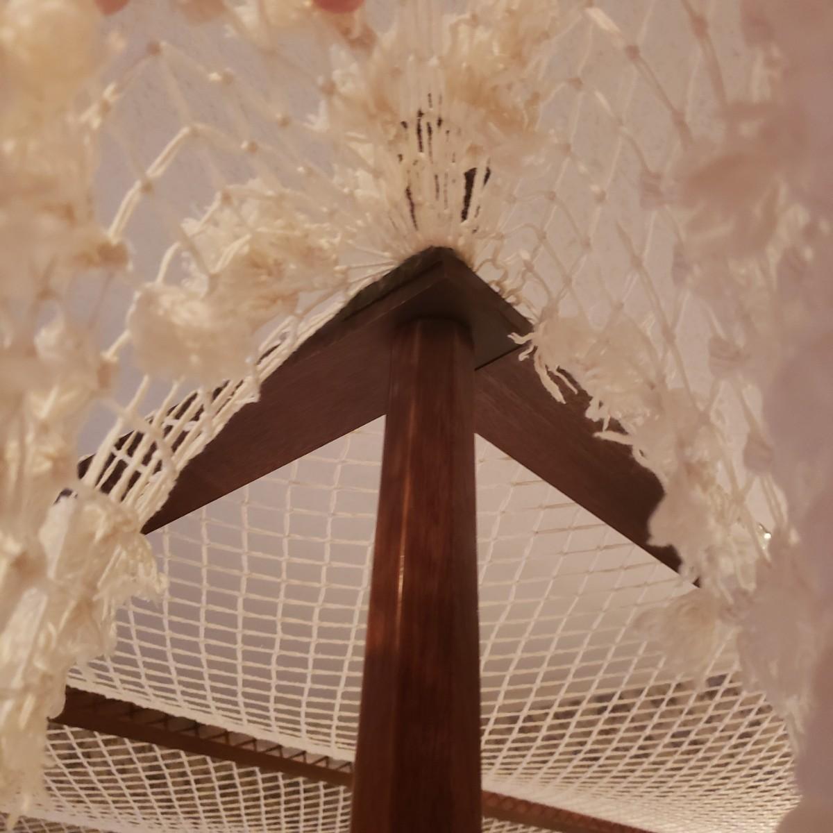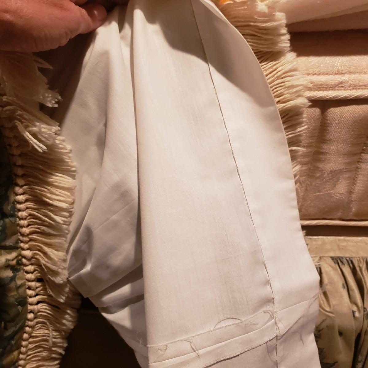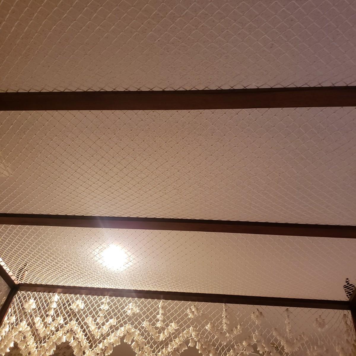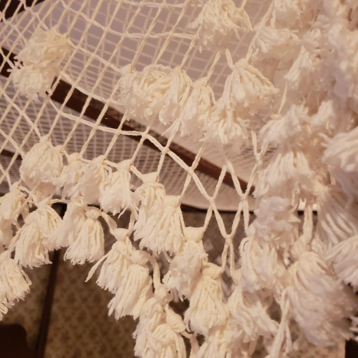 This wooden queen size canopy bed frame is made by Wiltshire of Winchester and measures 65" x 87" x 86" H. The bed comes apart with hexagon screws, see pictures. The top canopy is easily assembled with slats that just lift up. The cream canopy netting with tufted tassels is included, as well as the hand-sewn bed skirt which is sewn directly to the box spring.