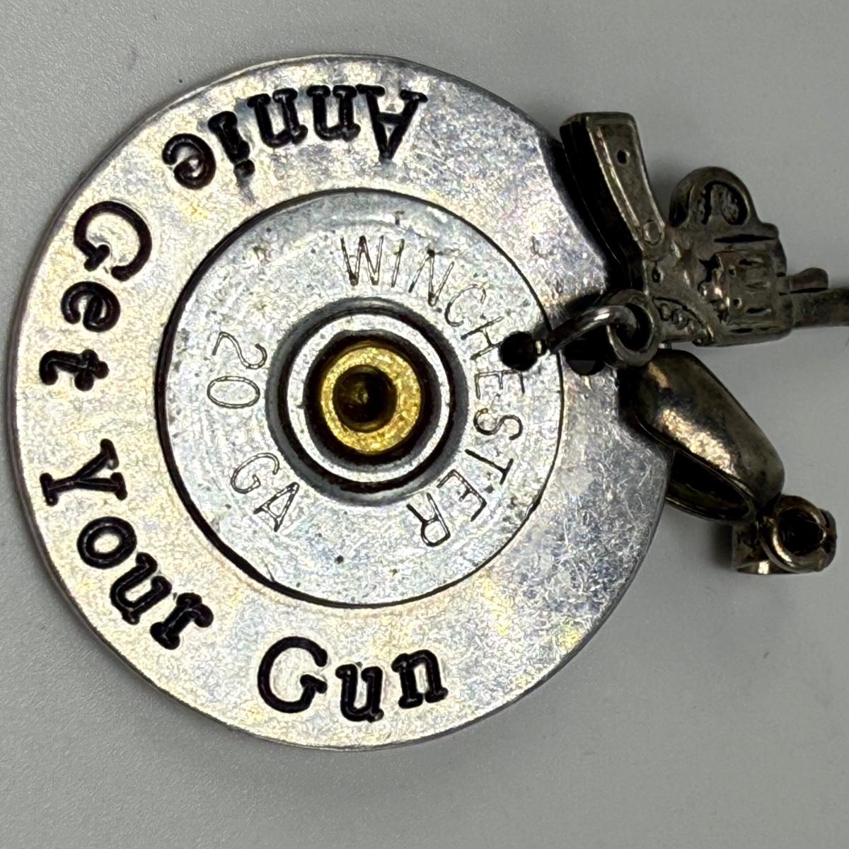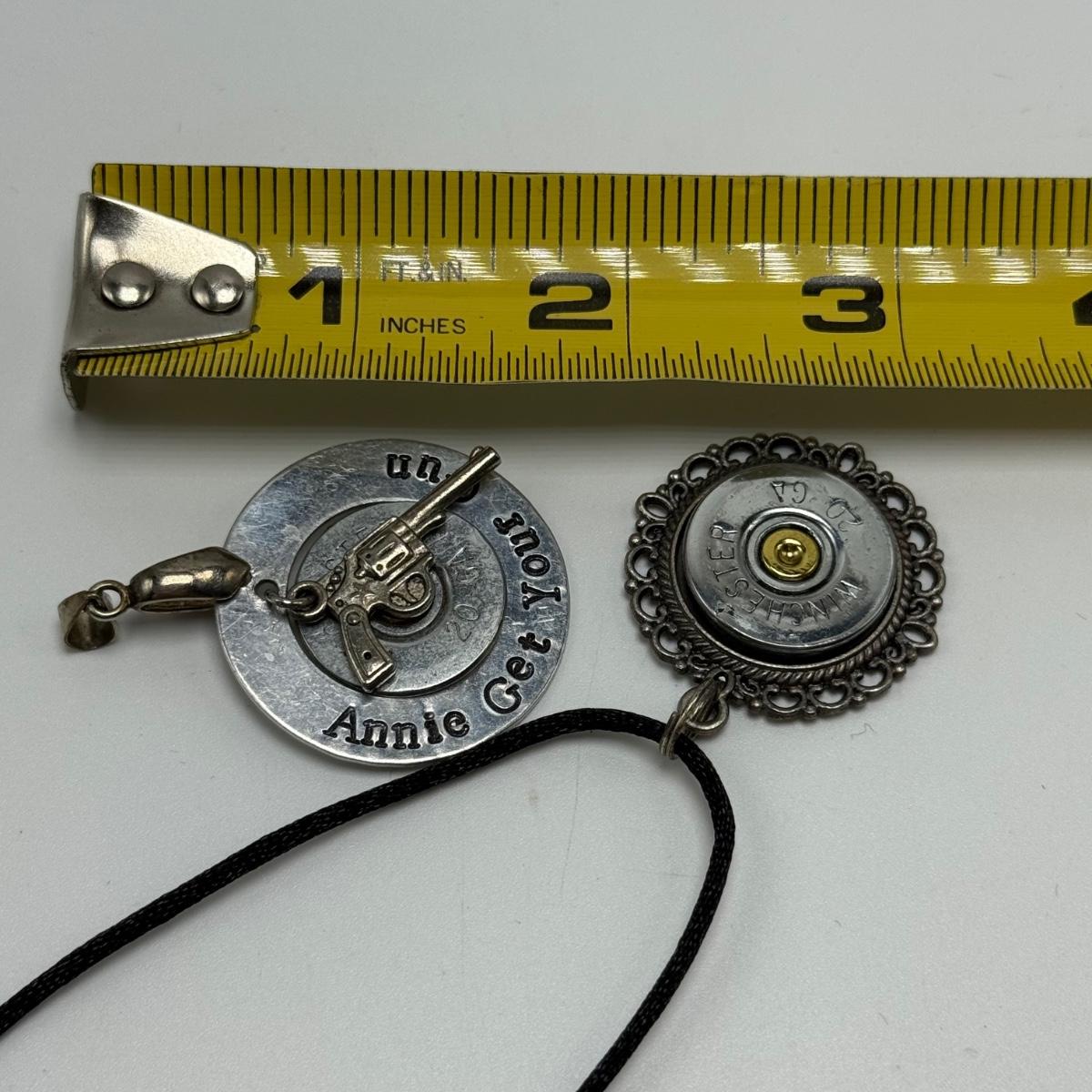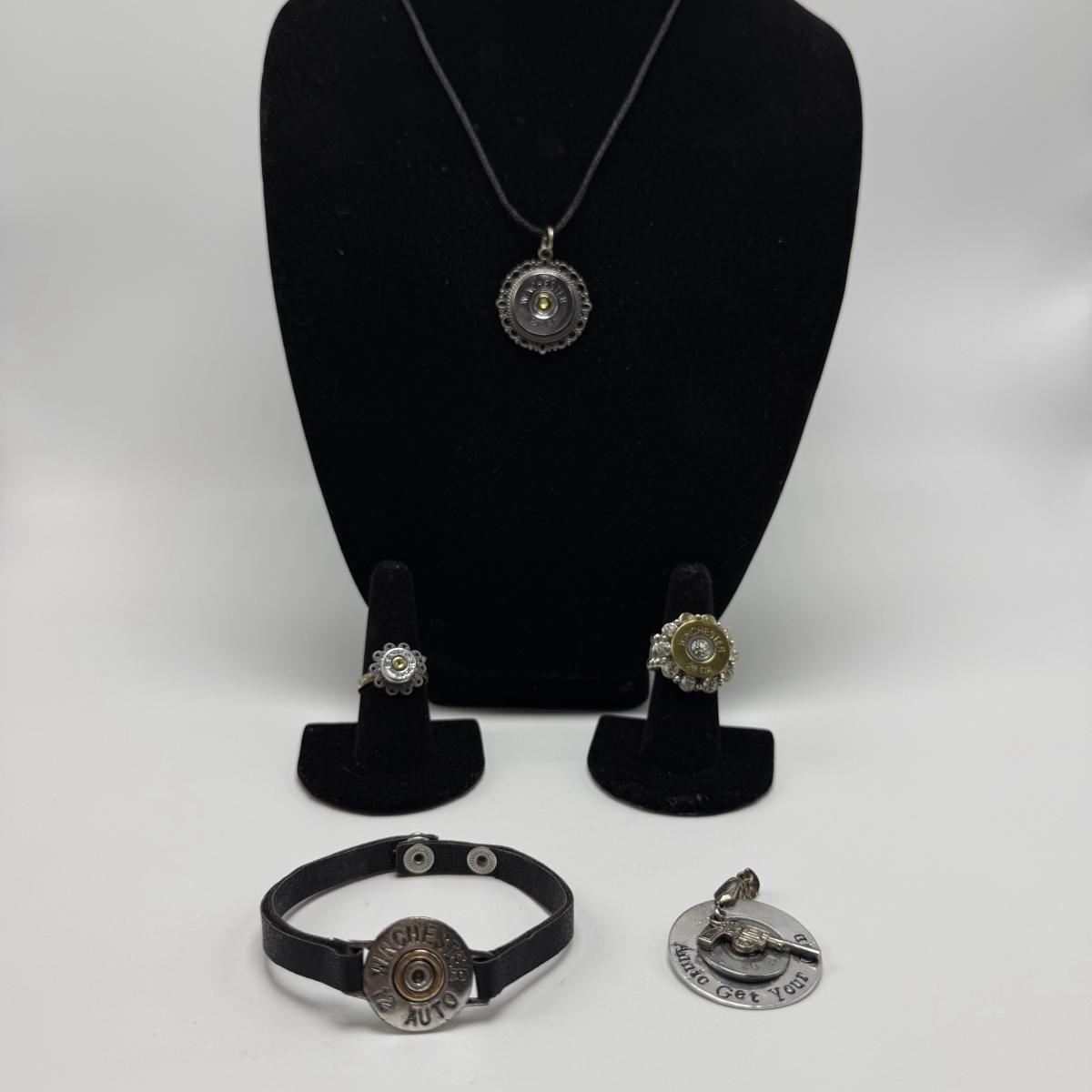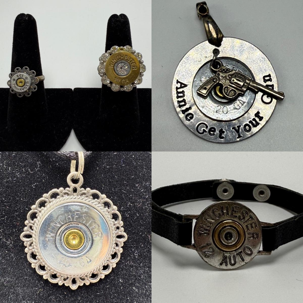 A variety of jewelry items made from Winchester and Luger bullets. Included are: one pendant on a fabric cord, two rings, a bracelet with a black leather strap, and a loose pendant that says “Annie Get Your Gun”.