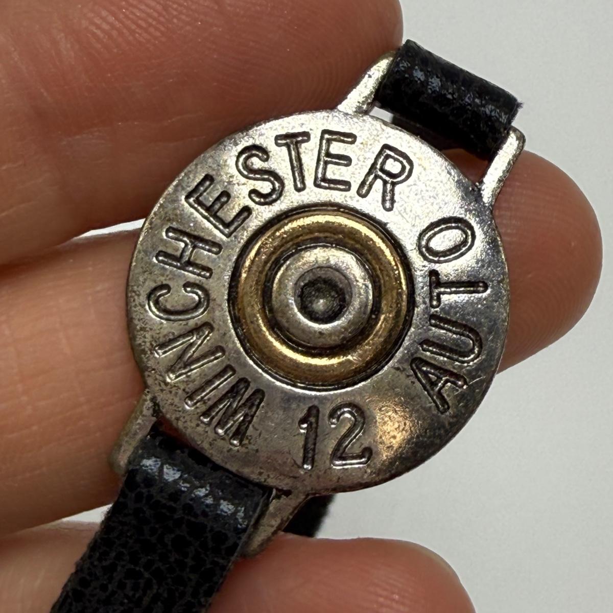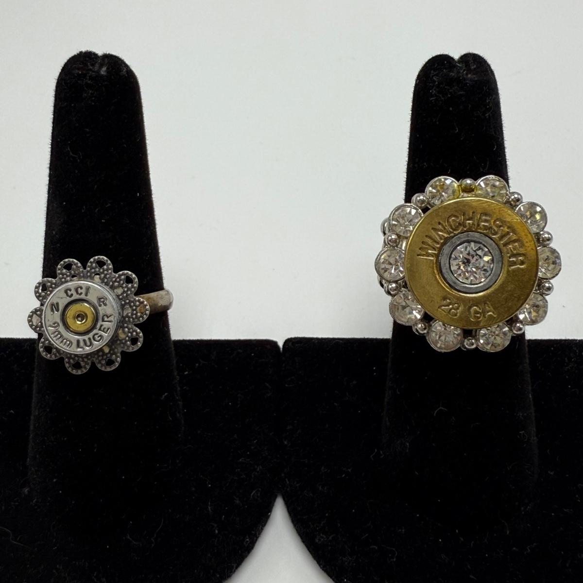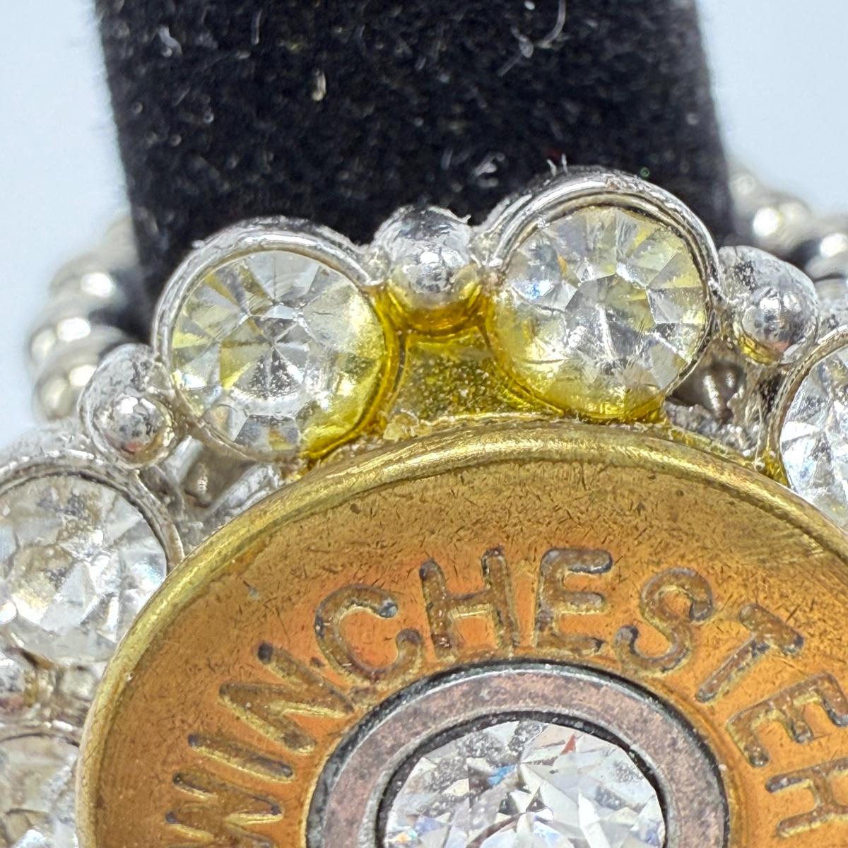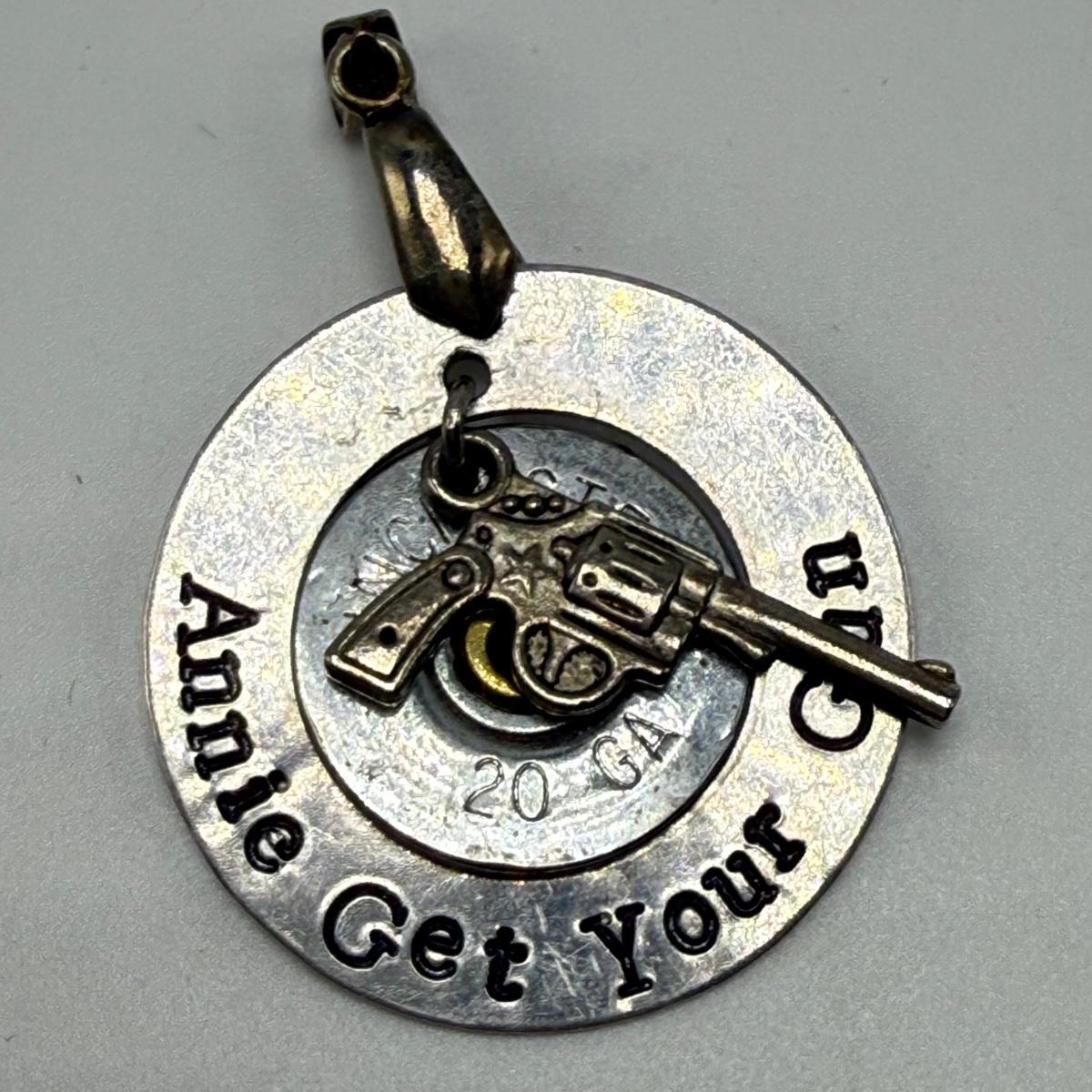 A variety of jewelry items made from Winchester and Luger bullets. Included are: one pendant on a fabric cord, two rings, a bracelet with a black leather strap, and a loose pendant that says “Annie Get Your Gun”.