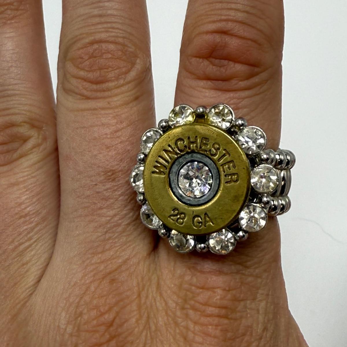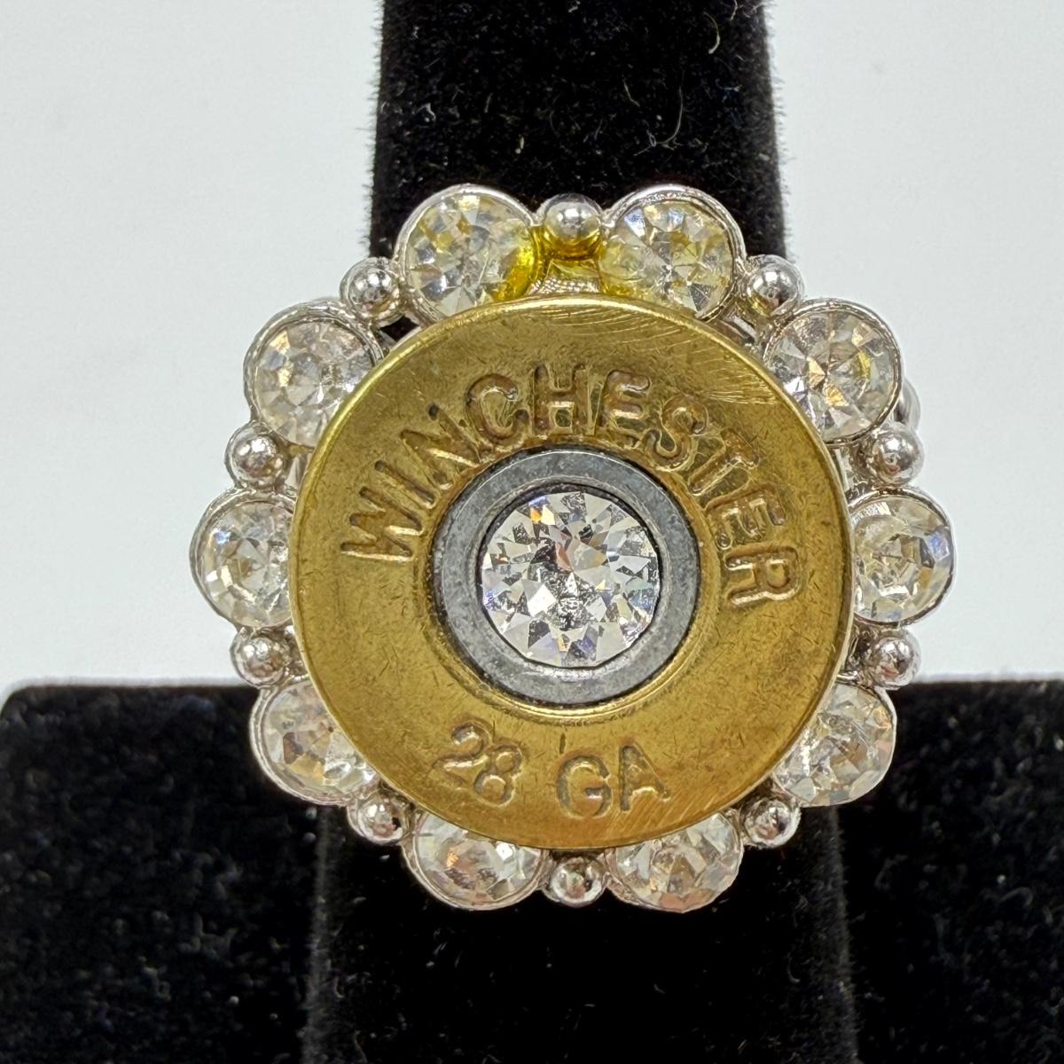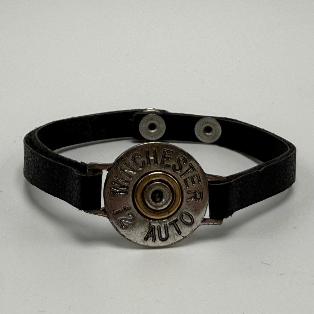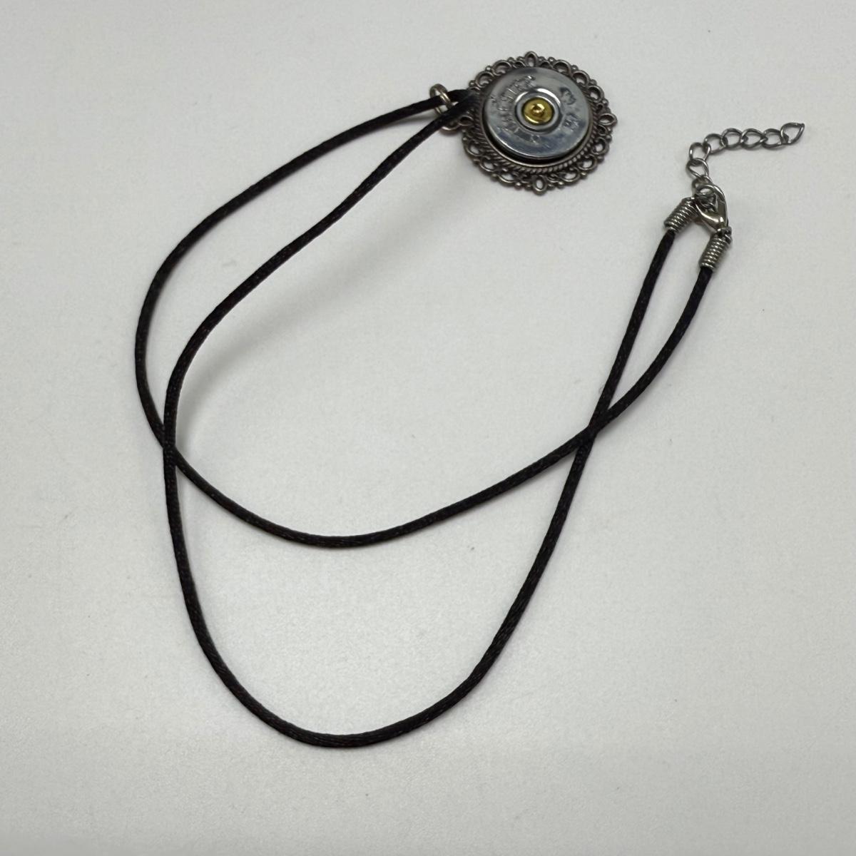 A variety of jewelry items made from Winchester and Luger bullets. Included are: one pendant on a fabric cord, two rings, a bracelet with a black leather strap, and a loose pendant that says “Annie Get Your Gun”.