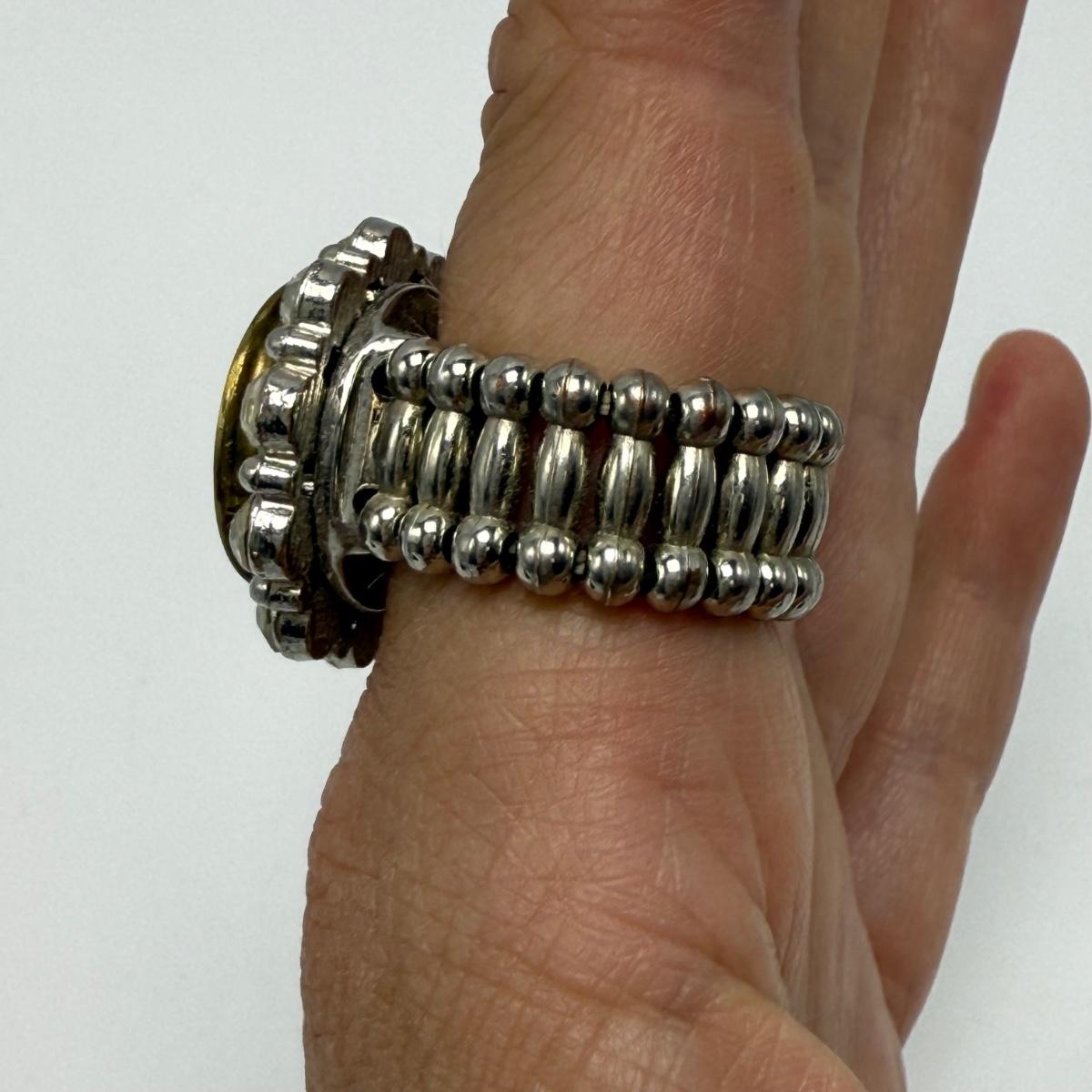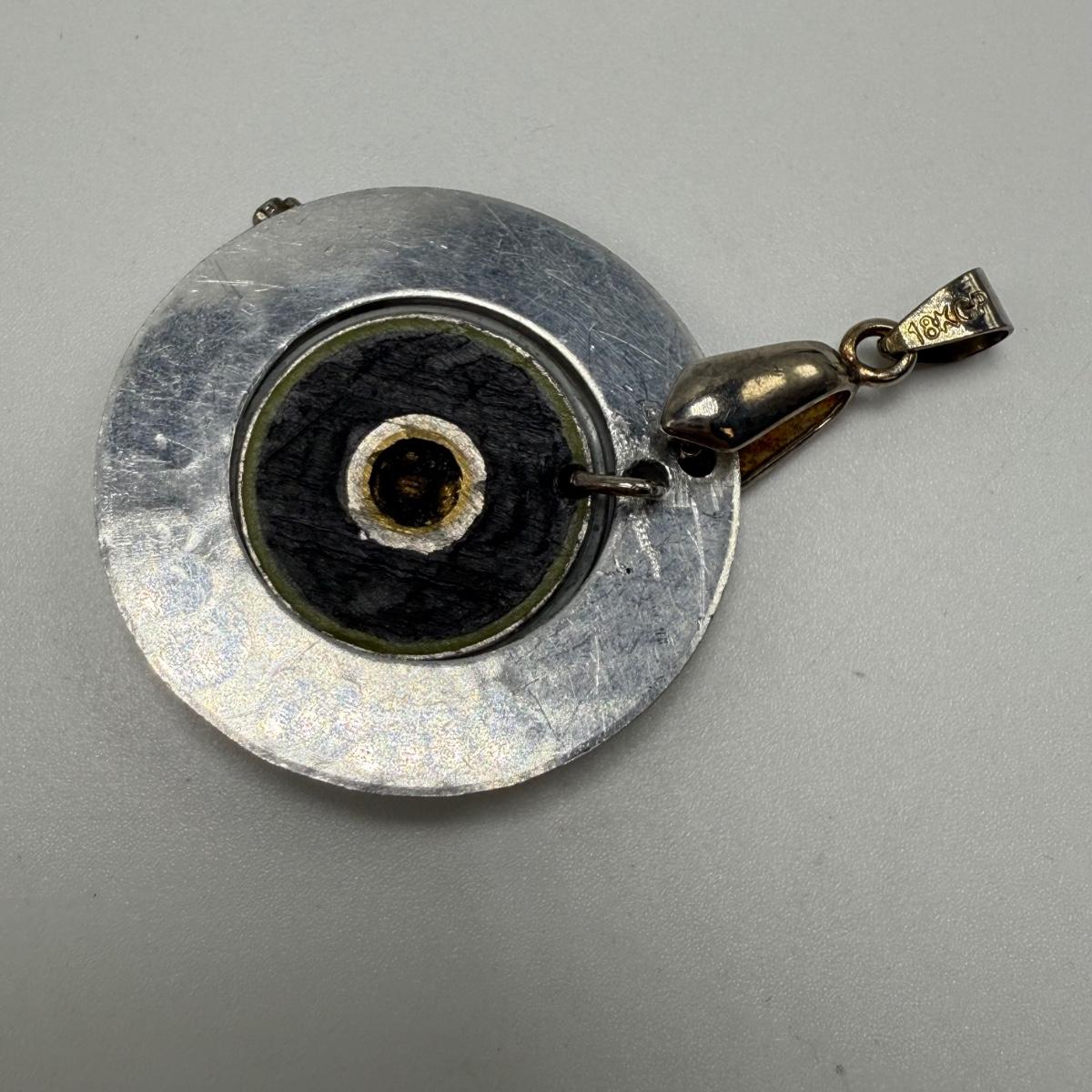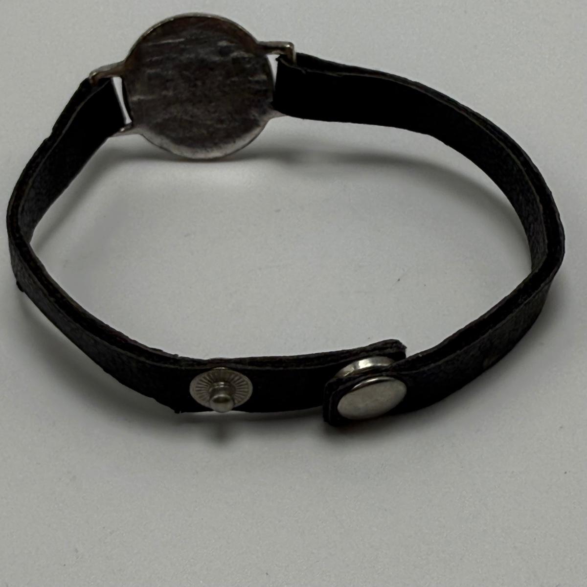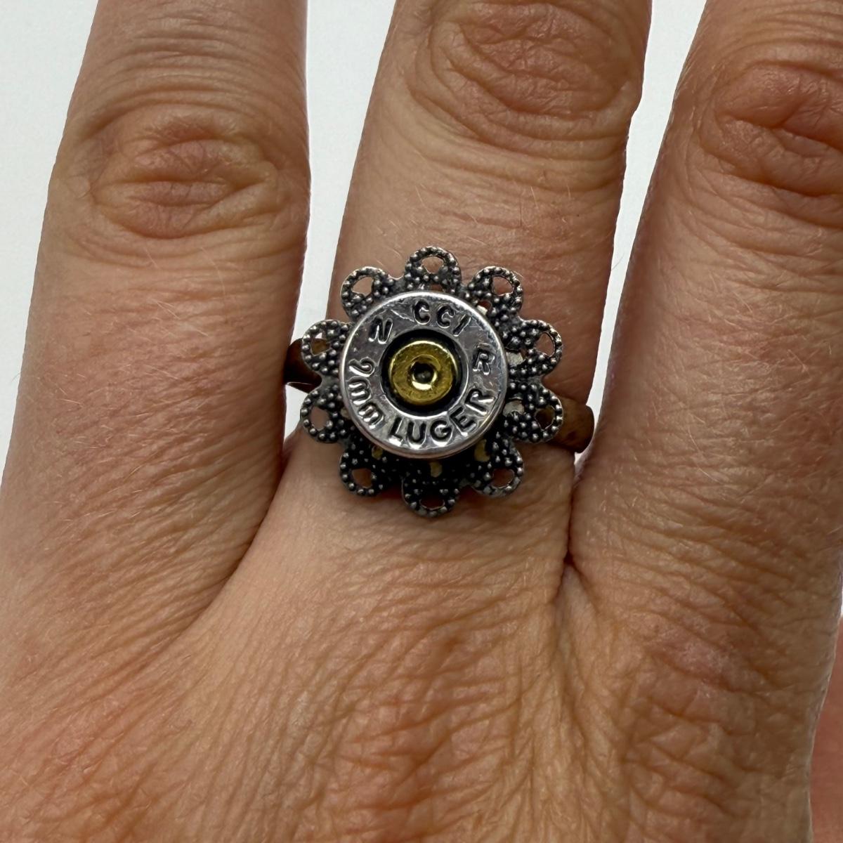 A variety of jewelry items made from Winchester and Luger bullets. Included are: one pendant on a fabric cord, two rings, a bracelet with a black leather strap, and a loose pendant that says “Annie Get Your Gun”.