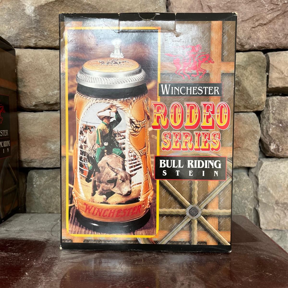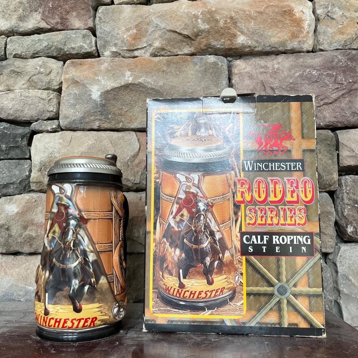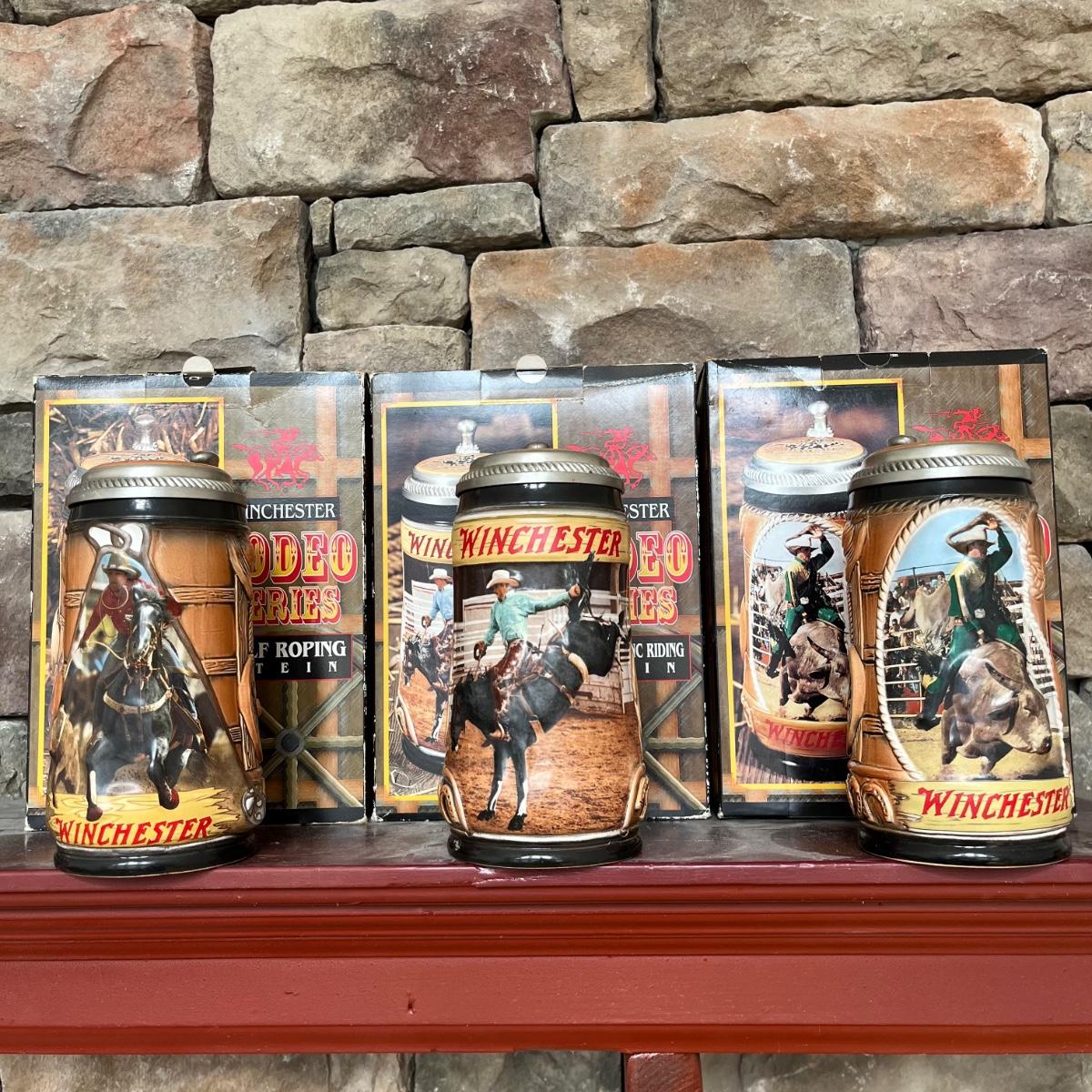 Lot contains three Winchester Rodeo Series steins with boxes including Calf Roping, Bull Riding and Saddle Bronc Riding. Calf Toping stein has had handle repaired, see pictures. Steins measure 4” x 5.5” x 8”.