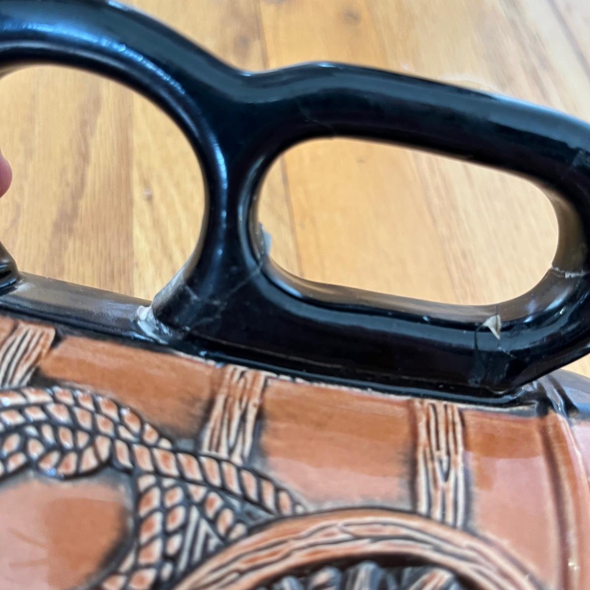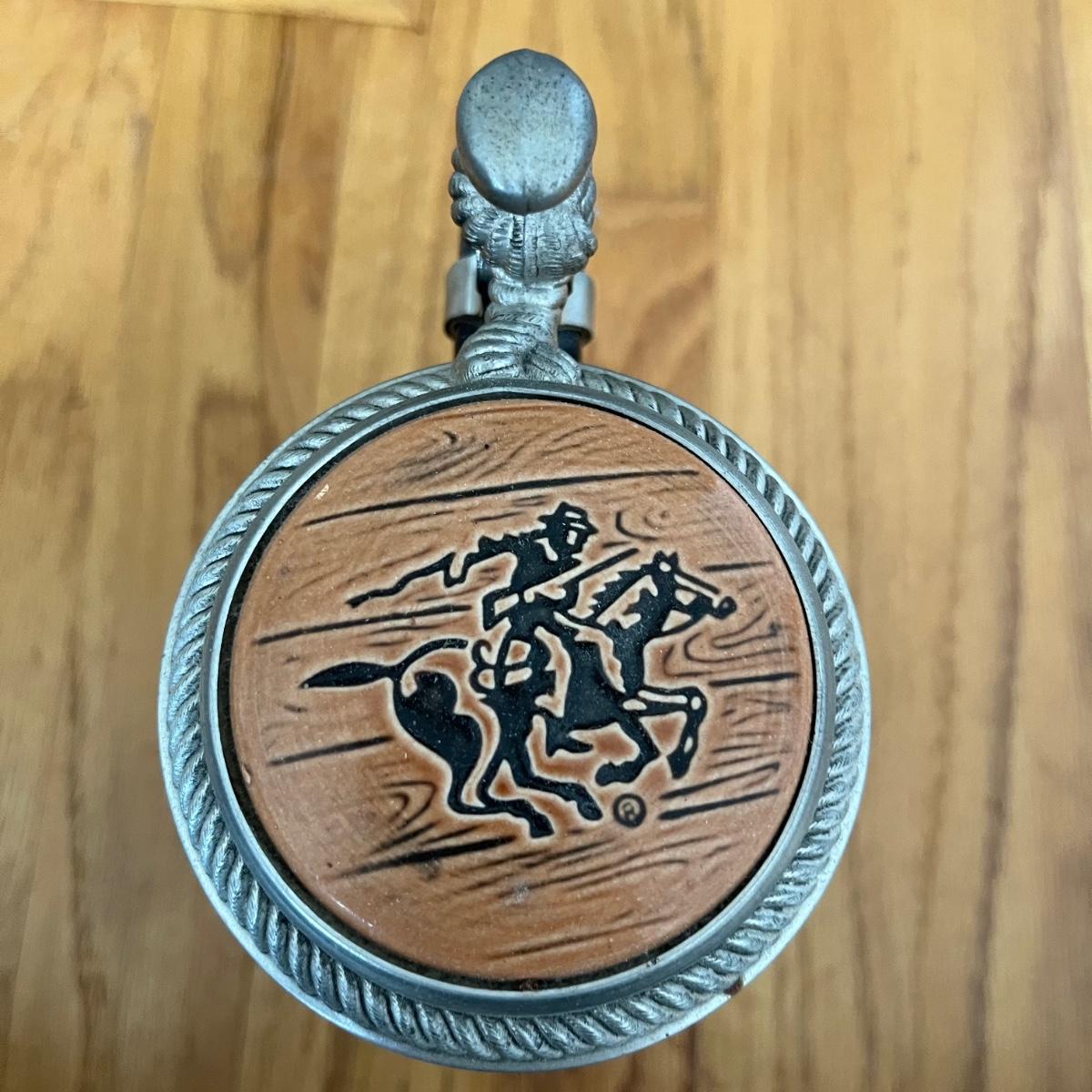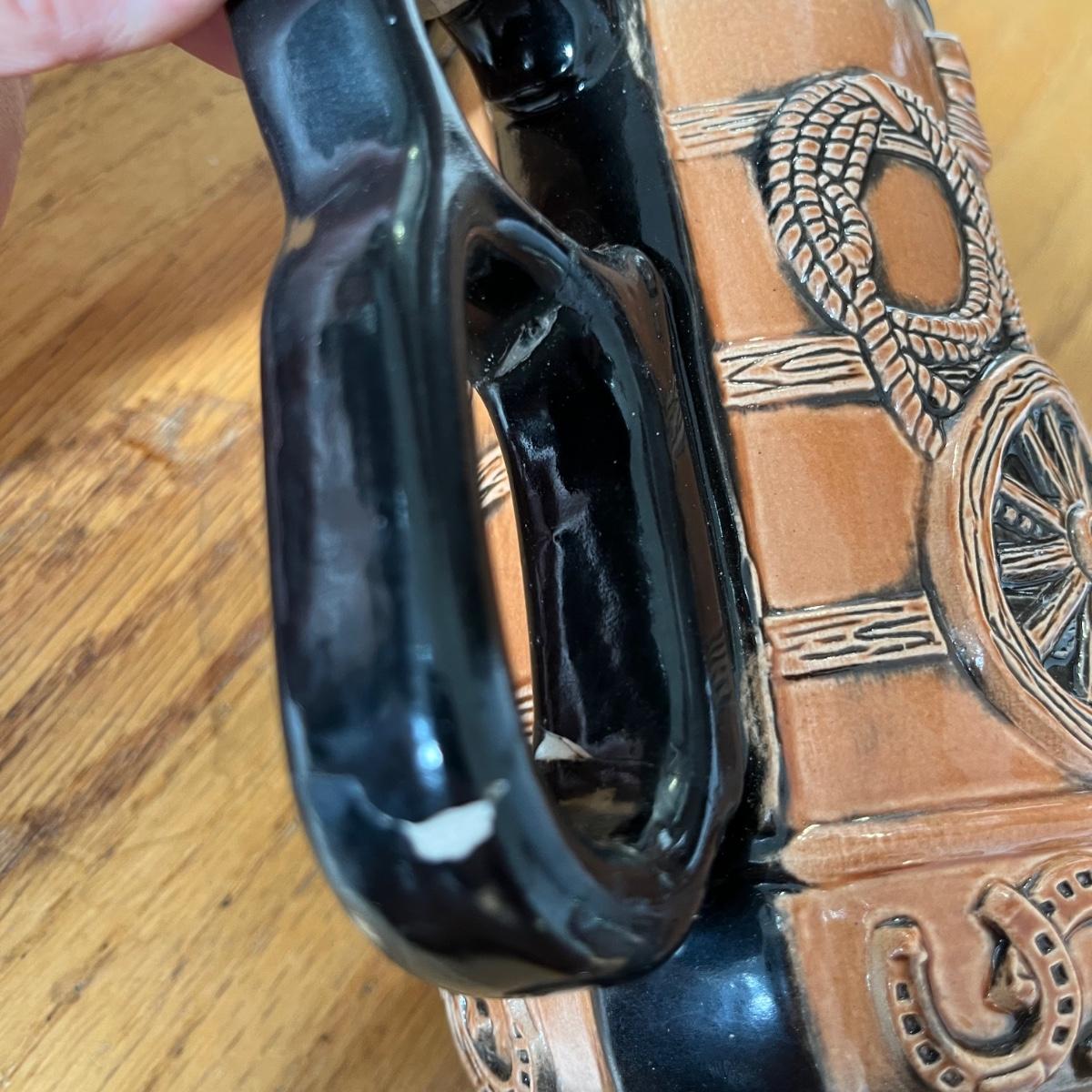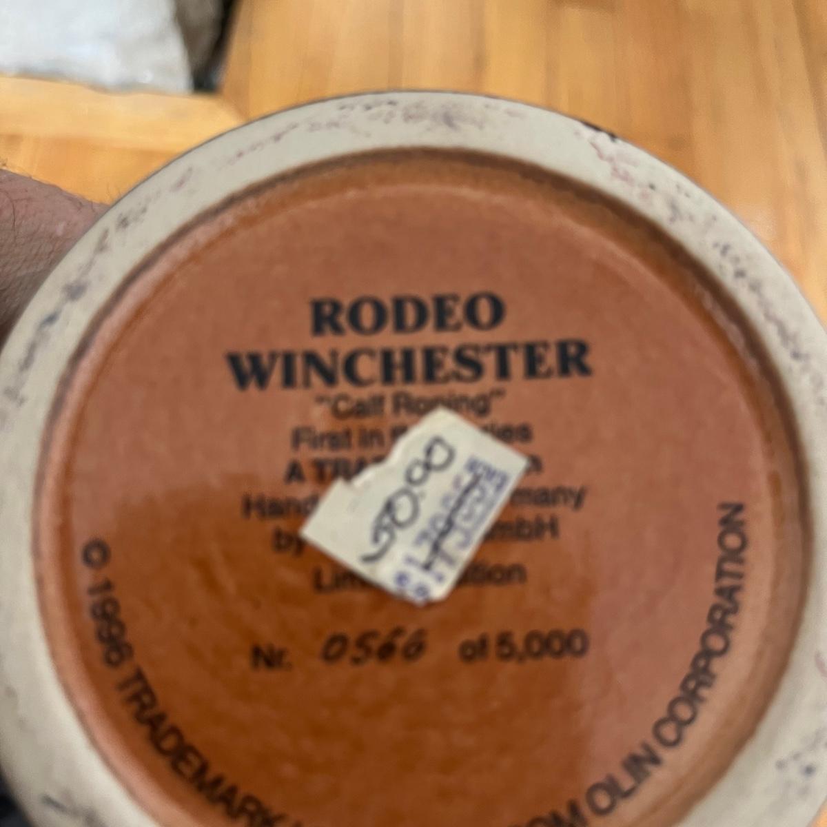 Lot contains three Winchester Rodeo Series steins with boxes including Calf Roping, Bull Riding and Saddle Bronc Riding. Calf Toping stein has had handle repaired, see pictures. Steins measure 4” x 5.5” x 8”.
