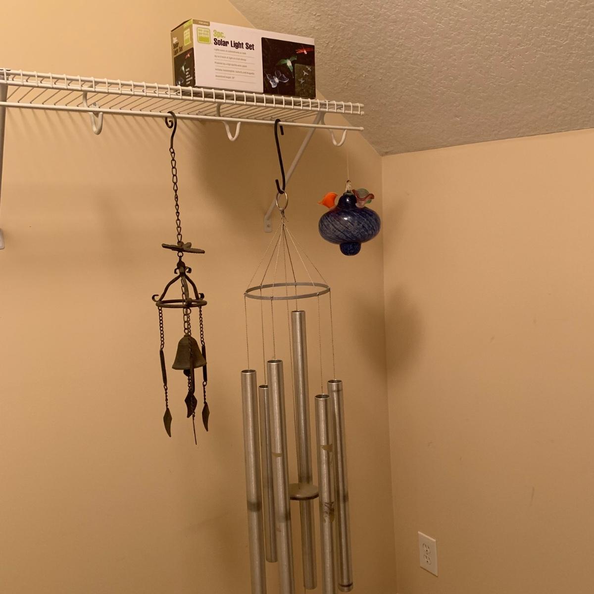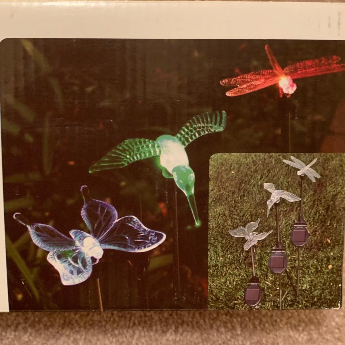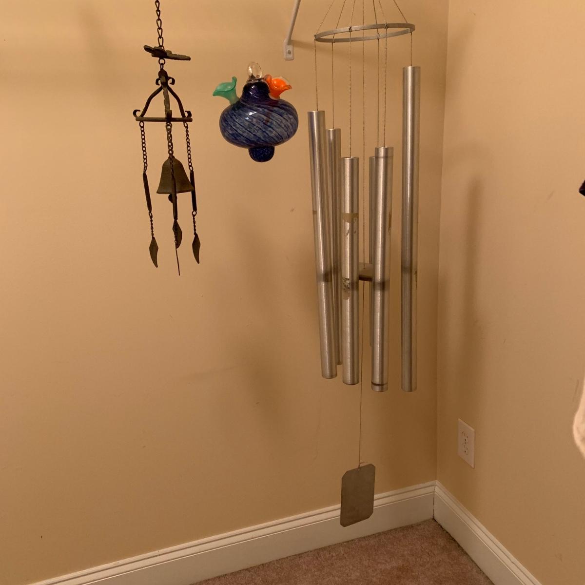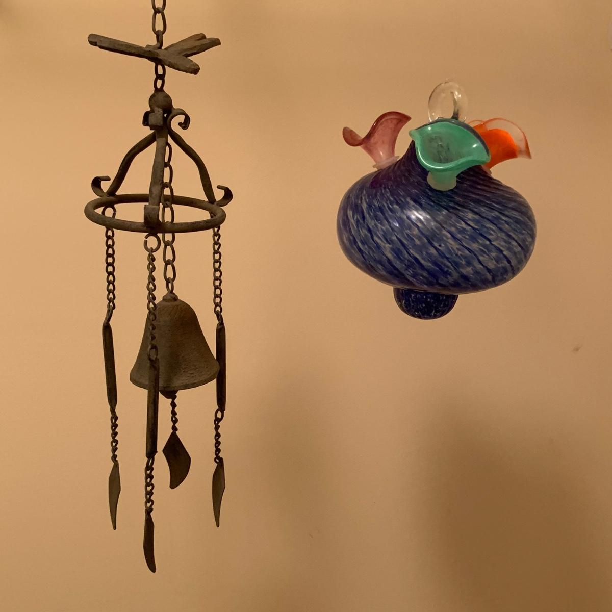 This collection of garden decor includes two wind chimes, one glass hummingbird feeder, and a set of three solar lights that are new in their original box. The smaller wind chime appears to be iron and makes a lighter higher pitched sound. The “Island Melody” wind chime has a lovely low toned sound that is reminiscent of a gong. This one from the hook to the bottom of the lowest metal label is 54” long. It has some tape residue on its metal tubes. The hummingbird feeder has a small chip on its glass orange flower rim.