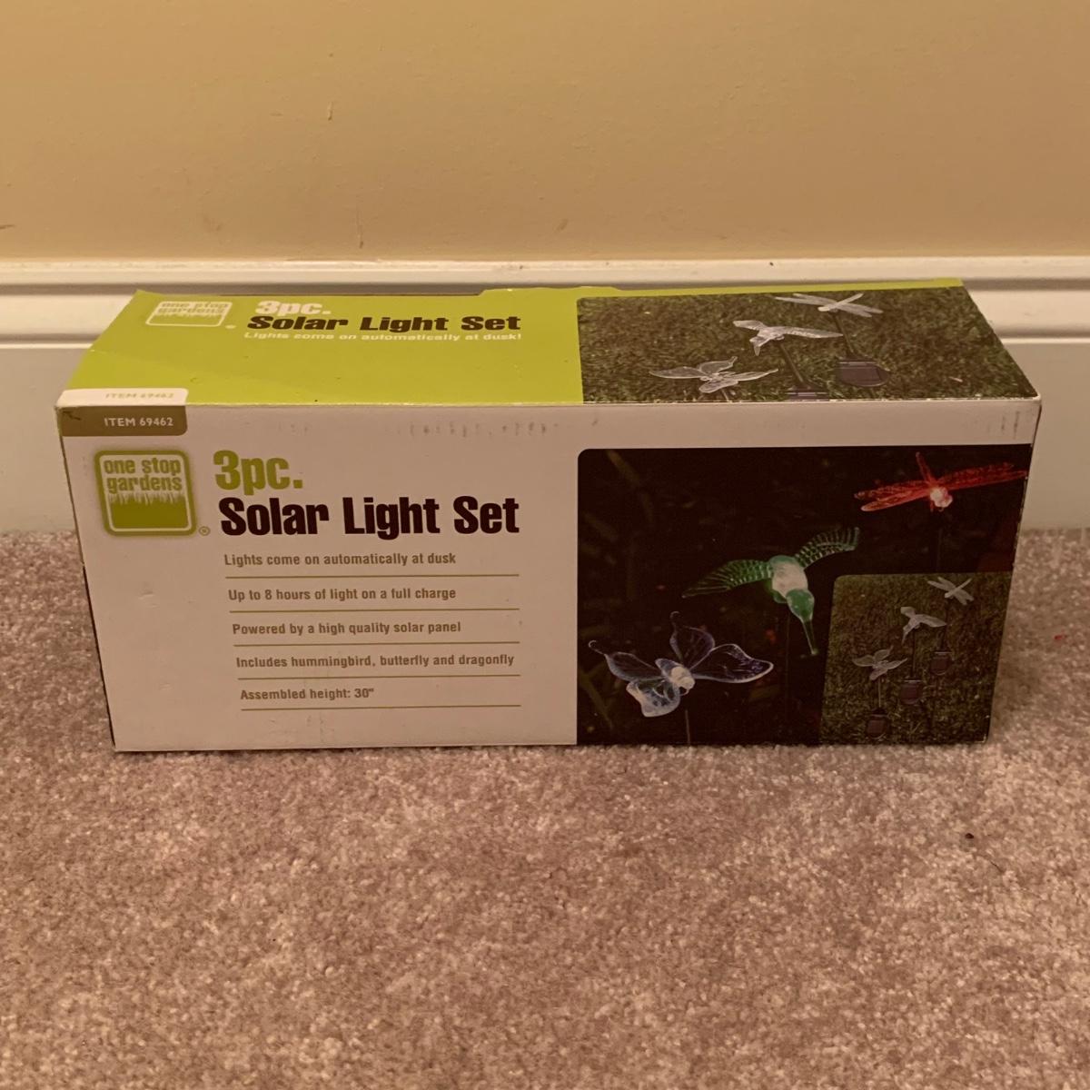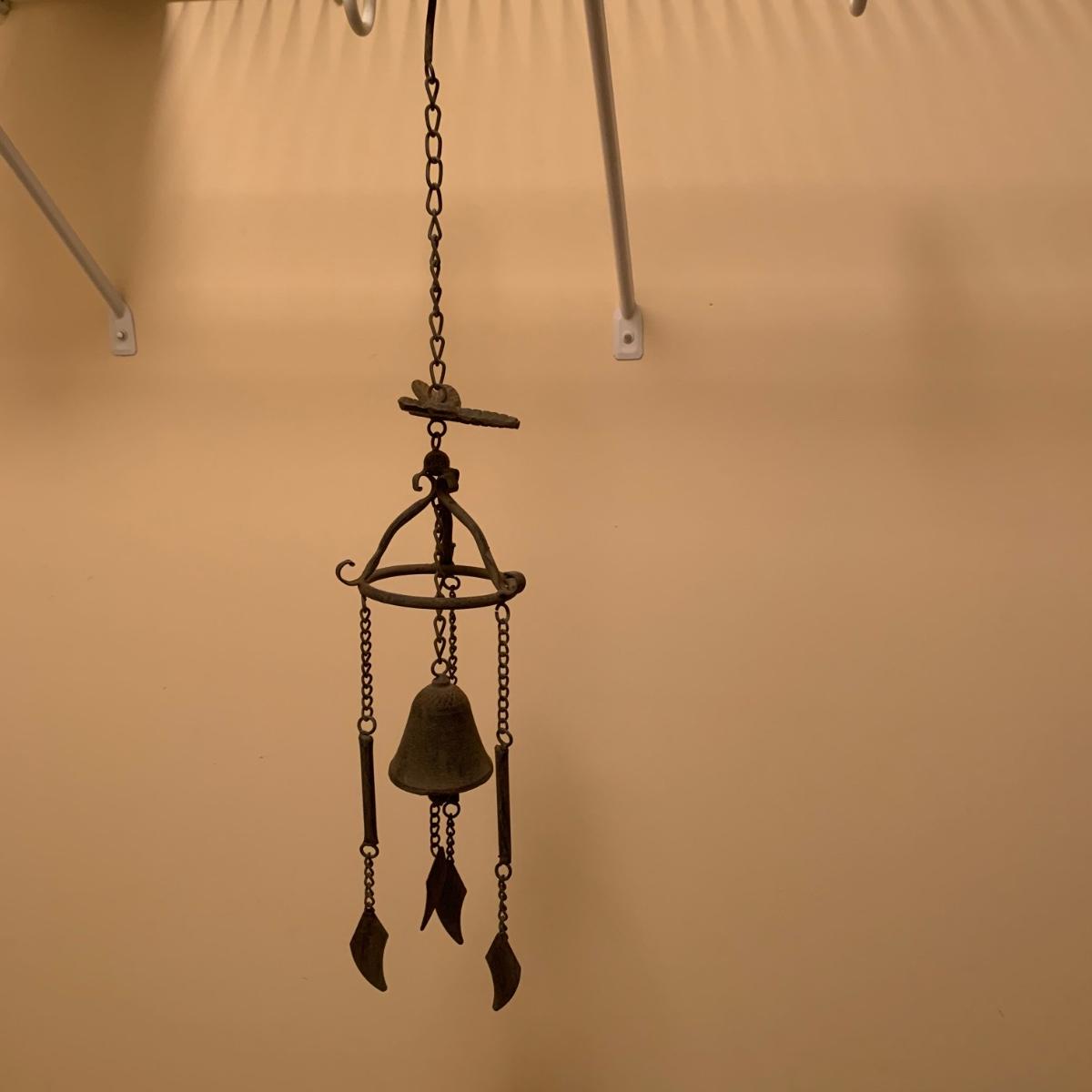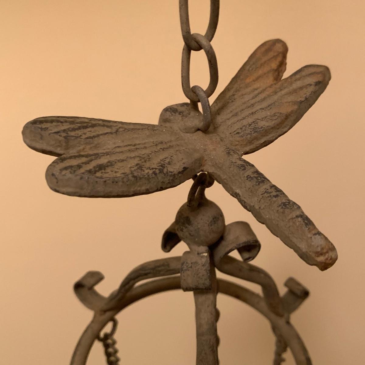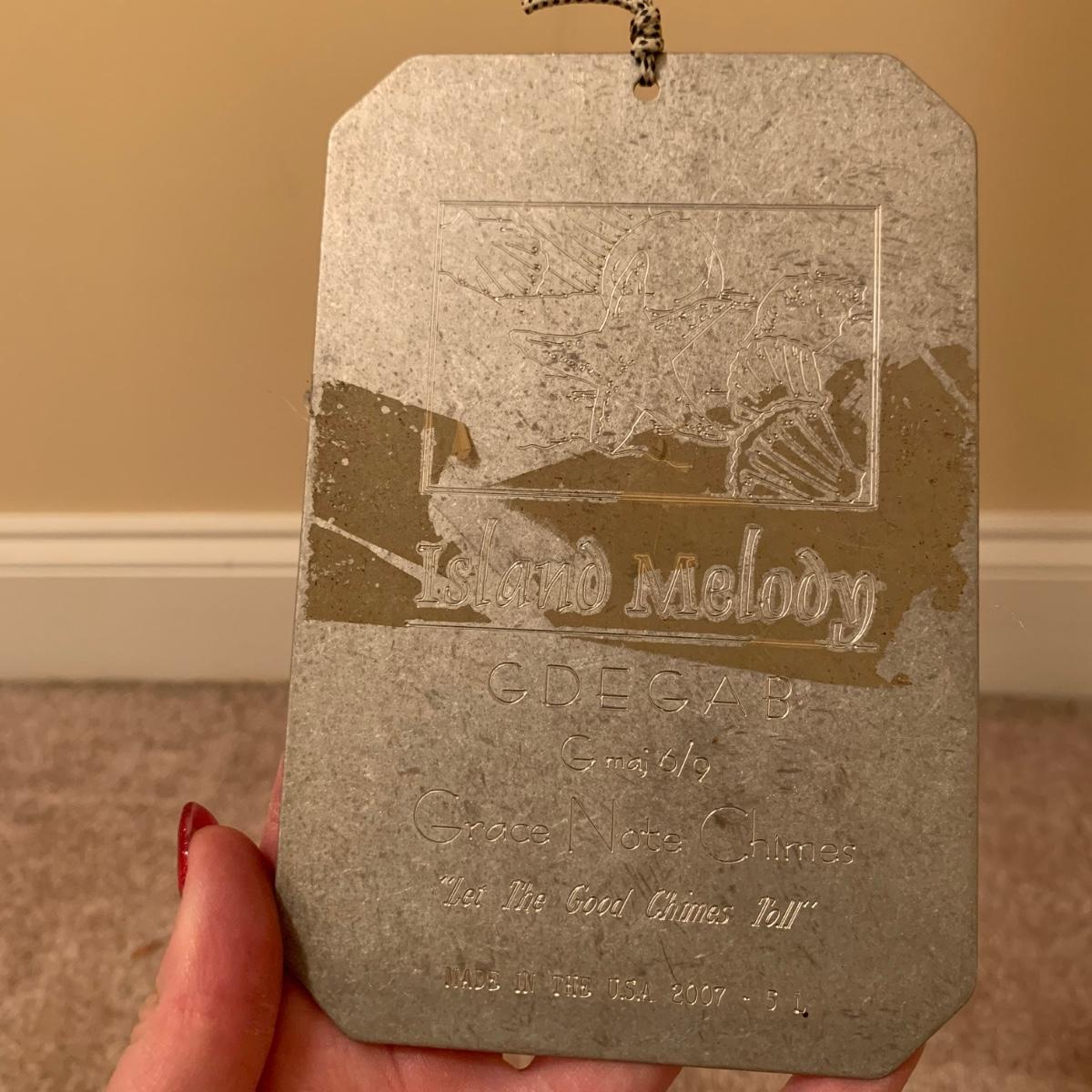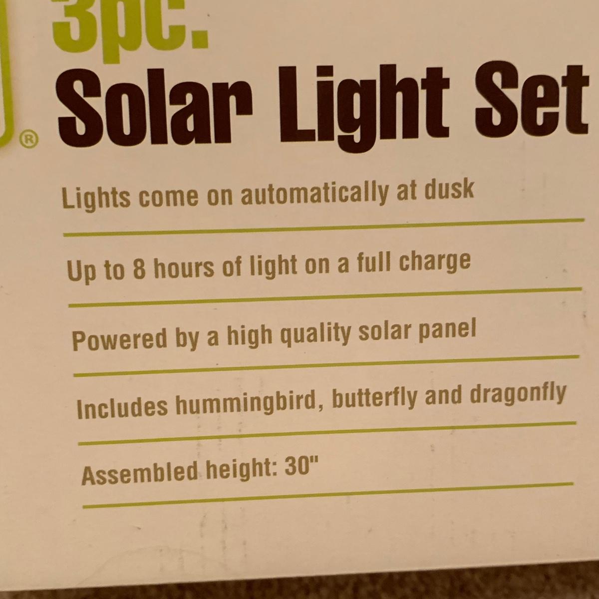 This collection of garden decor includes two wind chimes, one glass hummingbird feeder, and a set of three solar lights that are new in their original box. The smaller wind chime appears to be iron and makes a lighter higher pitched sound. The “Island Melody” wind chime has a lovely low toned sound that is reminiscent of a gong. This one from the hook to the bottom of the lowest metal label is 54” long. It has some tape residue on its metal tubes. The hummingbird feeder has a small chip on its glass orange flower rim.