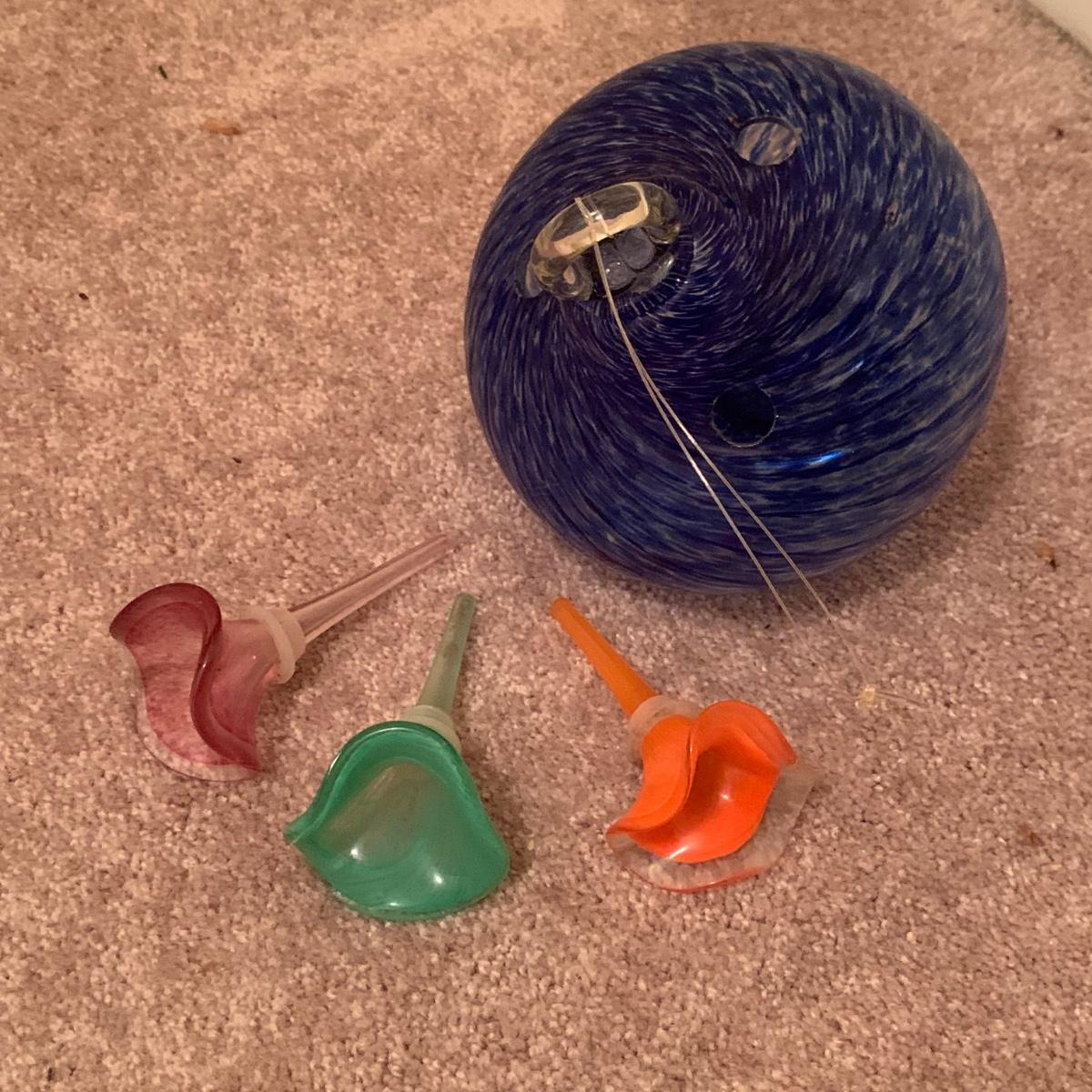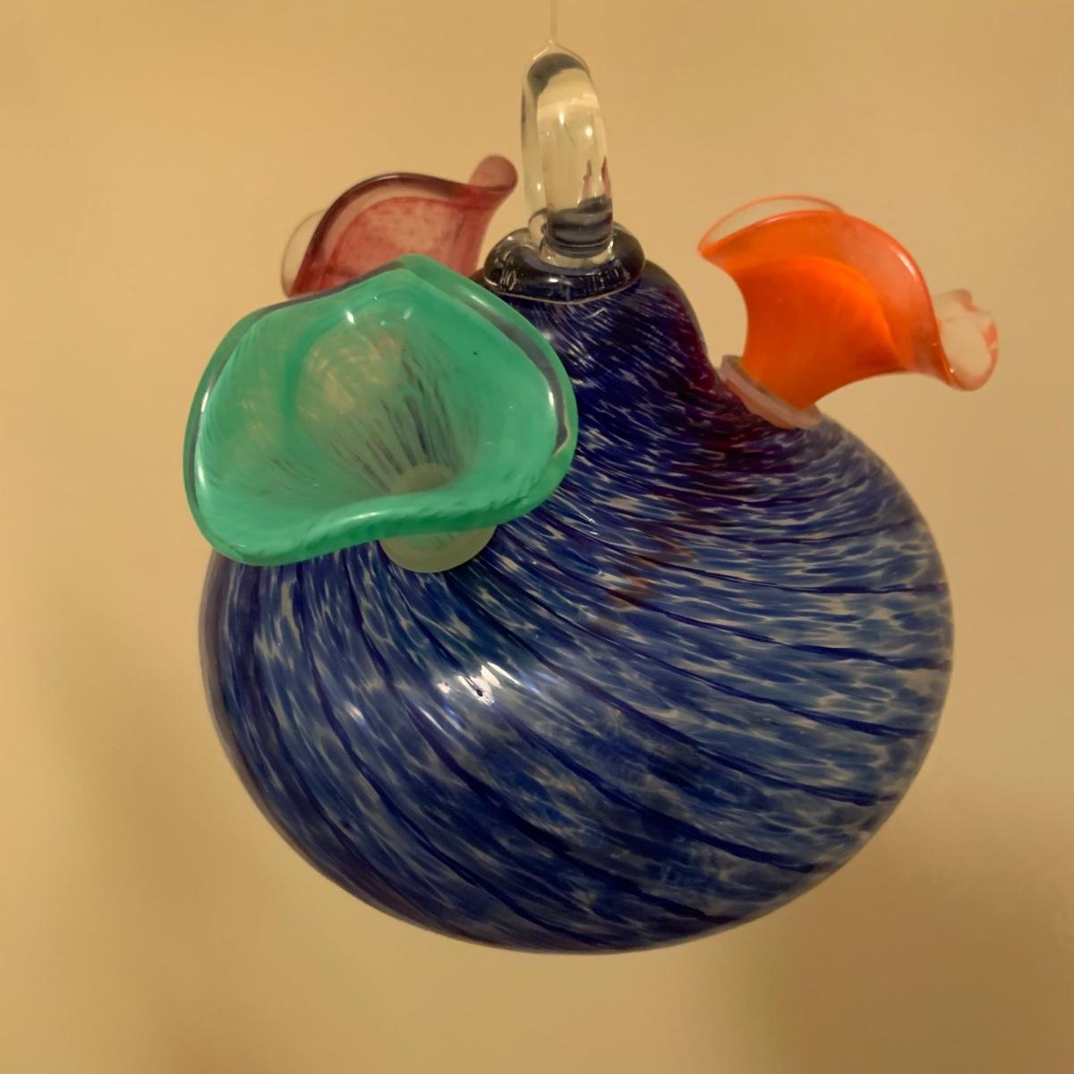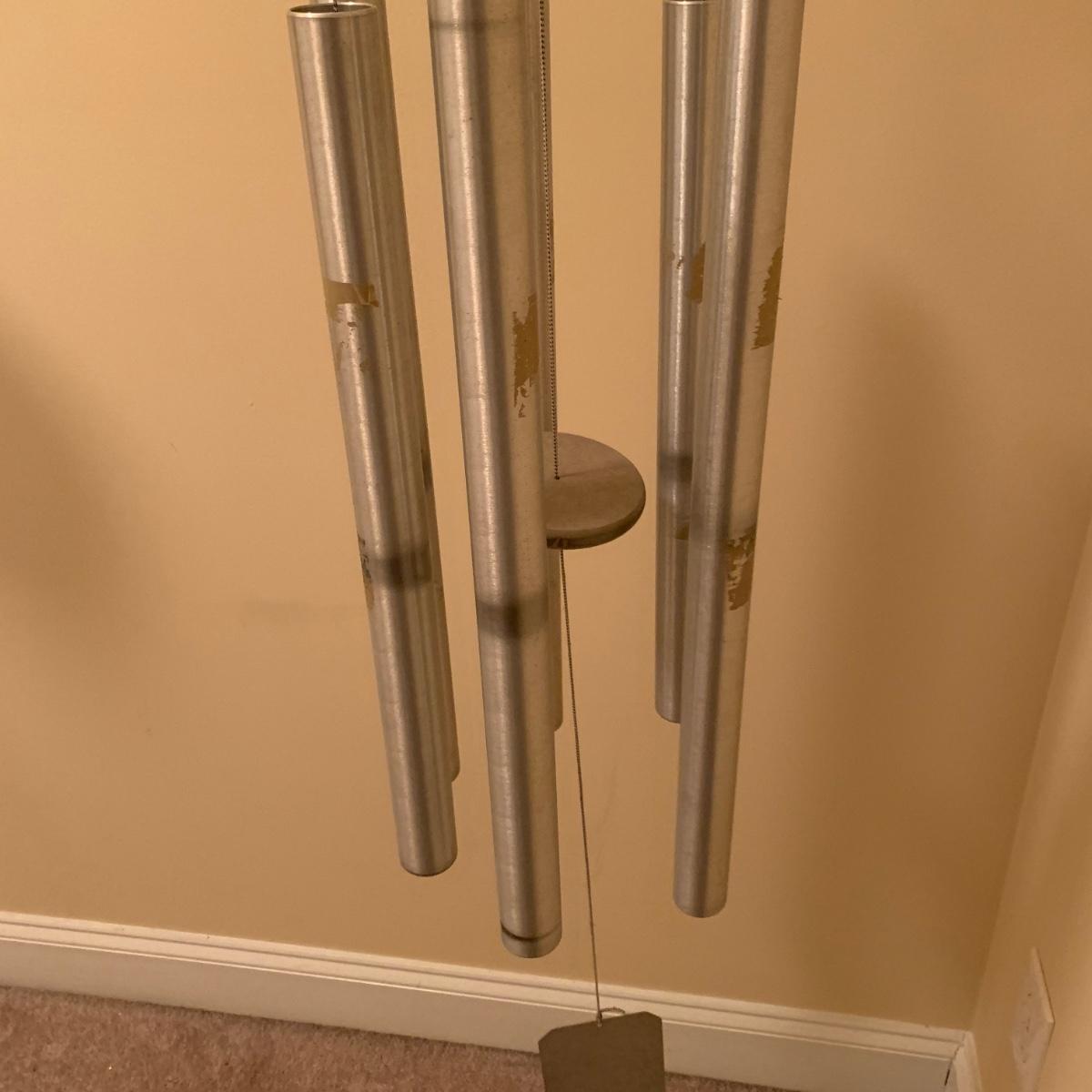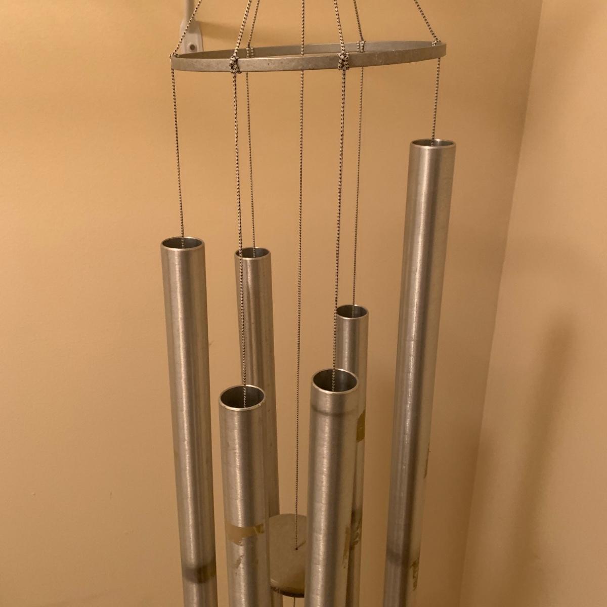 This collection of garden decor includes two wind chimes, one glass hummingbird feeder, and a set of three solar lights that are new in their original box. The smaller wind chime appears to be iron and makes a lighter higher pitched sound. The “Island Melody” wind chime has a lovely low toned sound that is reminiscent of a gong. This one from the hook to the bottom of the lowest metal label is 54” long. It has some tape residue on its metal tubes. The hummingbird feeder has a small chip on its glass orange flower rim.