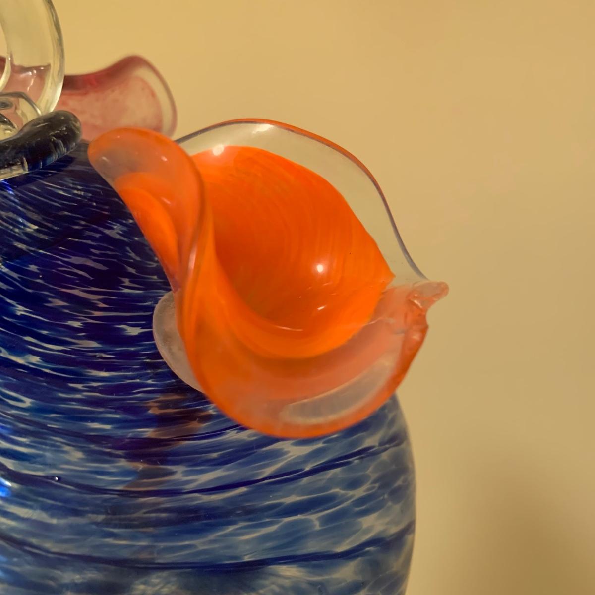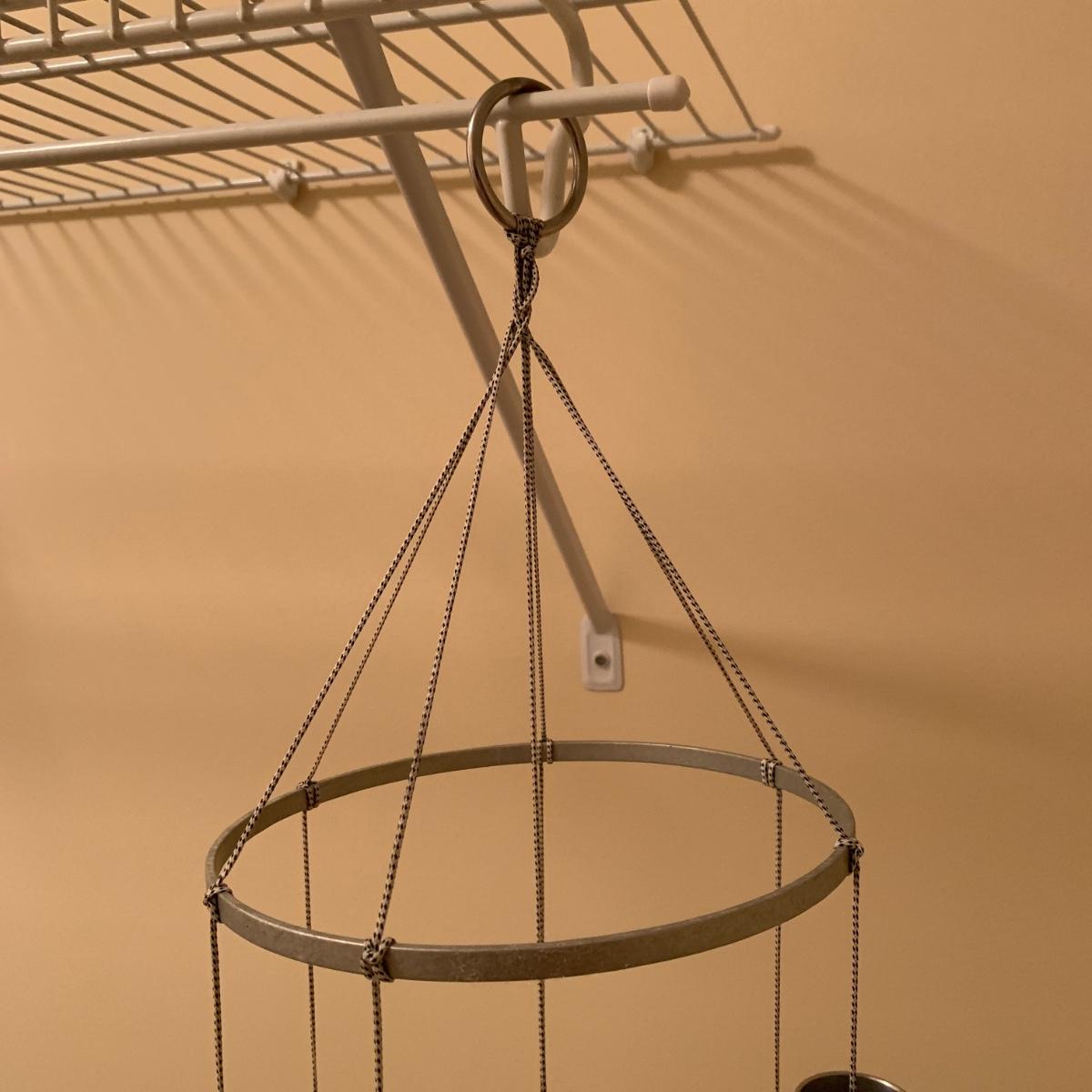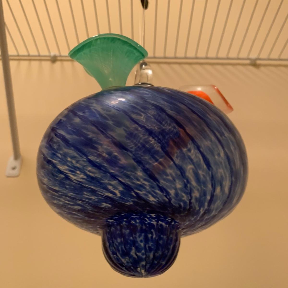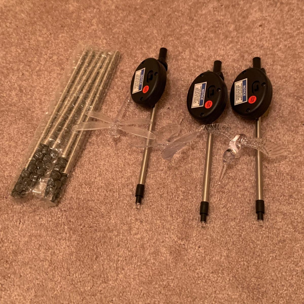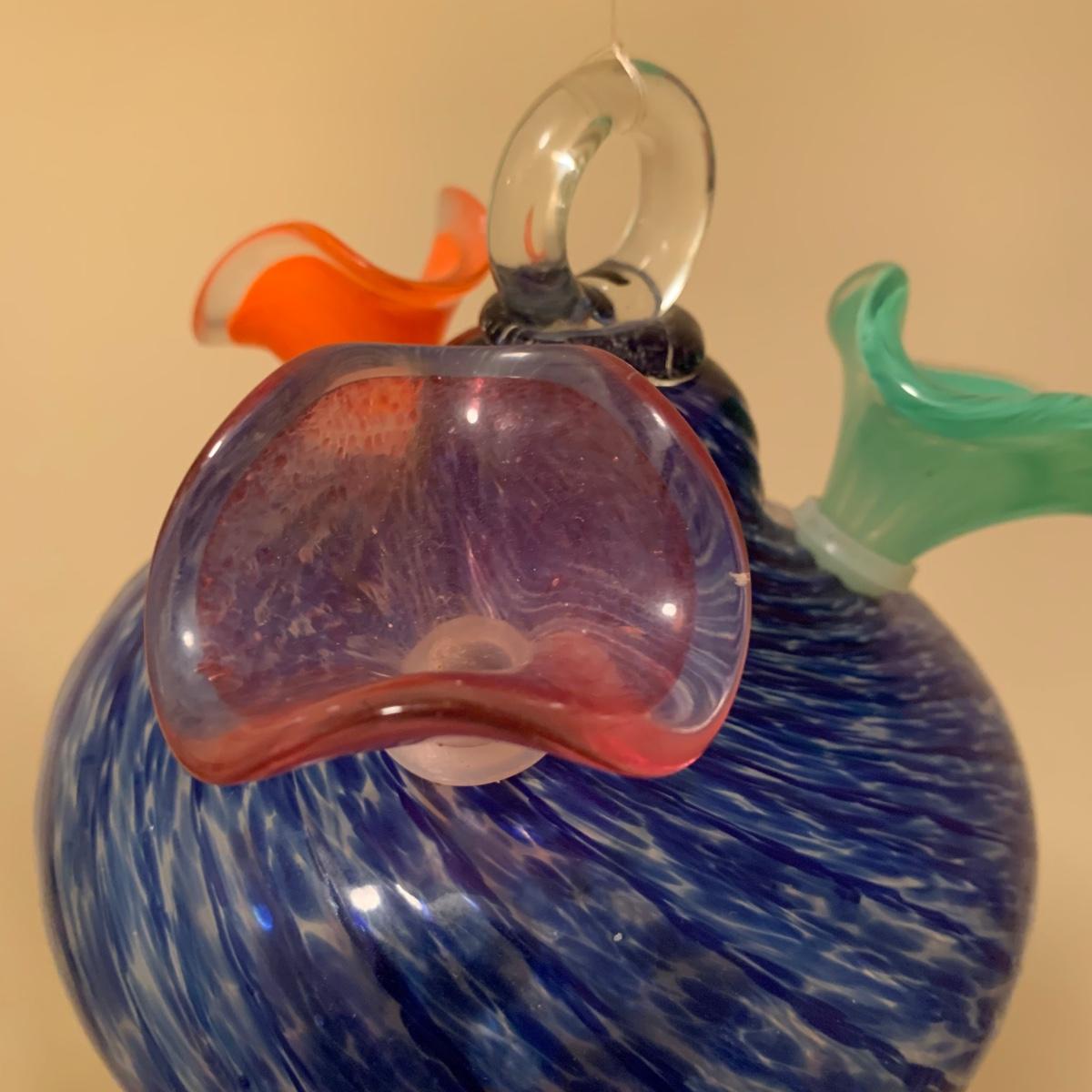 This collection of garden decor includes two wind chimes, one glass hummingbird feeder, and a set of three solar lights that are new in their original box. The smaller wind chime appears to be iron and makes a lighter higher pitched sound. The “Island Melody” wind chime has a lovely low toned sound that is reminiscent of a gong. This one from the hook to the bottom of the lowest metal label is 54” long. It has some tape residue on its metal tubes. The hummingbird feeder has a small chip on its glass orange flower rim.