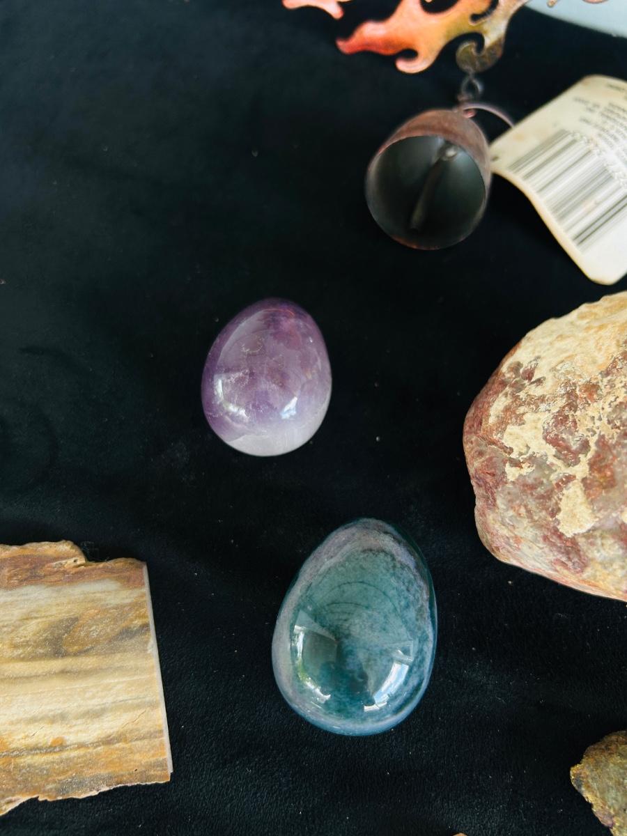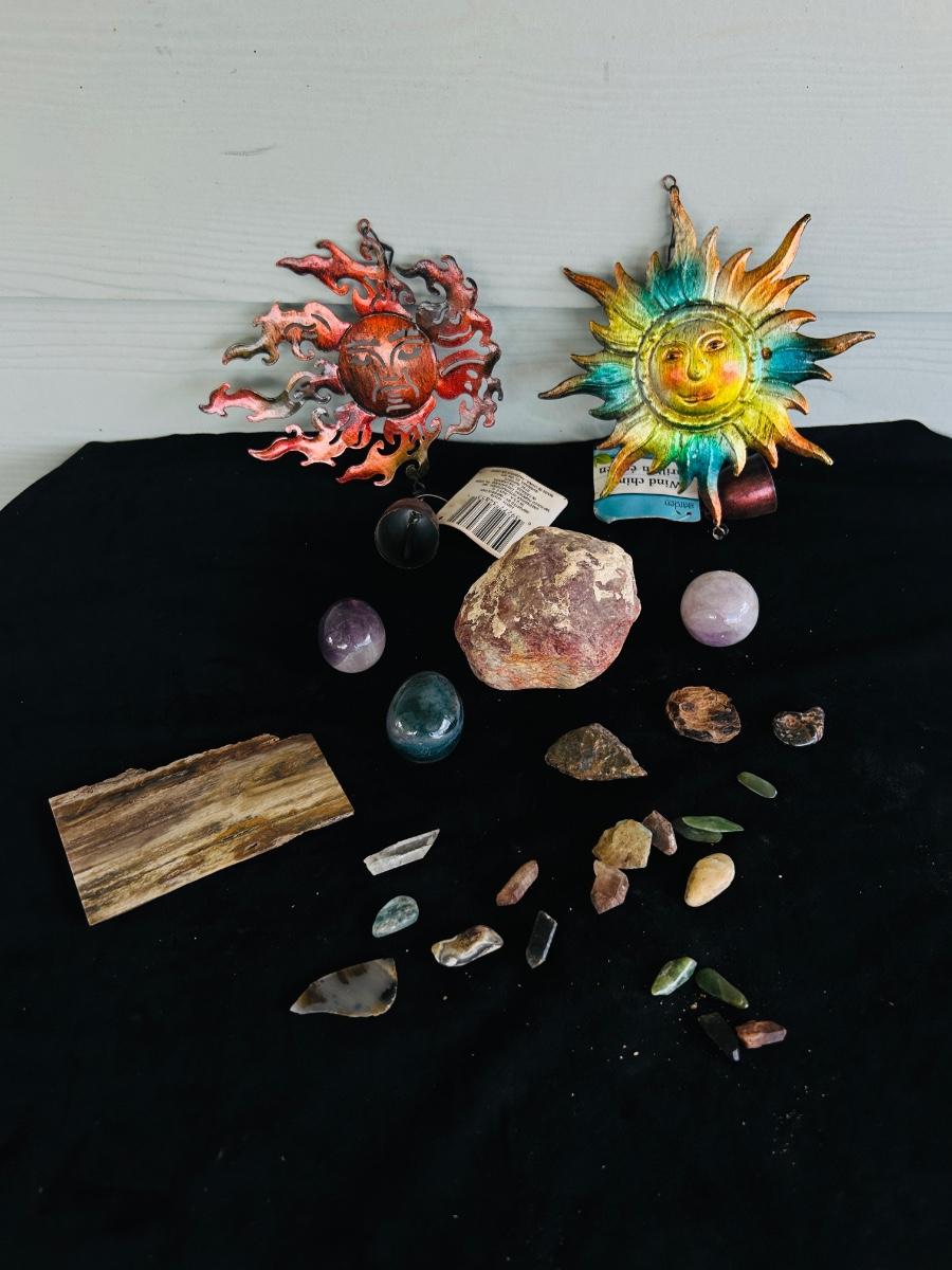 WIND CHIMES, MARBLE EGGS, POLISHED ROCKS AND PATIO WALL ART