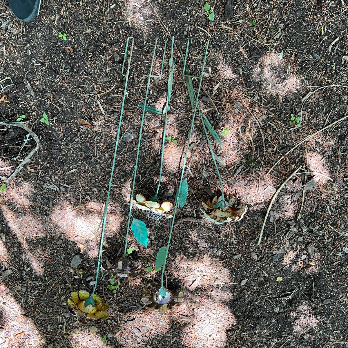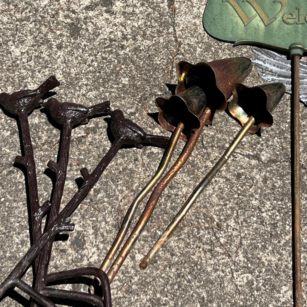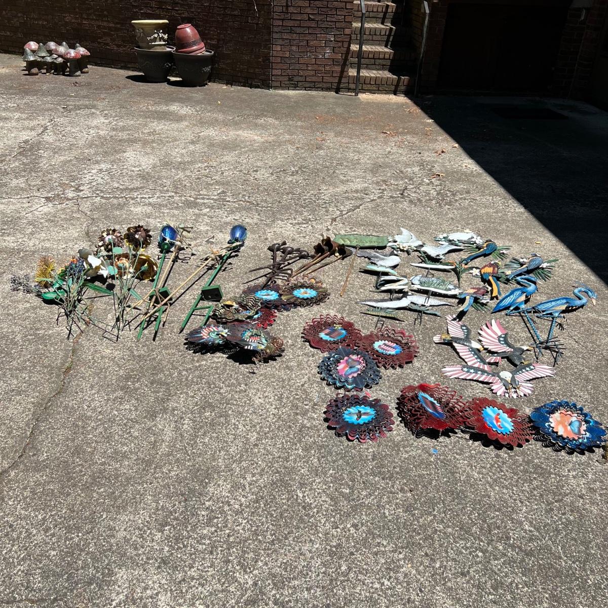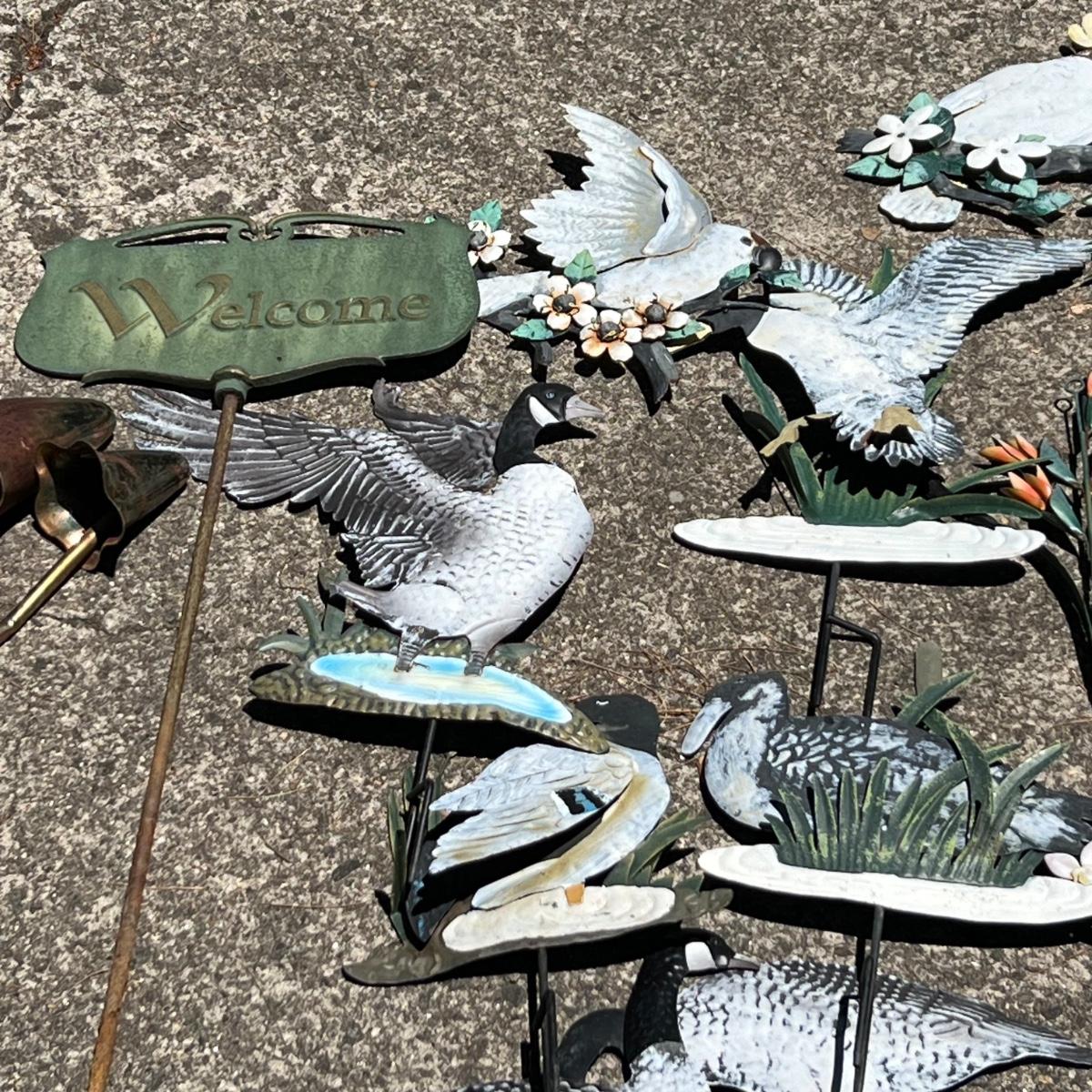 There are approximately 25 decorative stakes here that are all metal; two green stakes with solar panels and blue plastic dome tops have not been tested. A few flower stakes are very faded from the sun but could easily be repainted. The 12 plus metal wind spinners have holographic centers and can be hung separately or joined together. Some of the metal birds have hooks to hang and others have stakes. The metal green Welcome sign measures 13” x 7” x 31”H.