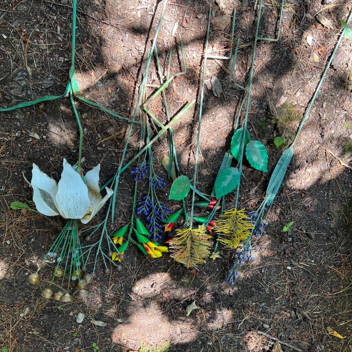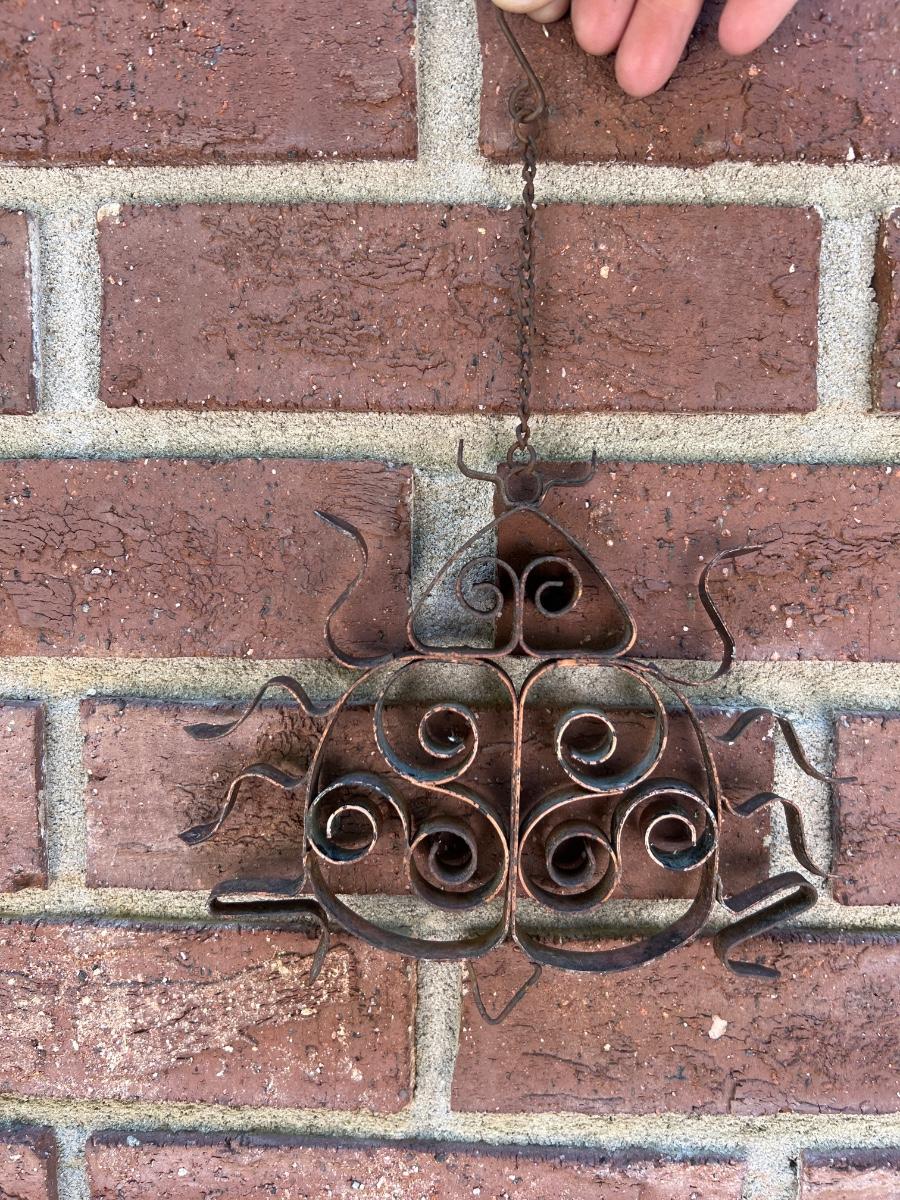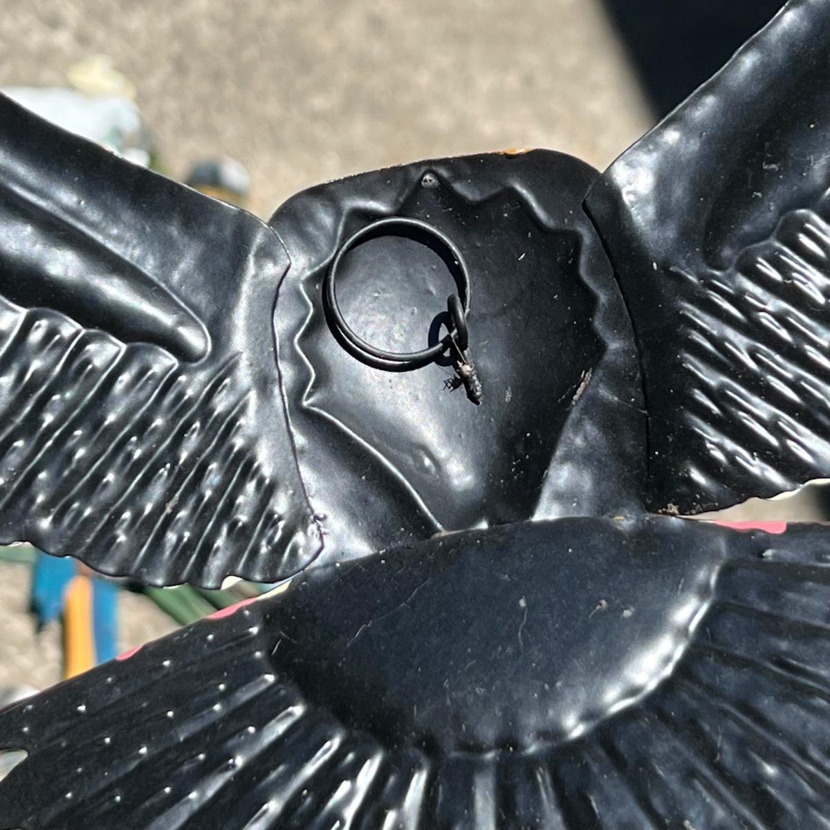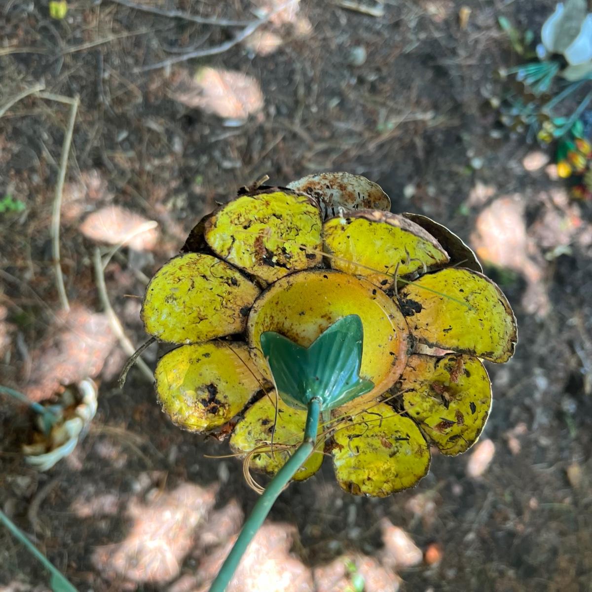 There are approximately 25 decorative stakes here that are all metal; two green stakes with solar panels and blue plastic dome tops have not been tested. A few flower stakes are very faded from the sun but could easily be repainted. The 12 plus metal wind spinners have holographic centers and can be hung separately or joined together. Some of the metal birds have hooks to hang and others have stakes. The metal green Welcome sign measures 13” x 7” x 31”H.