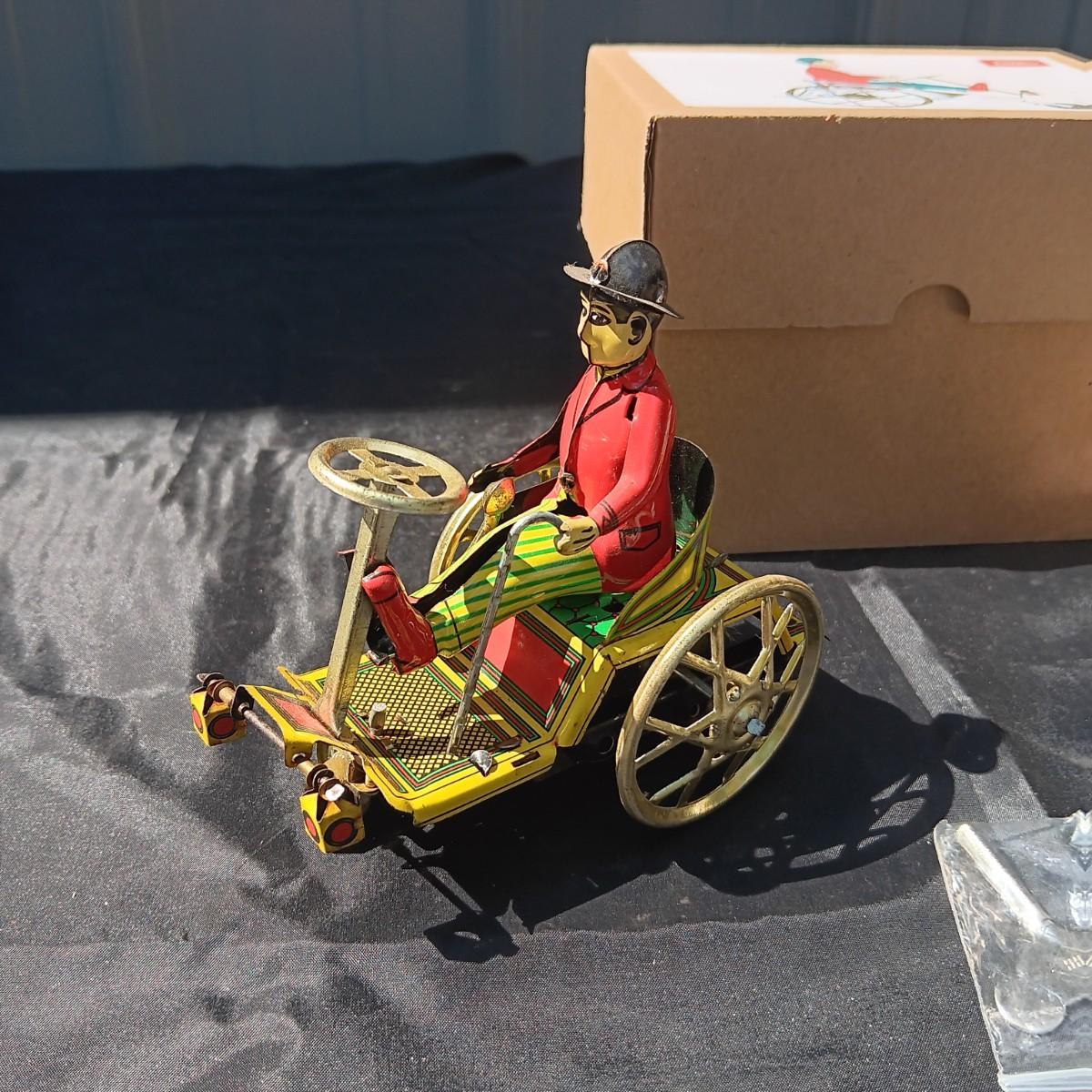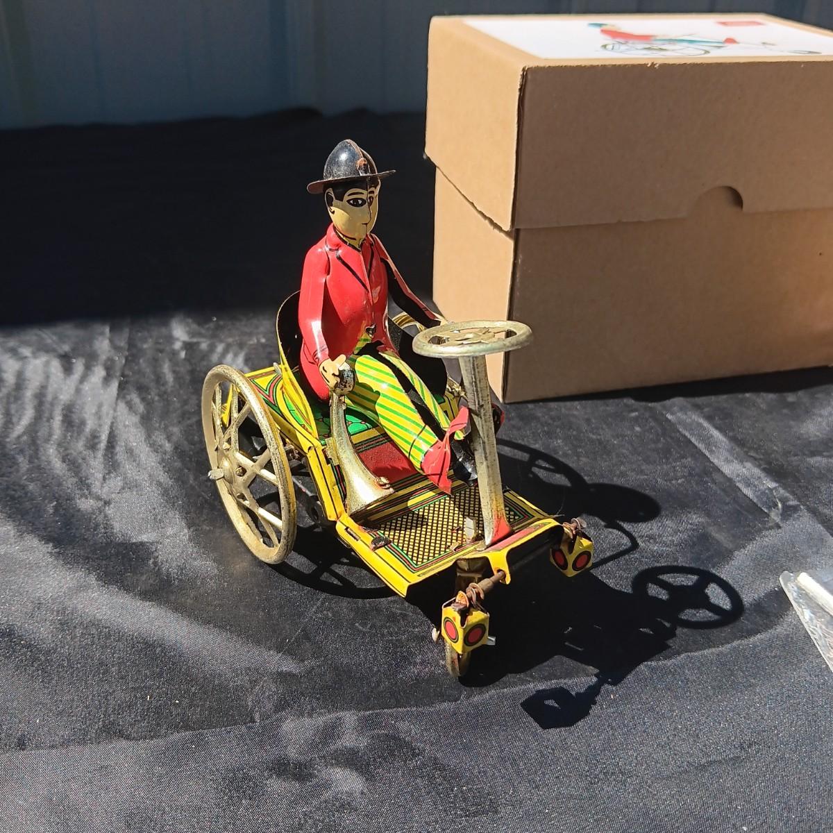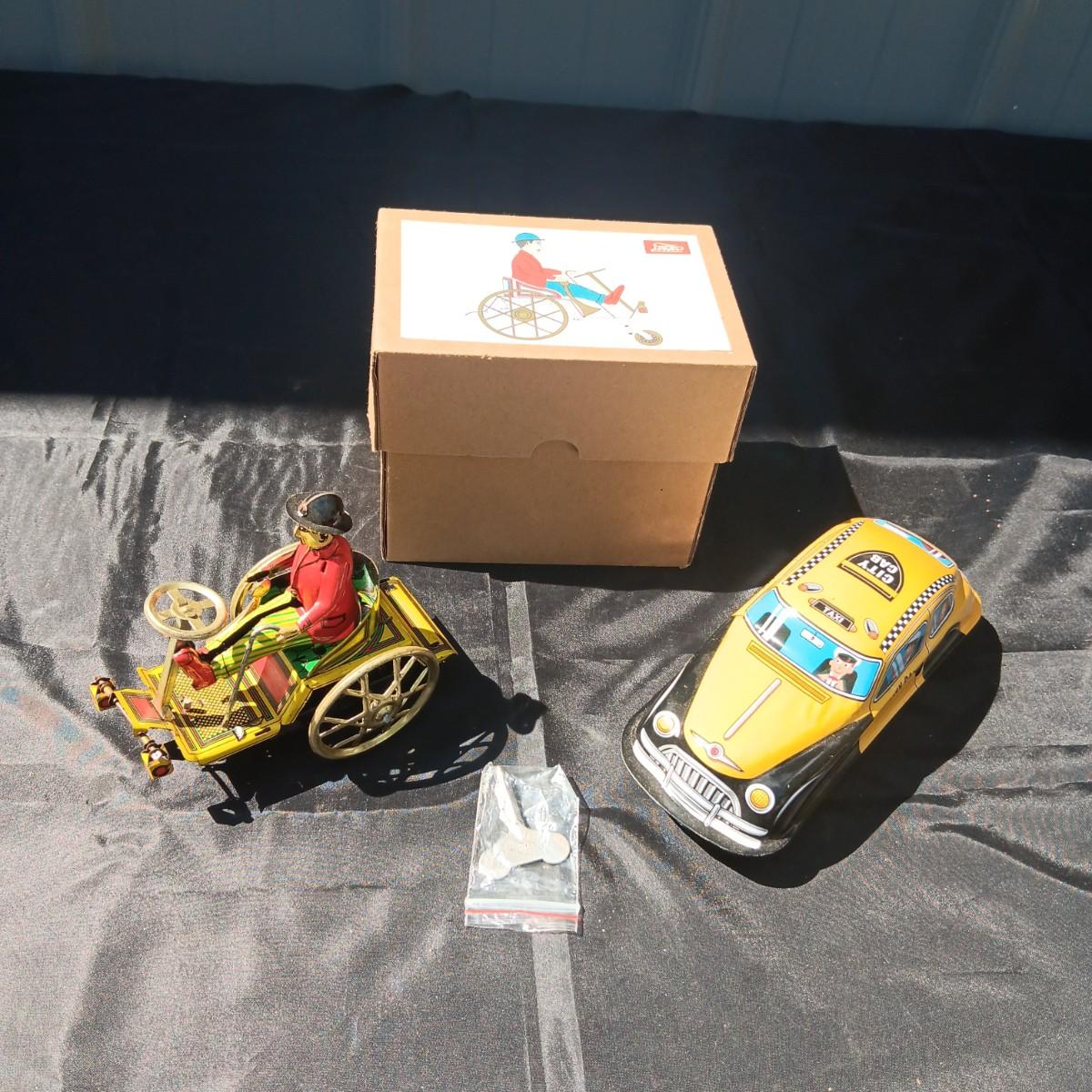 WIND UP MAN ON TRICK CART AND WIND UP TAXI CAB TOYS
