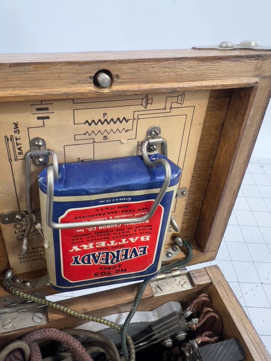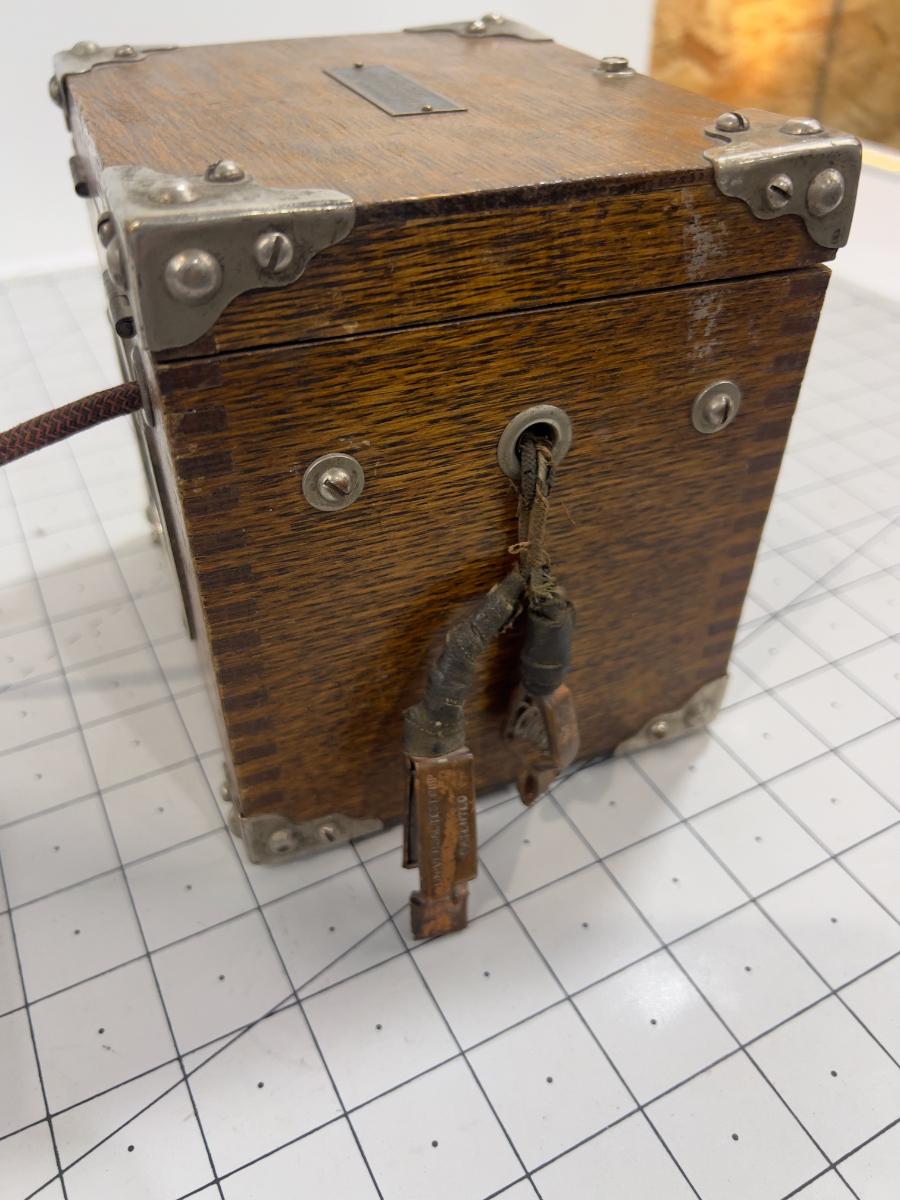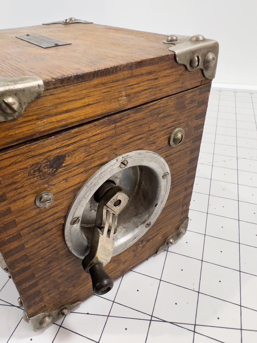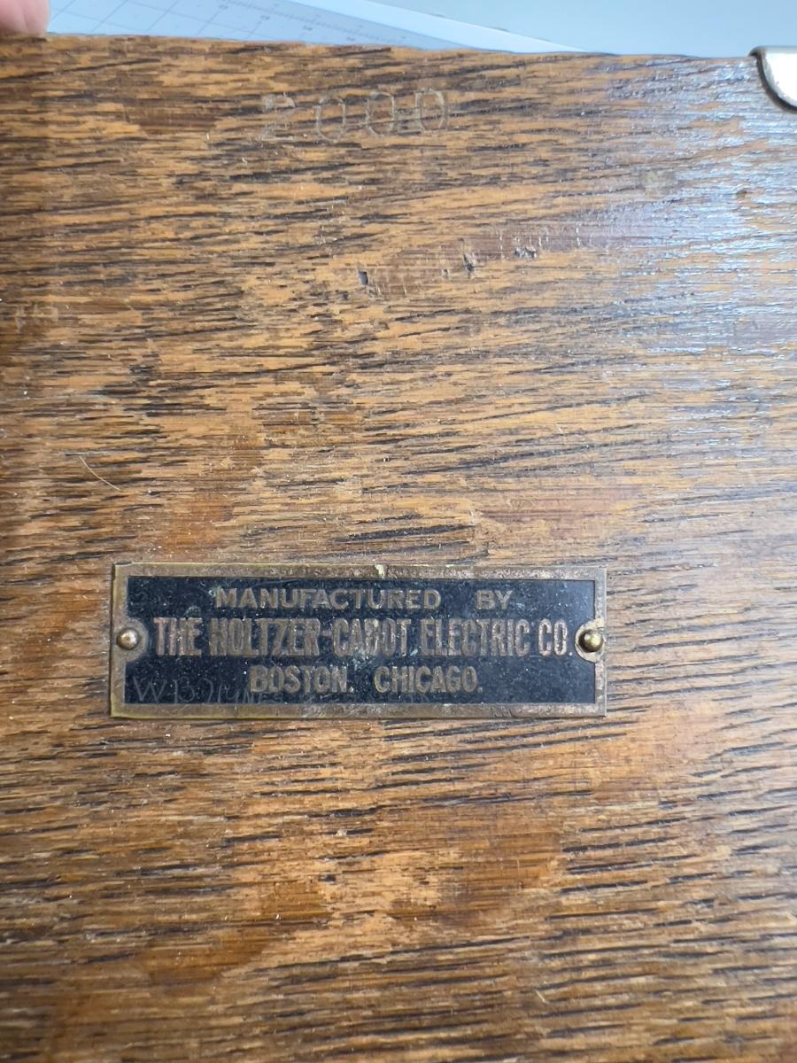 interesting. Oak Case. Speaker on it. Crank. On Off Switch. HOLTZER Electric Co.
