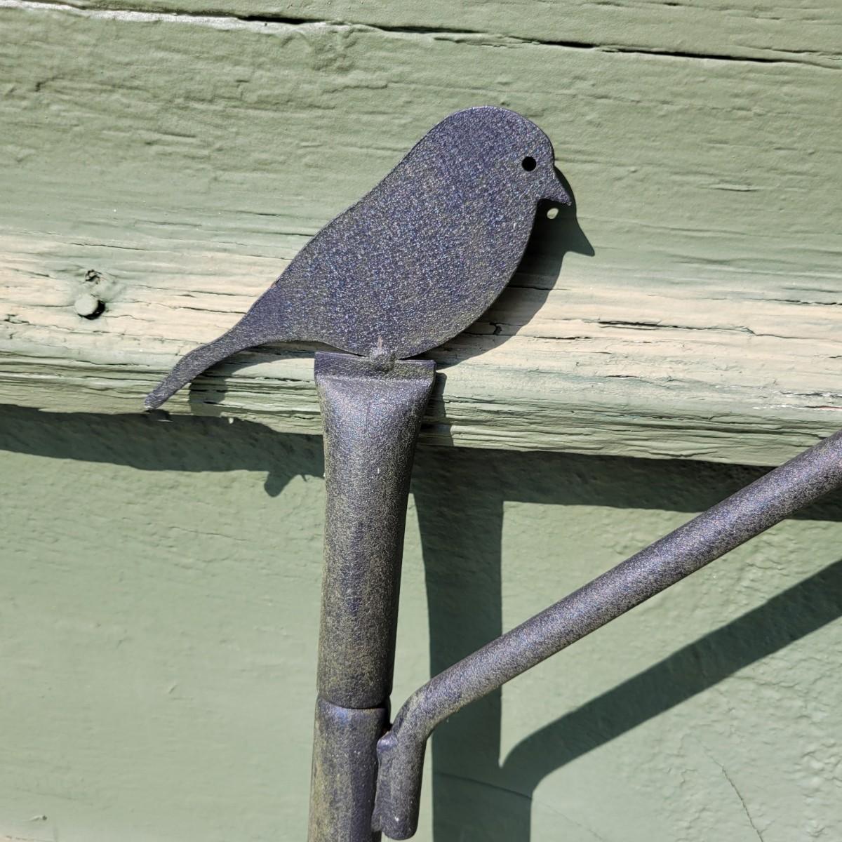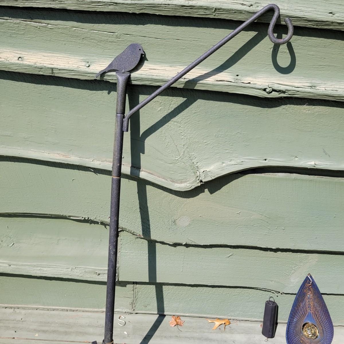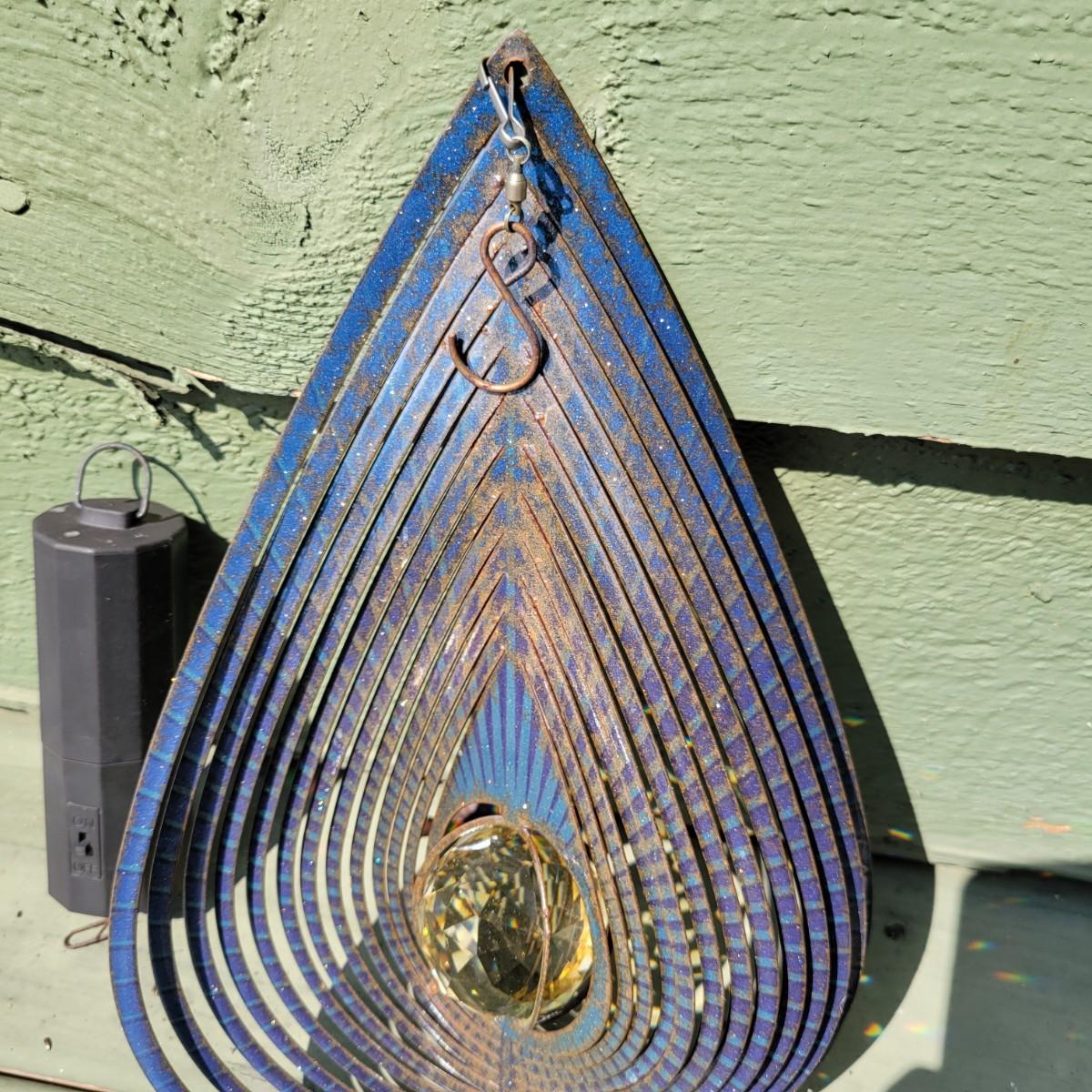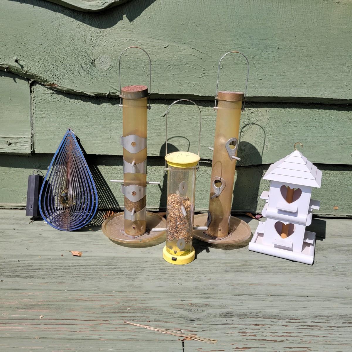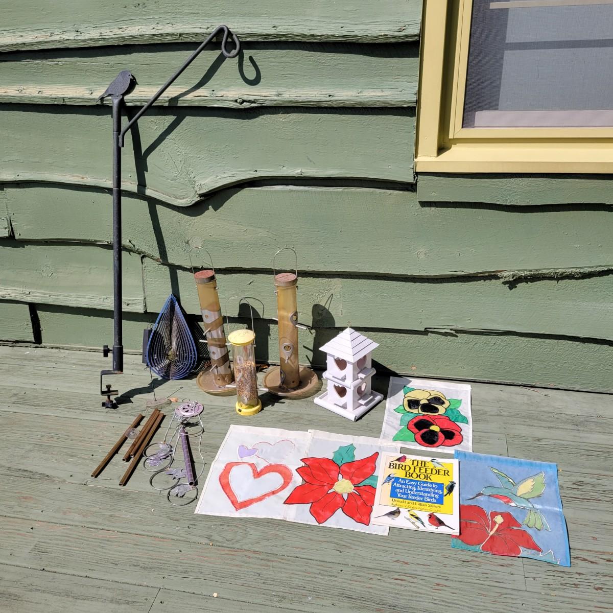 An assortment of patio and bird items in good condition, but there is some minor rusting and fading from being outdoors. Included are three bird feeders made of plastic, a decorative white birdhouse, a deck mounted bird feeder hanger, two winchimes, a book on feeding birds, four yard flags and a cool piece of hanging deck art with a motorized spinner. Spinner was not tested. The feeder hook measures approximately 20" x 47" Local pickup only