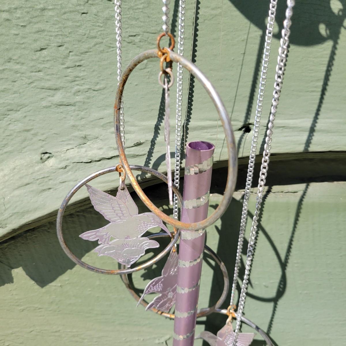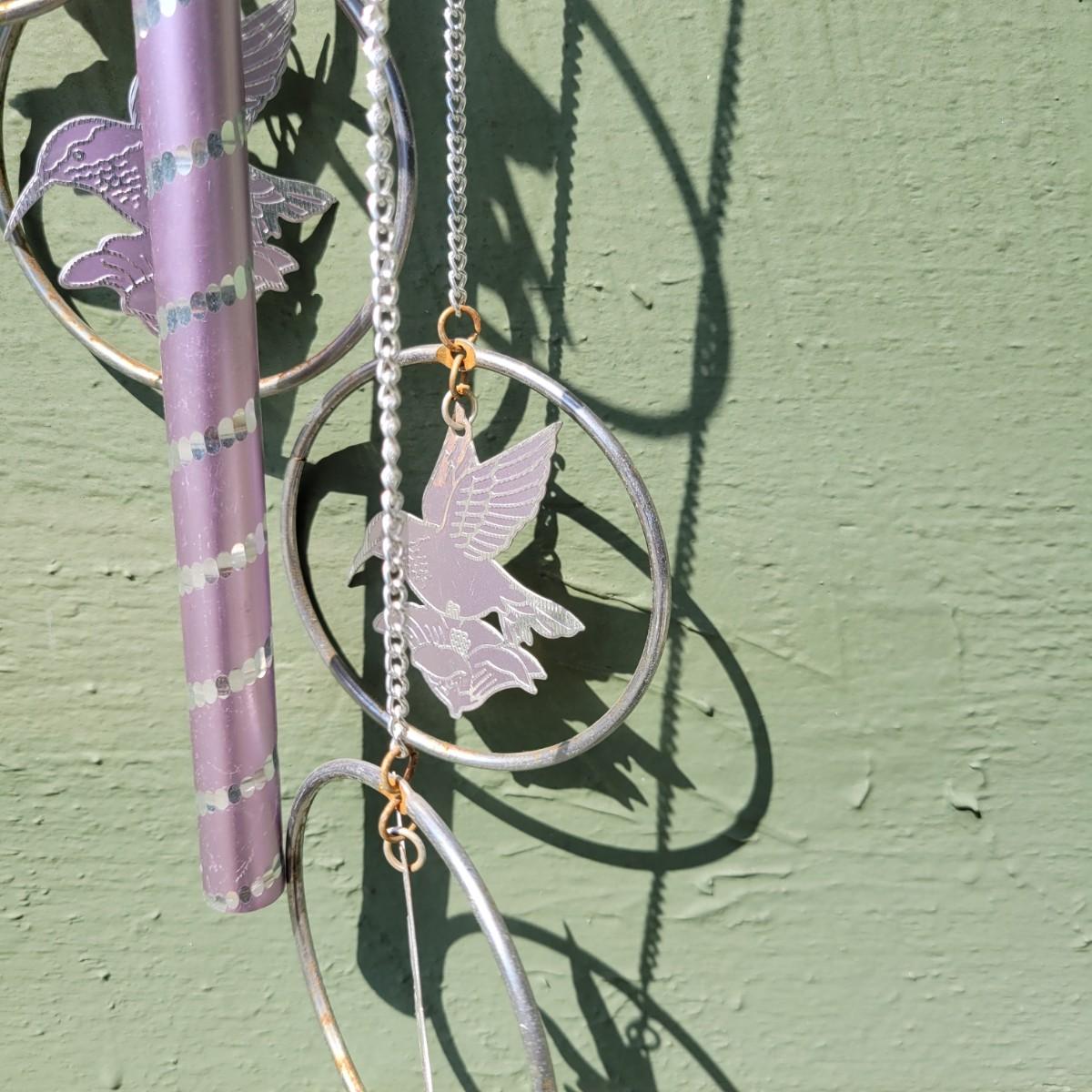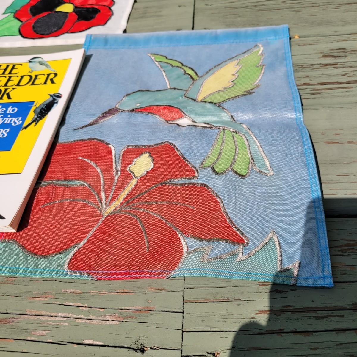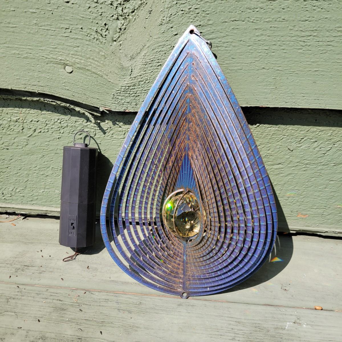 An assortment of patio and bird items in good condition, but there is some minor rusting and fading from being outdoors. Included are three bird feeders made of plastic, a decorative white birdhouse, a deck mounted bird feeder hanger, two winchimes, a book on feeding birds, four yard flags and a cool piece of hanging deck art with a motorized spinner. Spinner was not tested. The feeder hook measures approximately 20" x 47" Local pickup only