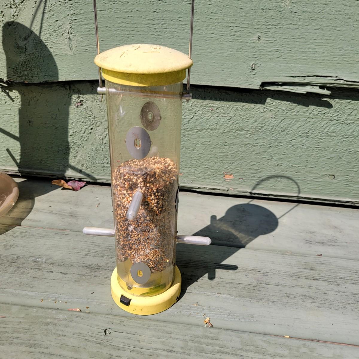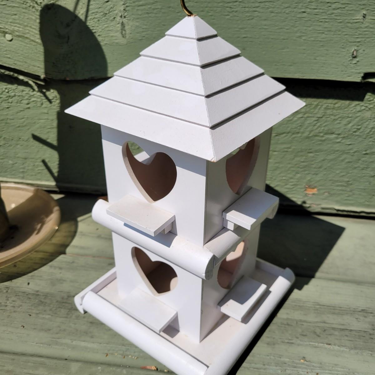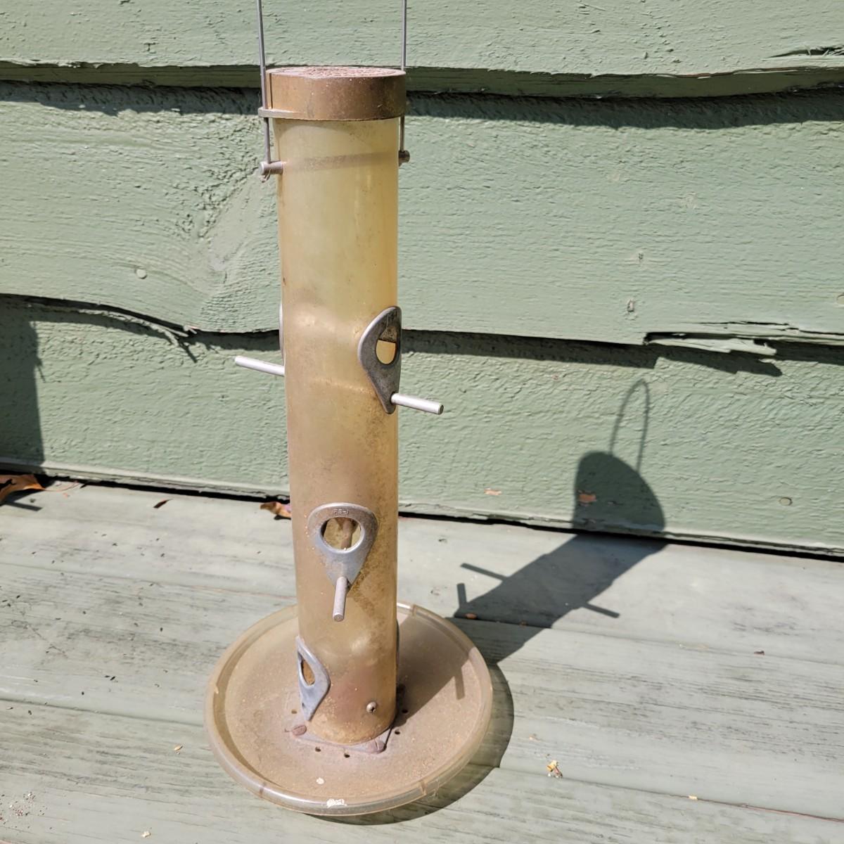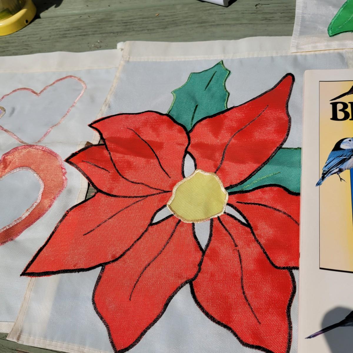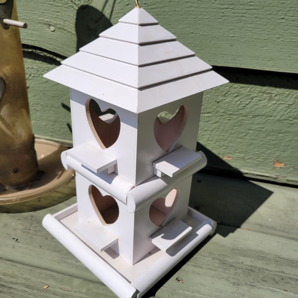 An assortment of patio and bird items in good condition, but there is some minor rusting and fading from being outdoors. Included are three bird feeders made of plastic, a decorative white birdhouse, a deck mounted bird feeder hanger, two winchimes, a book on feeding birds, four yard flags and a cool piece of hanging deck art with a motorized spinner. Spinner was not tested. The feeder hook measures approximately 20" x 47" Local pickup only