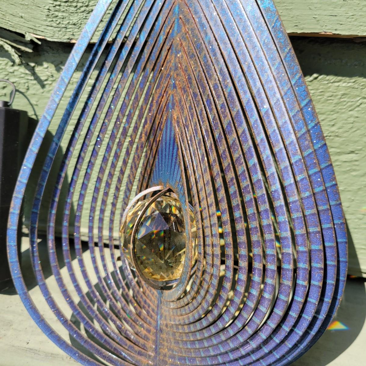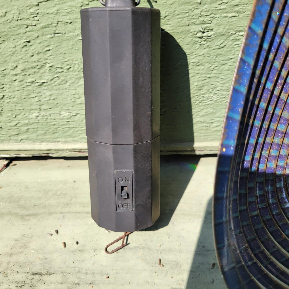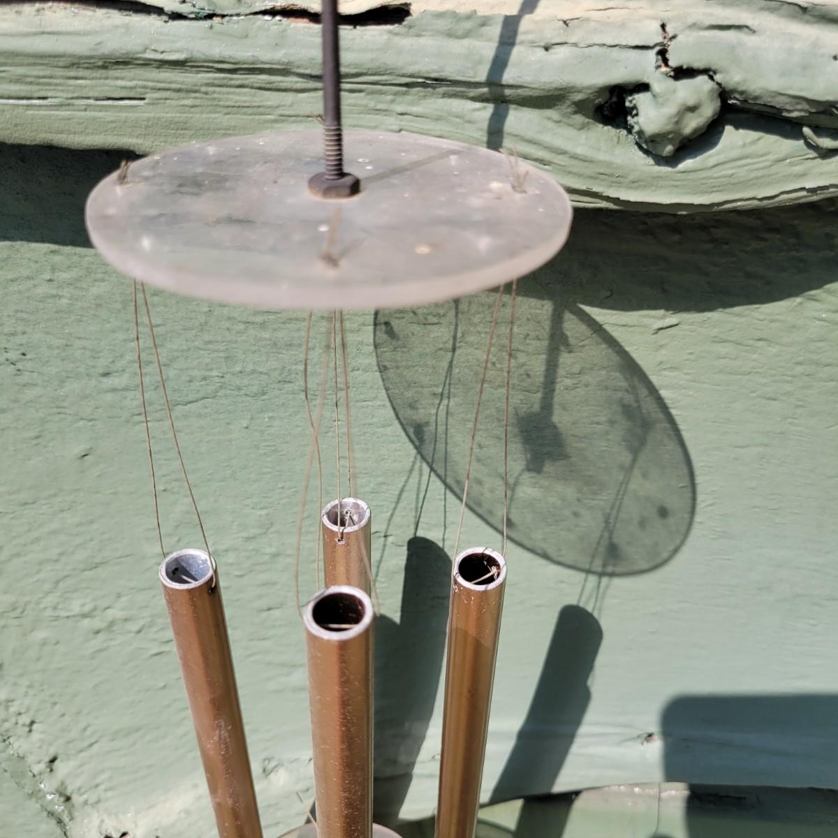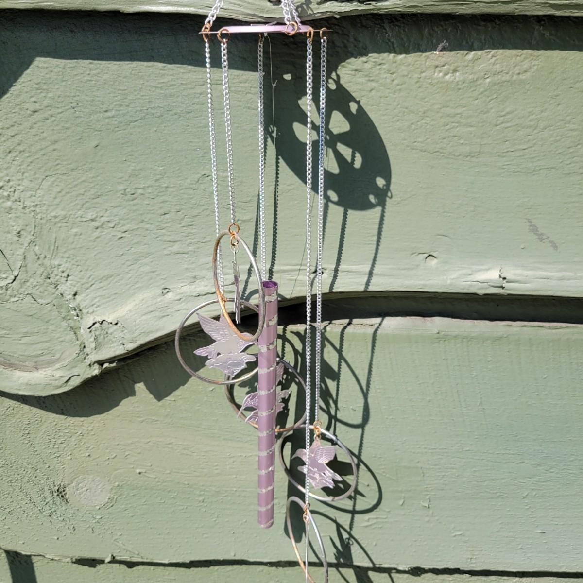 An assortment of patio and bird items in good condition, but there is some minor rusting and fading from being outdoors. Included are three bird feeders made of plastic, a decorative white birdhouse, a deck mounted bird feeder hanger, two winchimes, a book on feeding birds, four yard flags and a cool piece of hanging deck art with a motorized spinner. Spinner was not tested. The feeder hook measures approximately 20" x 47" Local pickup only