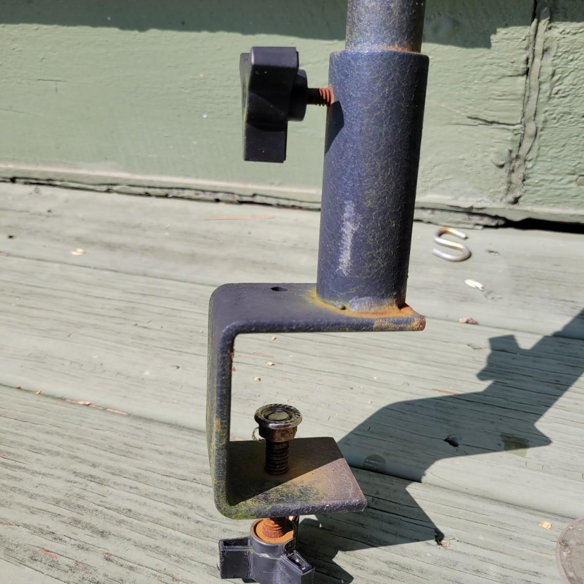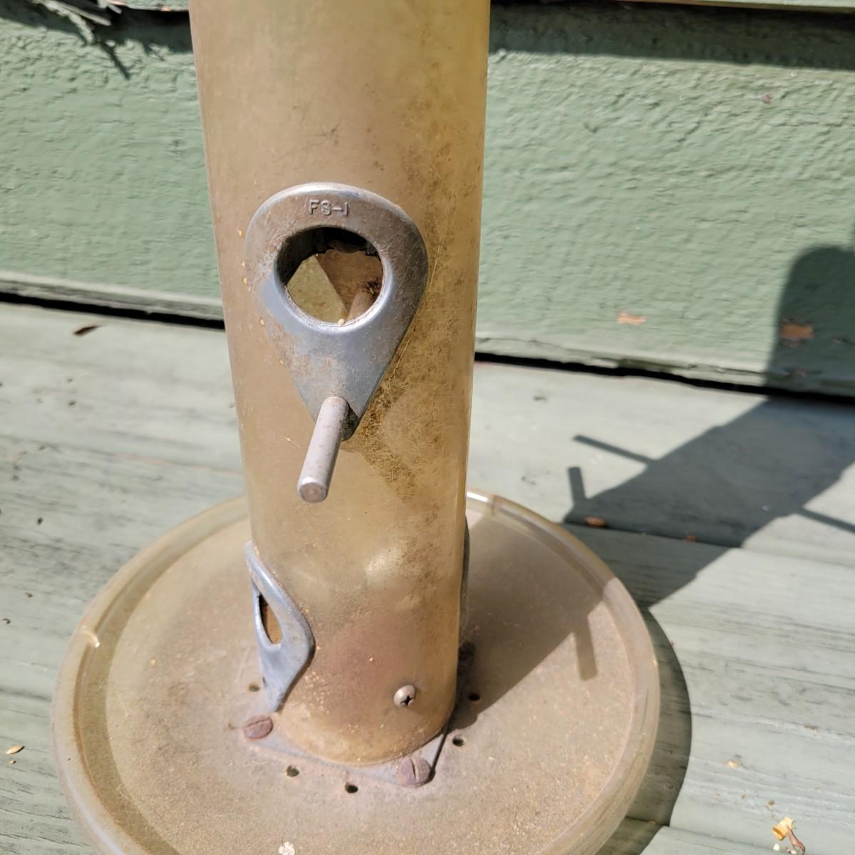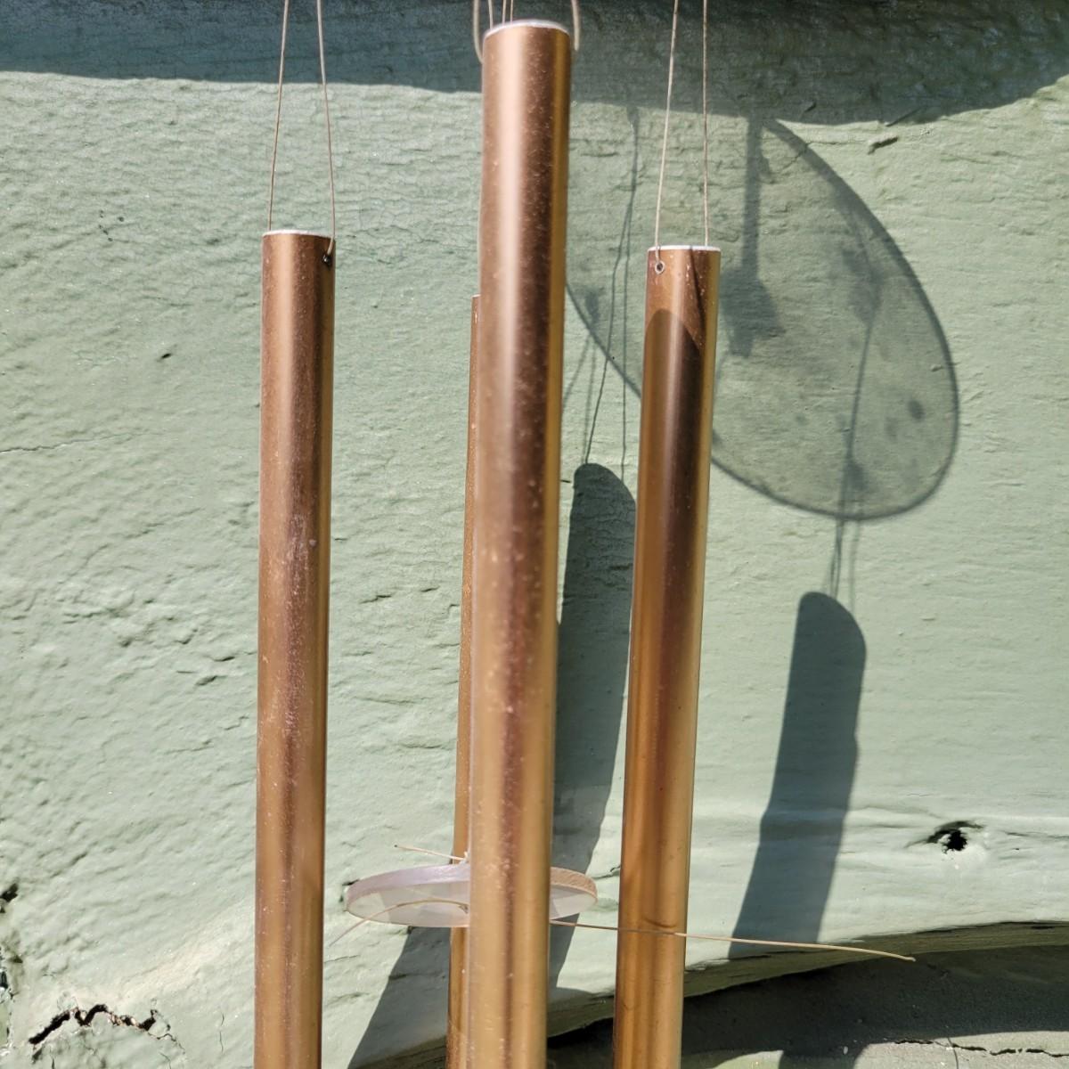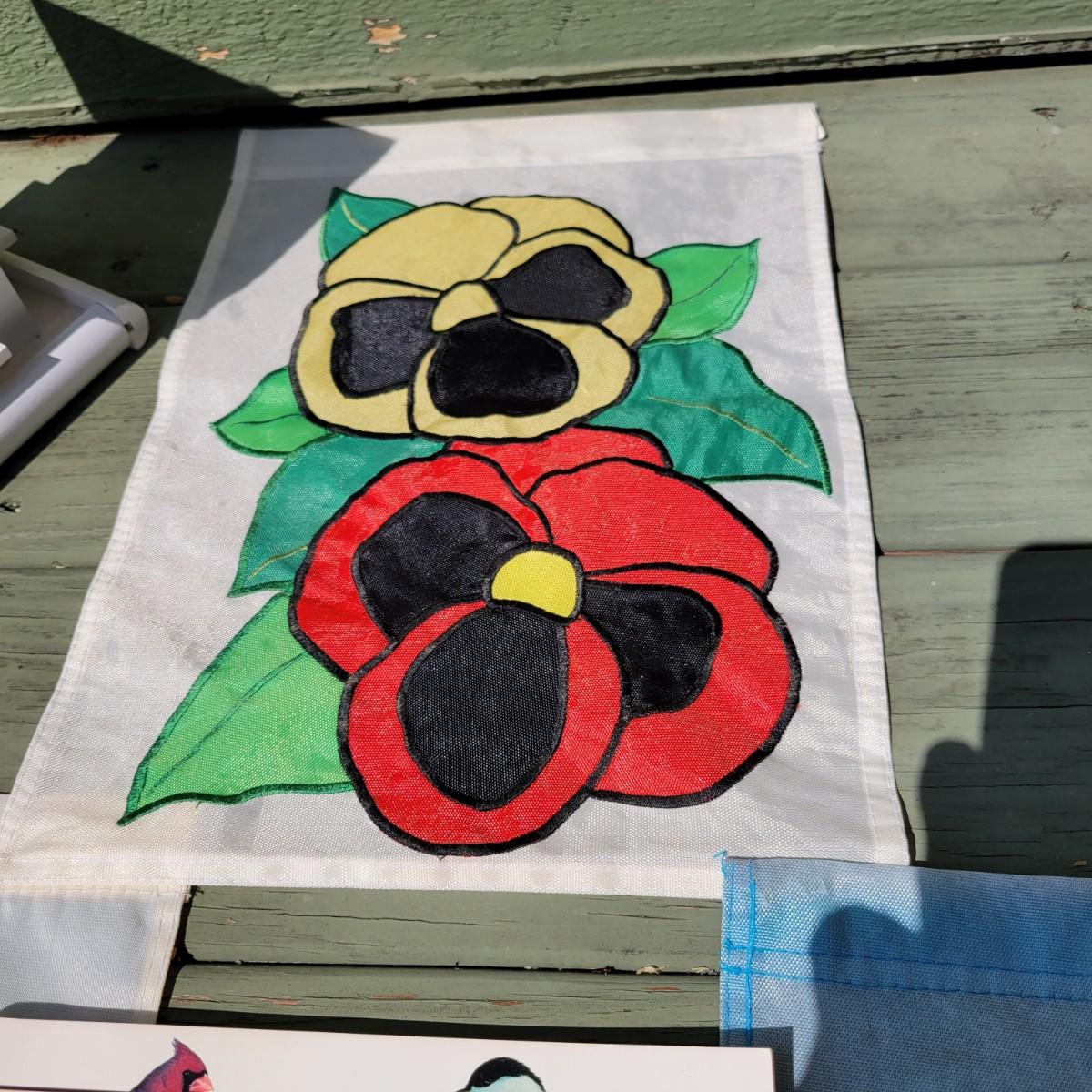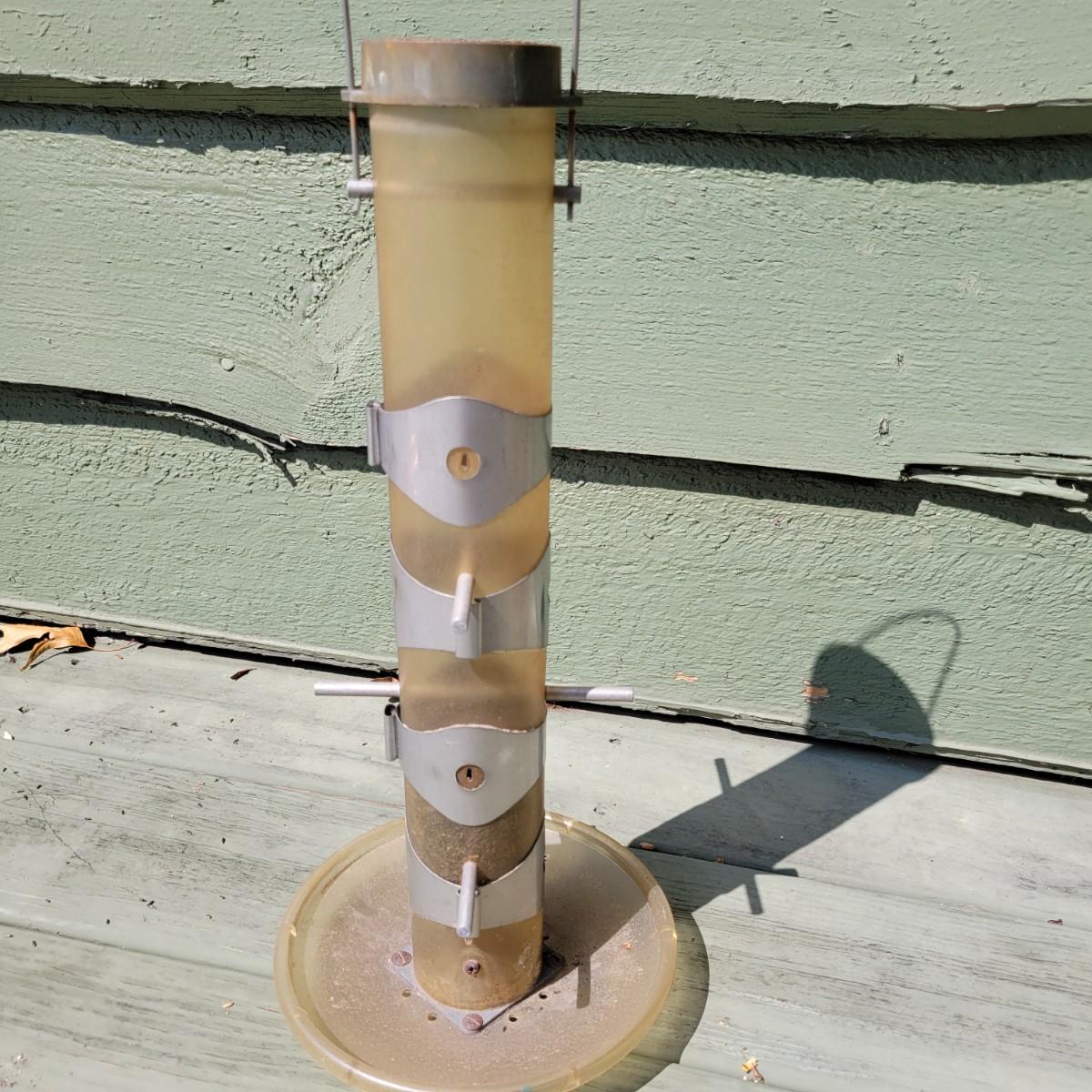 An assortment of patio and bird items in good condition, but there is some minor rusting and fading from being outdoors. Included are three bird feeders made of plastic, a decorative white birdhouse, a deck mounted bird feeder hanger, two winchimes, a book on feeding birds, four yard flags and a cool piece of hanging deck art with a motorized spinner. Spinner was not tested. The feeder hook measures approximately 20" x 47" Local pickup only