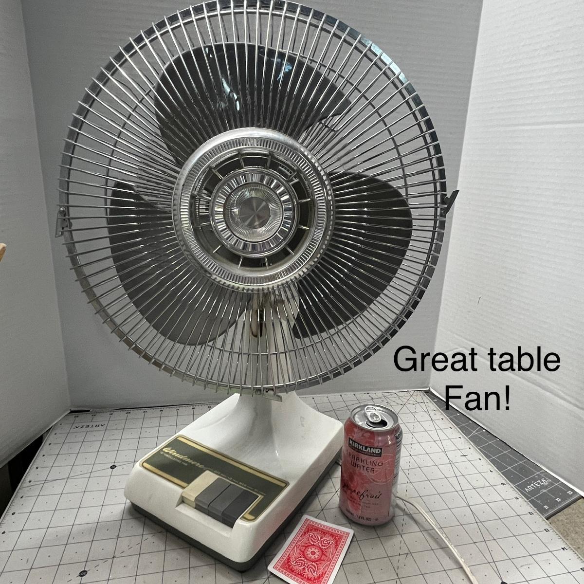 Manual oscillation, silver wire guard, black blades, rectangular base.