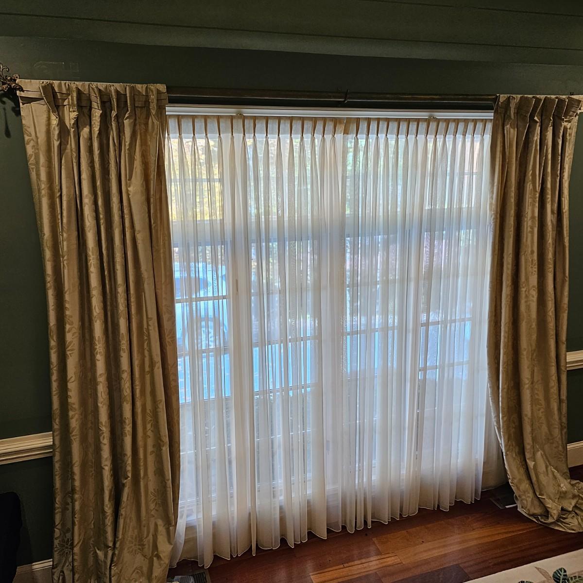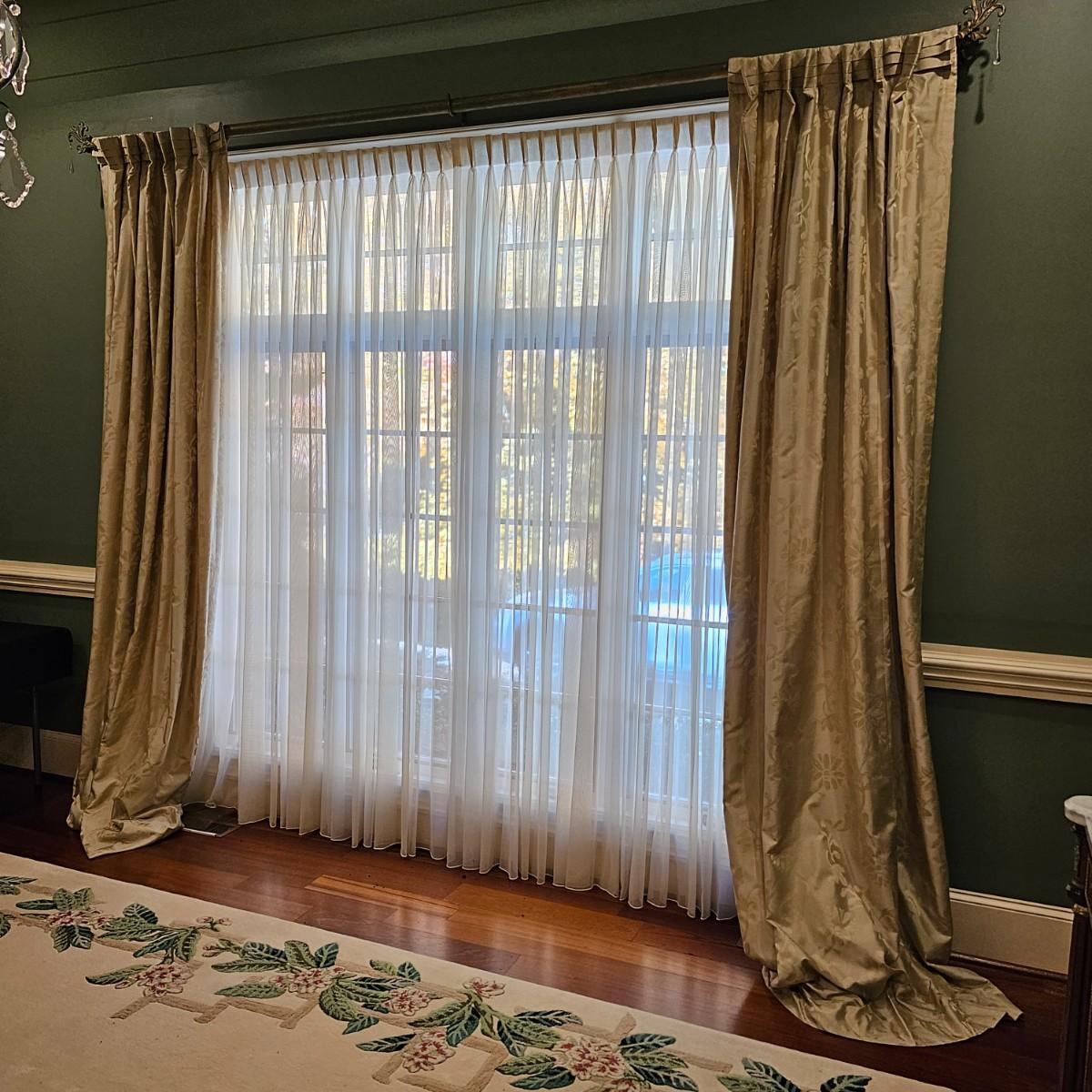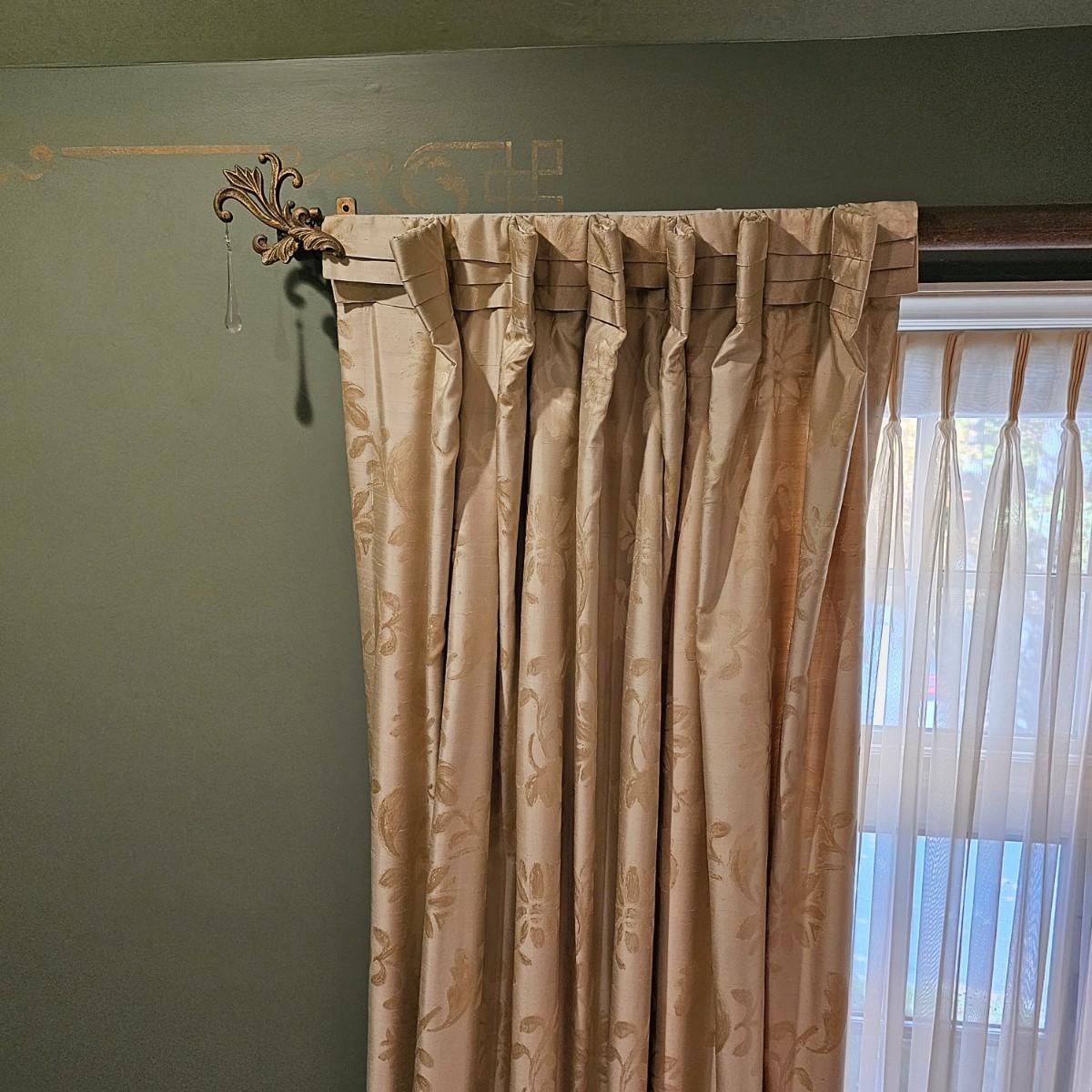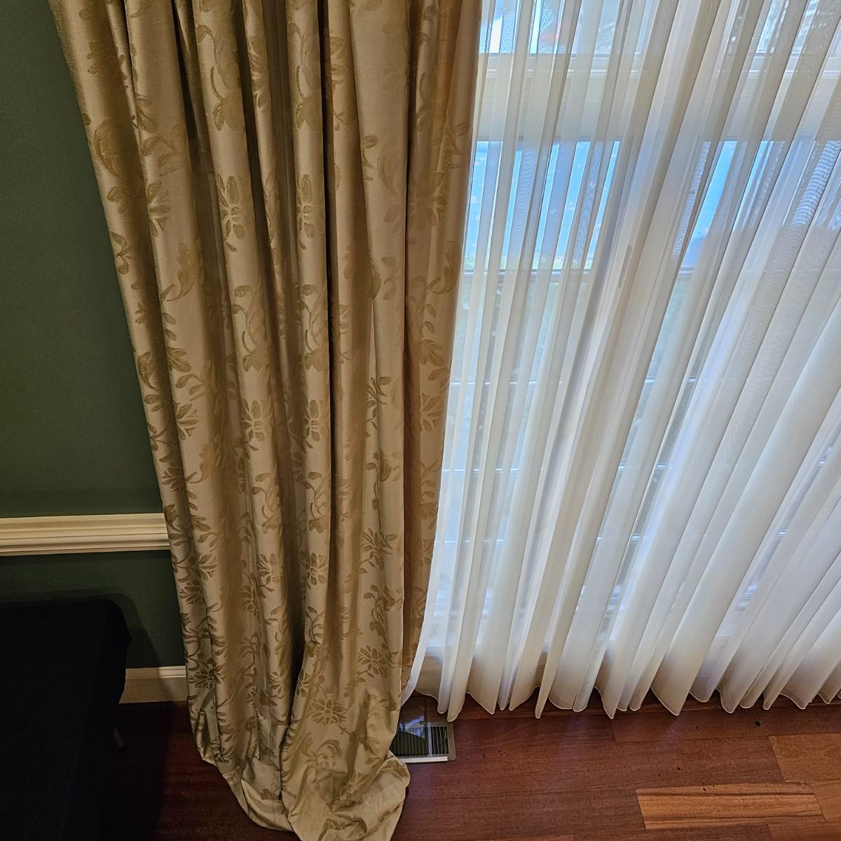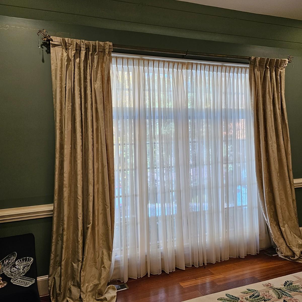 Window treatments for large opening. White shears on standard traverse rod and side panels on round rod with finial attachments on ends. Shears are 130" x 107" H, gold side panels are 26" x 125"H and puddle at bottom, with a white linen lining. Buyer will need to bring ladder and tools to remove from wall: screwdrivers, allen wrenches. See photos for details. Local pickup only.