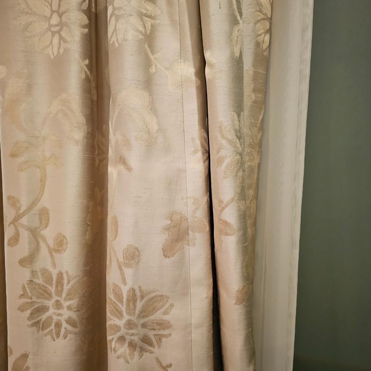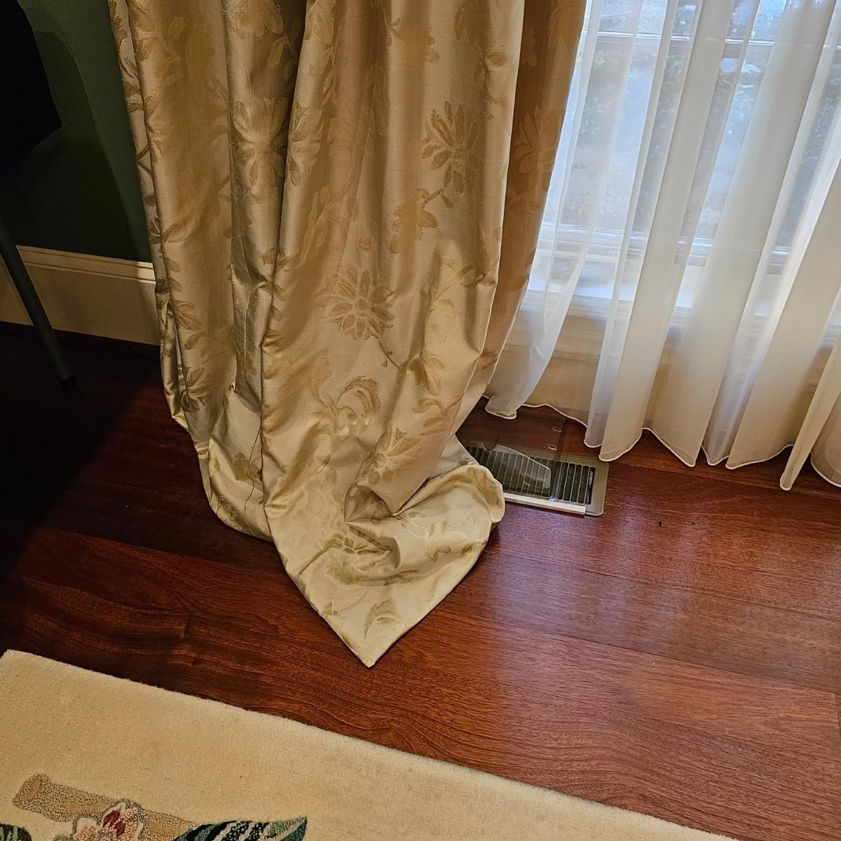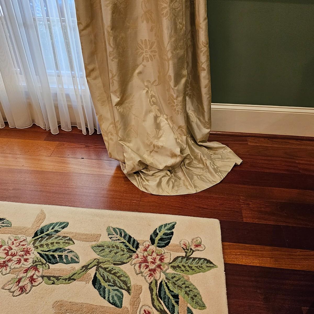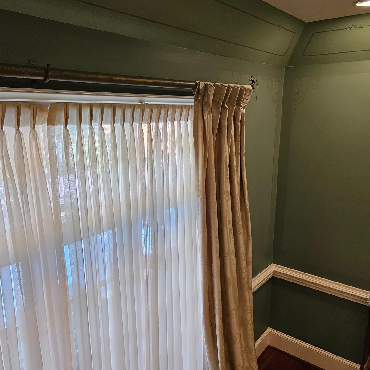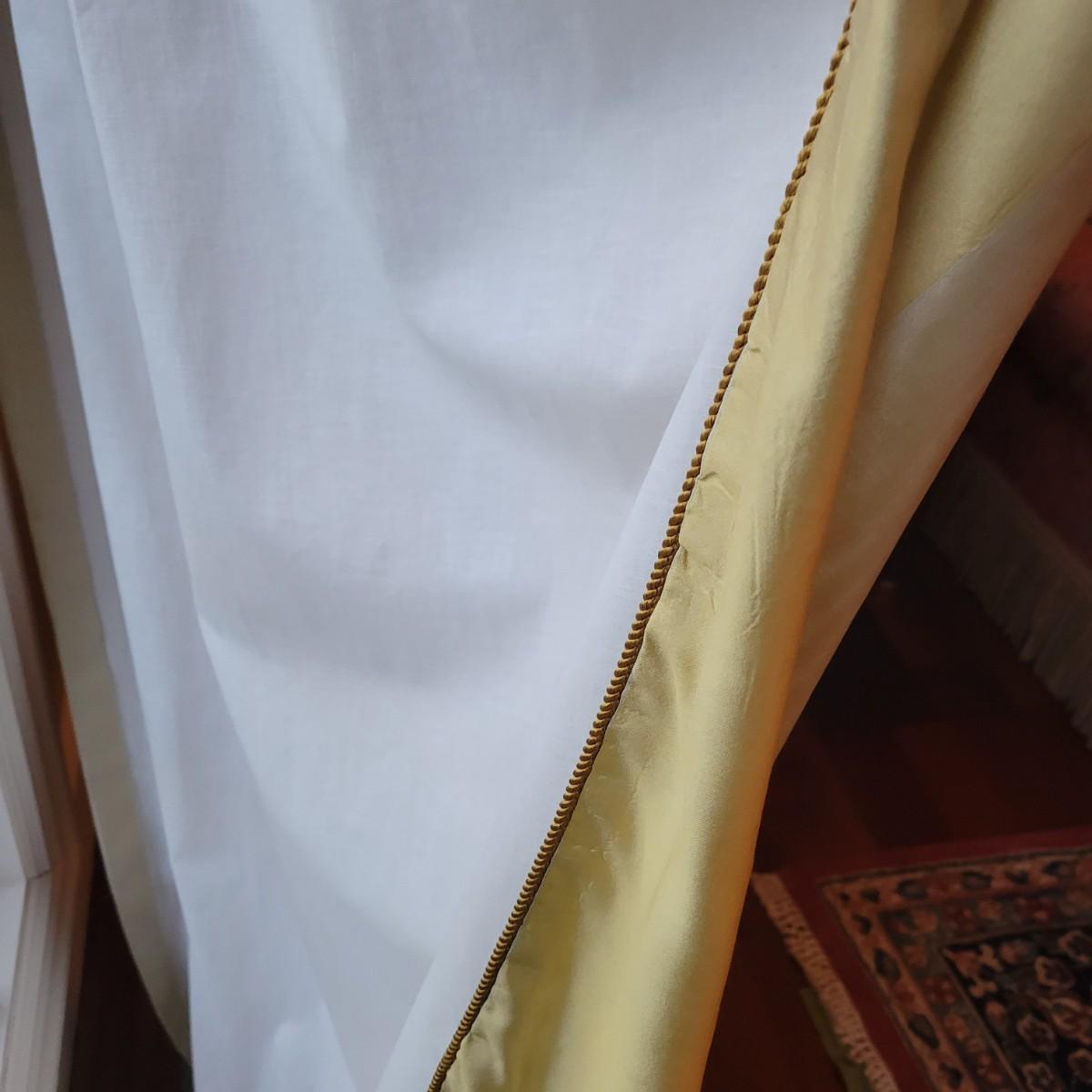 Window treatments for large opening. White shears on standard traverse rod and side panels on round rod with finial attachments on ends. Shears are 130" x 107" H, gold side panels are 26" x 125"H and puddle at bottom, with a white linen lining. Buyer will need to bring ladder and tools to remove from wall: screwdrivers, allen wrenches. See photos for details. Local pickup only.