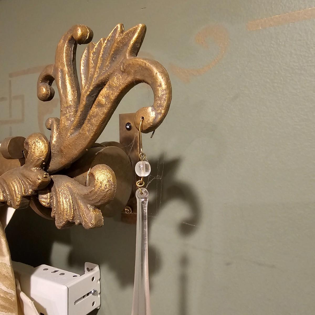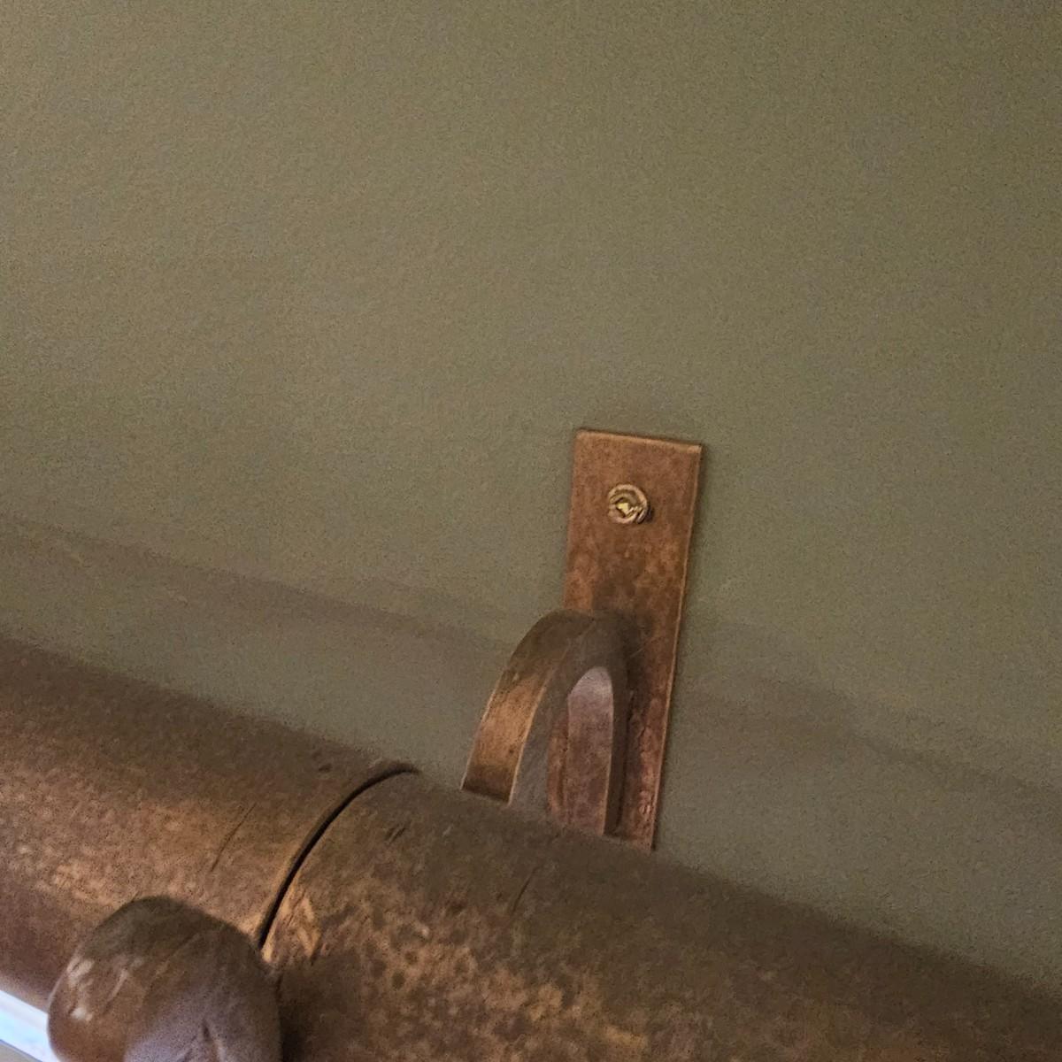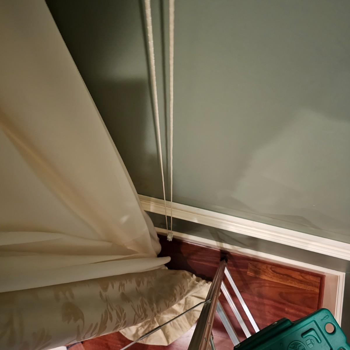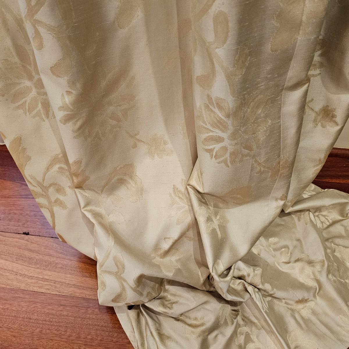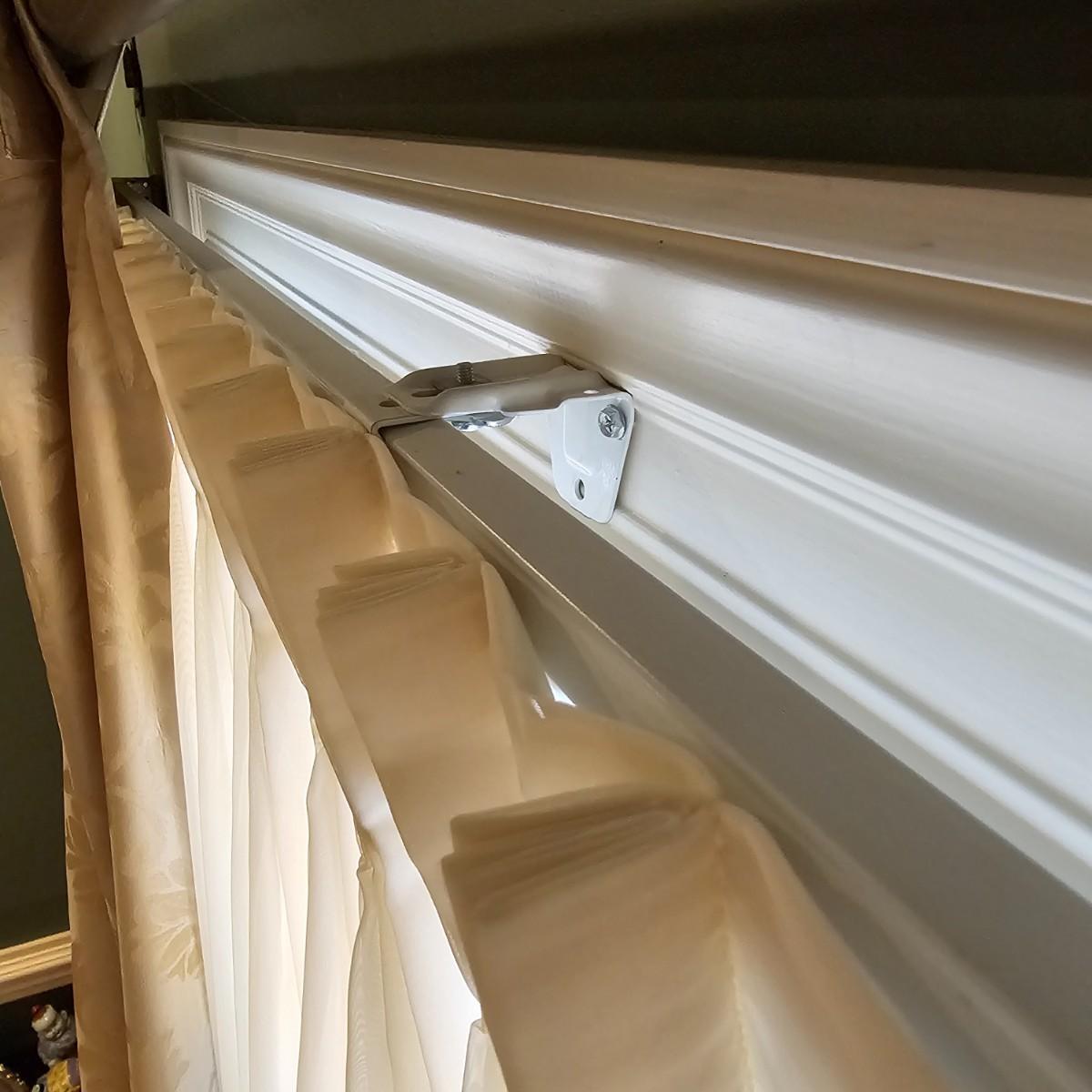 Window treatments for large opening. White shears on standard traverse rod and side panels on round rod with finial attachments on ends. Shears are 130" x 107" H, gold side panels are 26" x 125"H and puddle at bottom, with a white linen lining. Buyer will need to bring ladder and tools to remove from wall: screwdrivers, allen wrenches. See photos for details. Local pickup only.