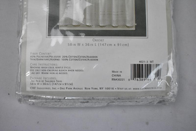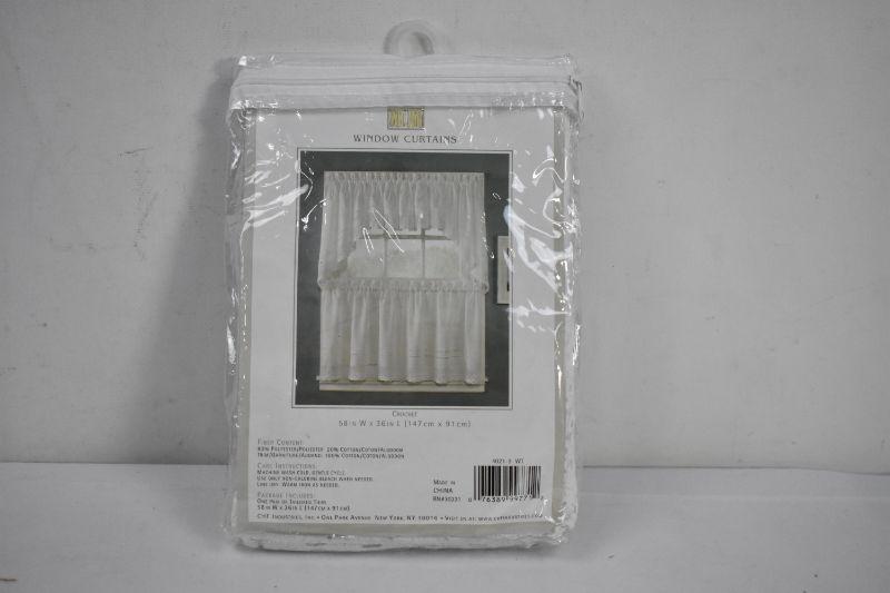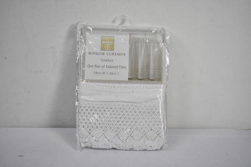 Window Curtains, Crochet, White, One Pair of Tailored Tiers, 58" x 36" - New