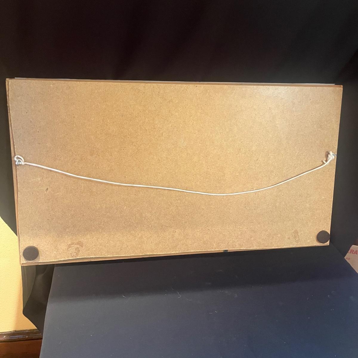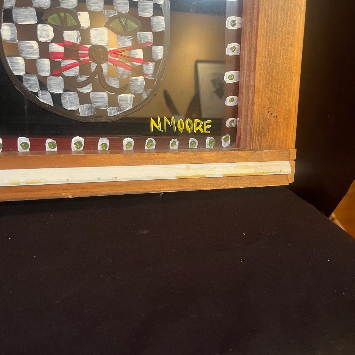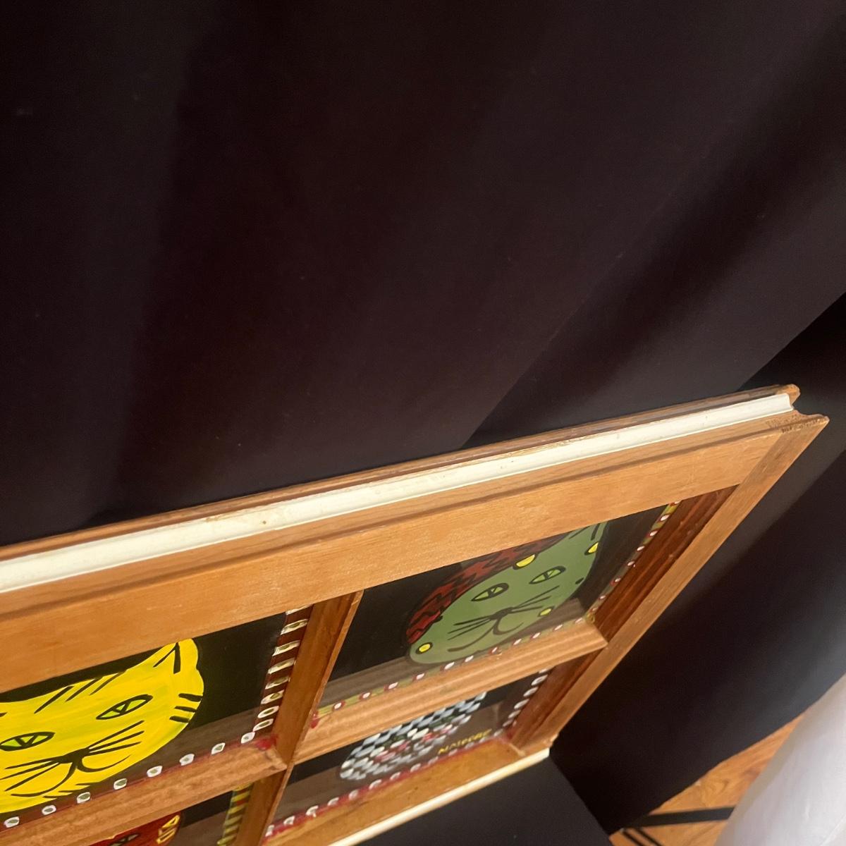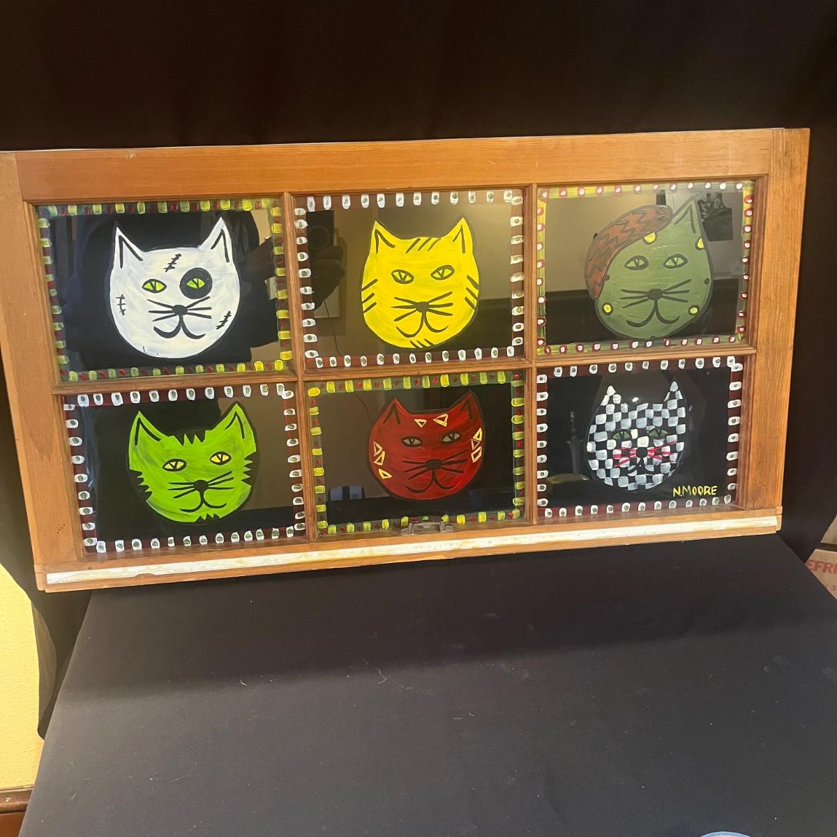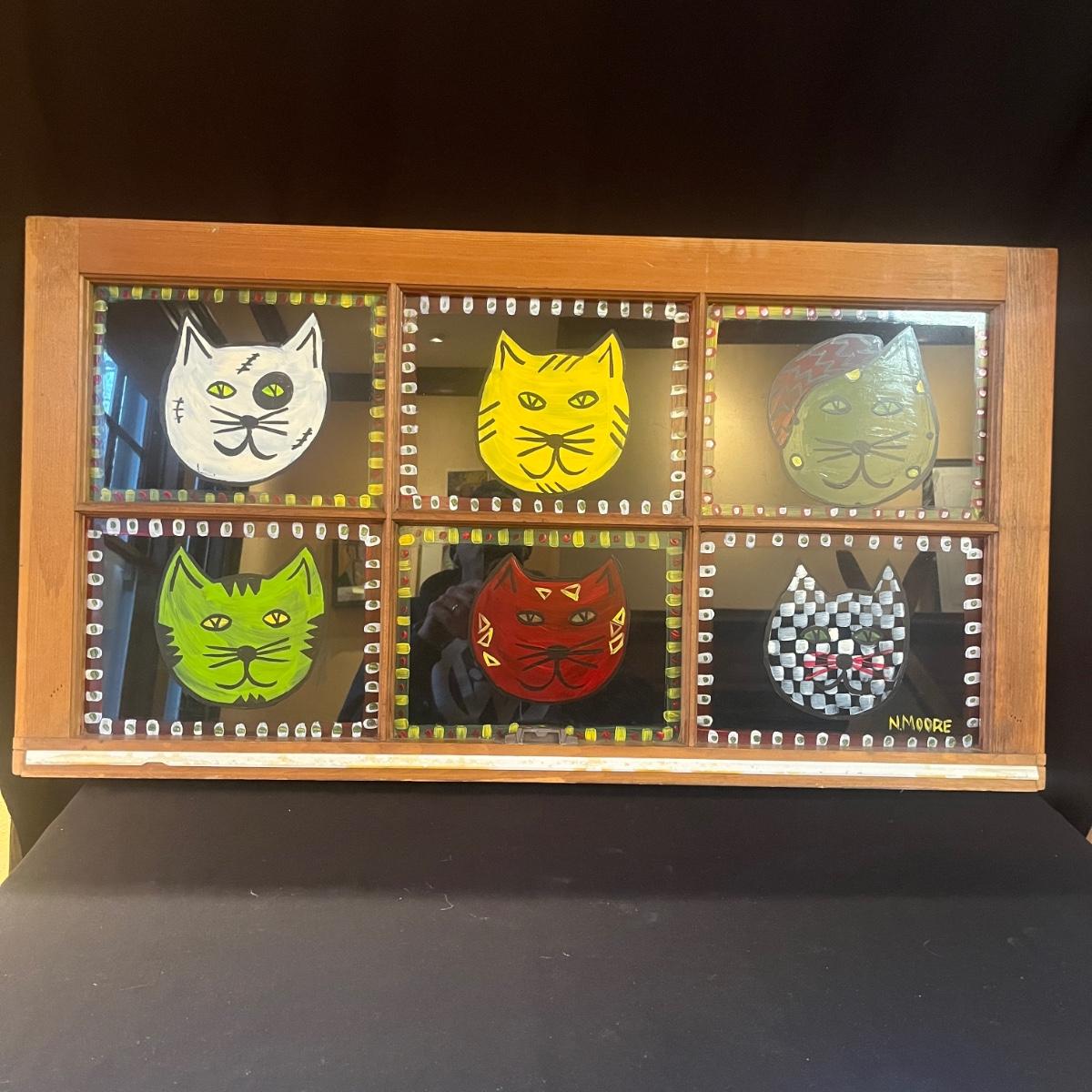 Lot includes a wooden window frame made into cat art and signed by artist N. Moore. Piece measures 36” x 1.5” x 19”H.