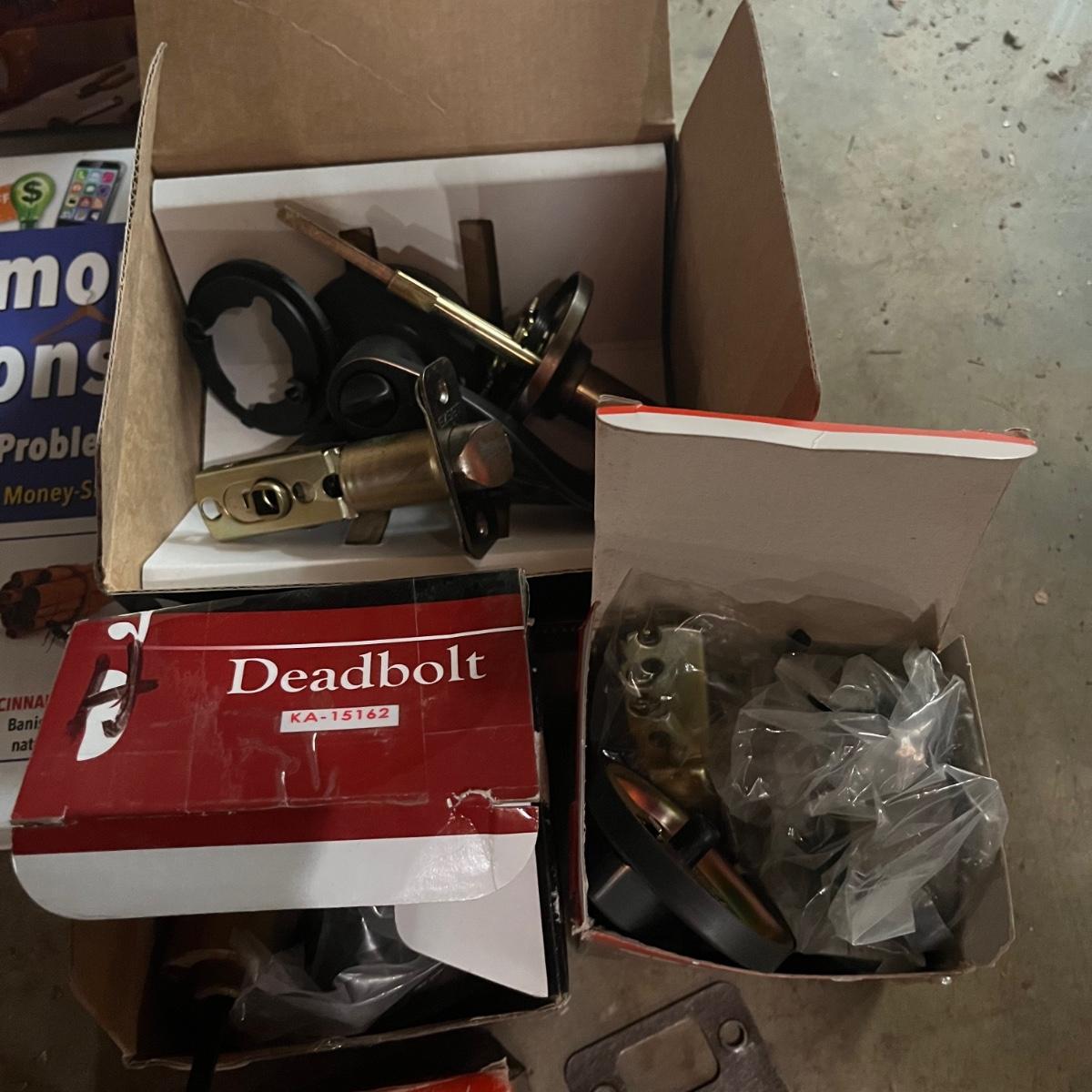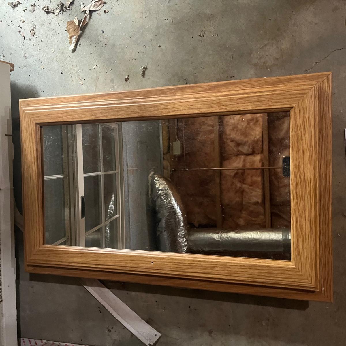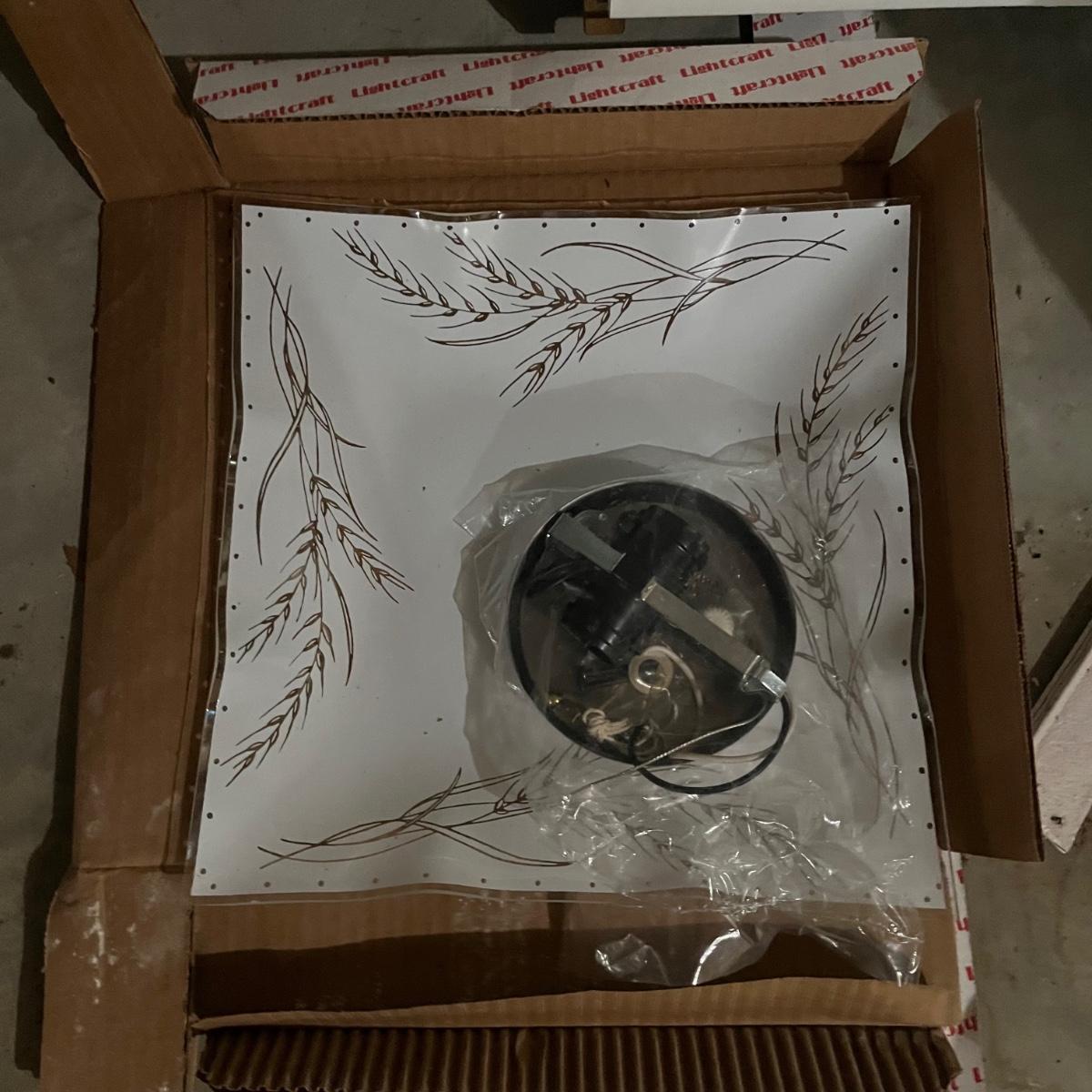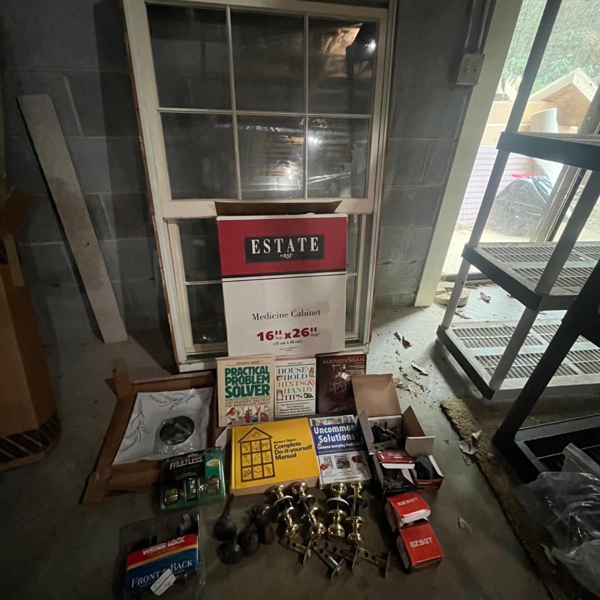 Lot includes a window with wooden frame, wooden medicine cabinet, home improvement books and an assortment of door knobs. The light fixture is a 12”square x 5.5” inch high ceiling light by lightcraft. We cannot guarantee all pieces are included with doorknobs. Window measures 32” x 52.5” x 6”.