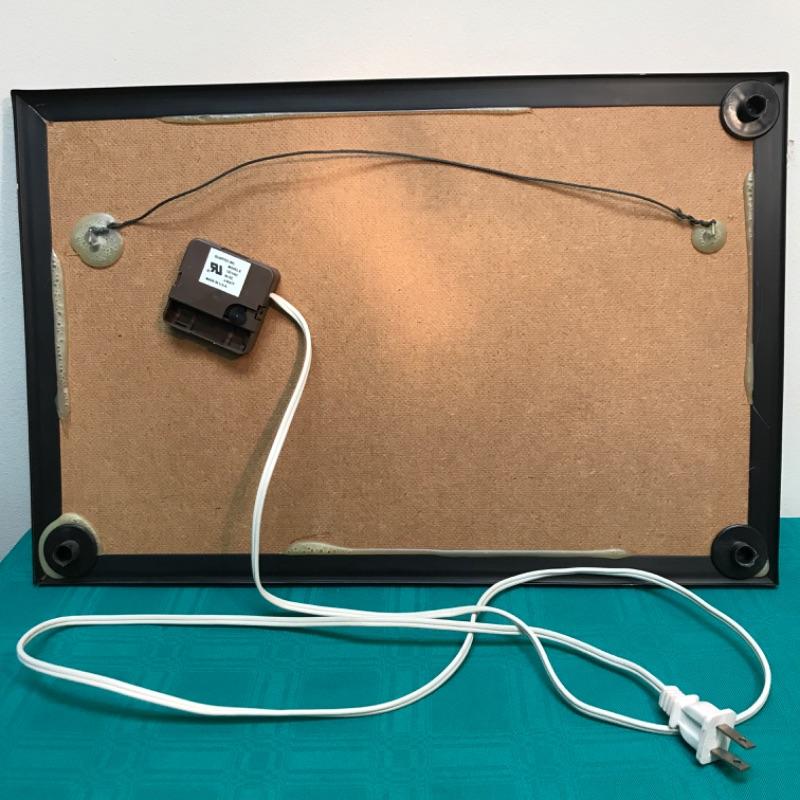 Clock has the option to be either battery powered, or plugged into an outlet. Cannot guarantee functionality of the clock. The clock measures approximately 11 7/8“ X 18 1/8“.
