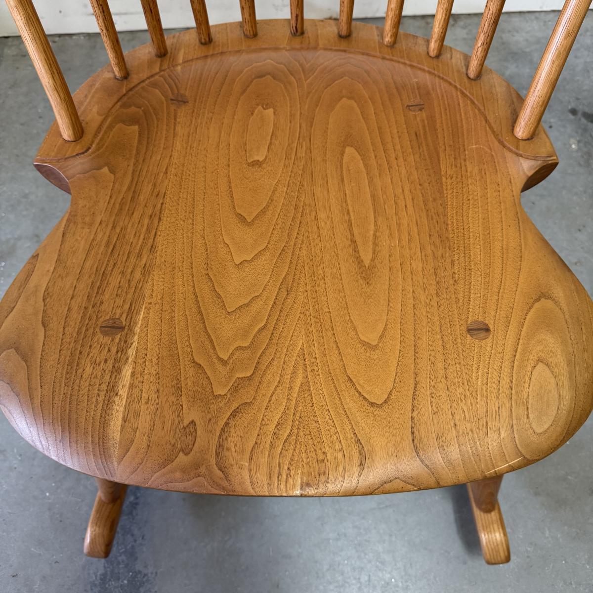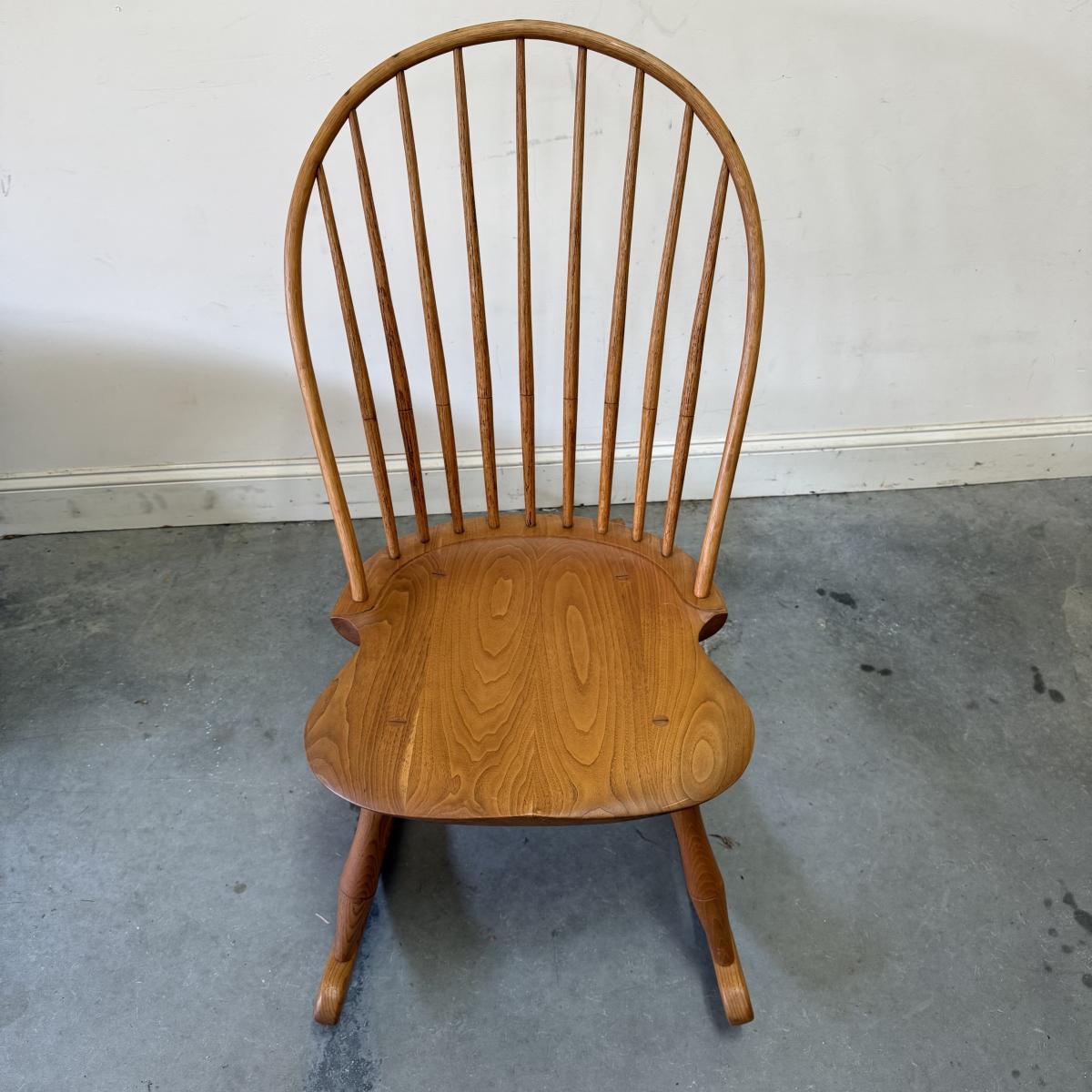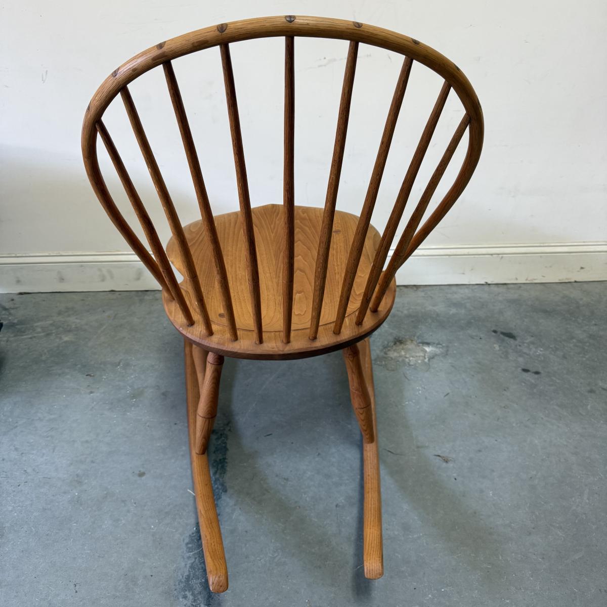 This lot contains a beautiful Windsor style rocking chair. This gorgeous chair is beautifully made with a nice rock and measures 18.5” x 19” x 36”H with a 17”H seat height. Artist signed on bottom, chip carving style. Local pick up only.