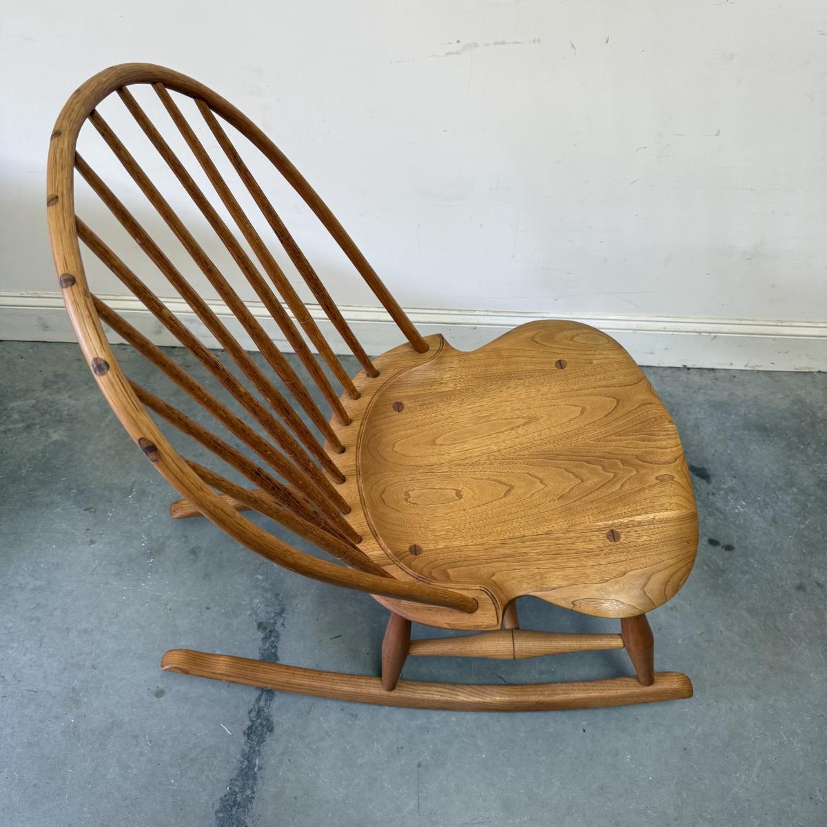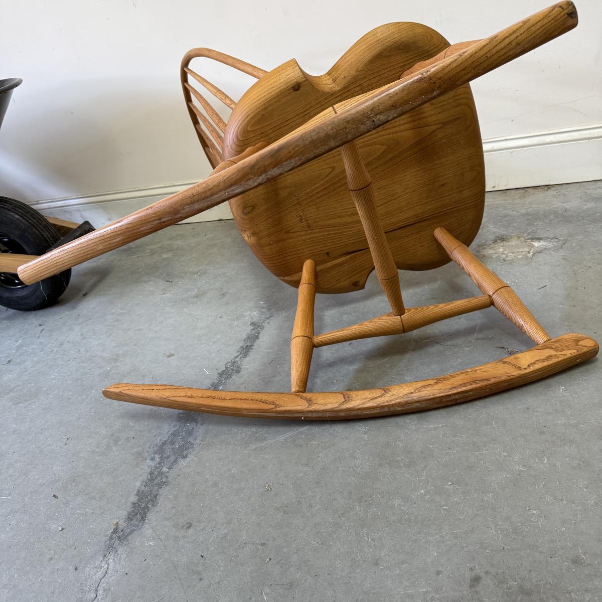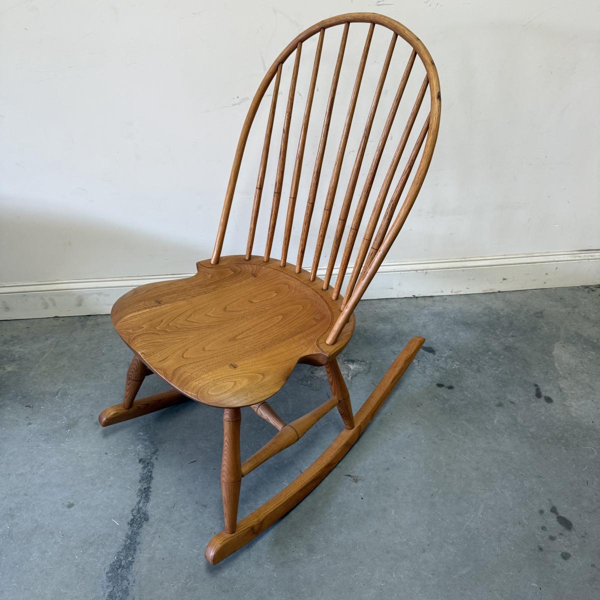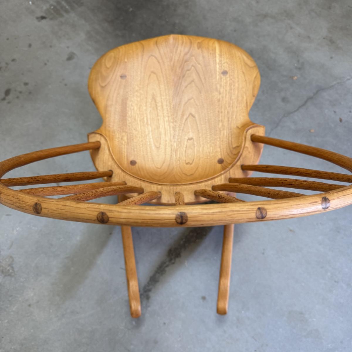 This lot contains a beautiful Windsor style rocking chair. This gorgeous chair is beautifully made with a nice rock and measures 18.5” x 19” x 36”H with a 17”H seat height. Artist signed on bottom, chip carving style. Local pick up only.