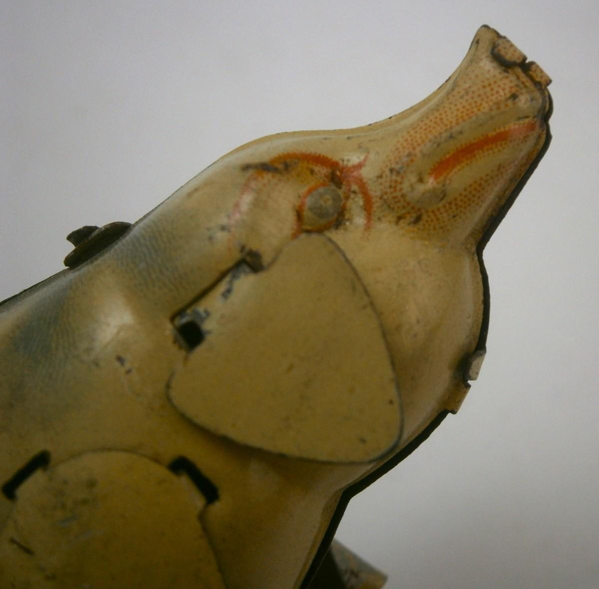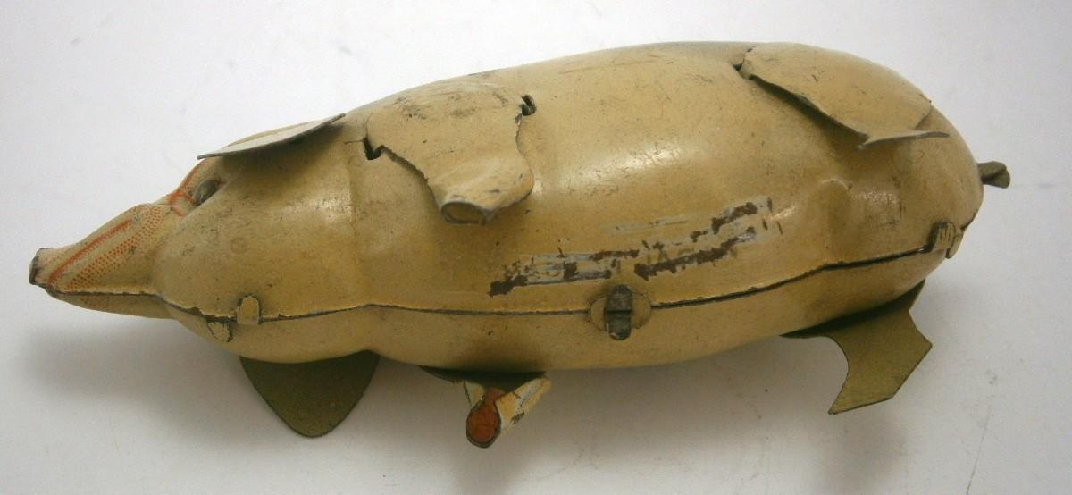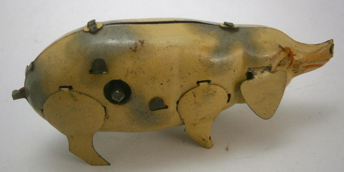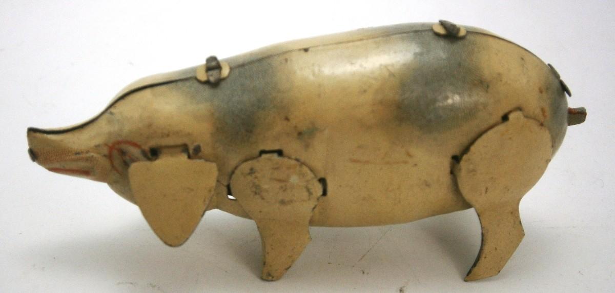 Wind-Up Mechanical Pig Toy from the Early 1900's made in Pre WWII Germany or Japan, 3 1/4 in. long, lithographed tin, works, missing tail (rubber).
