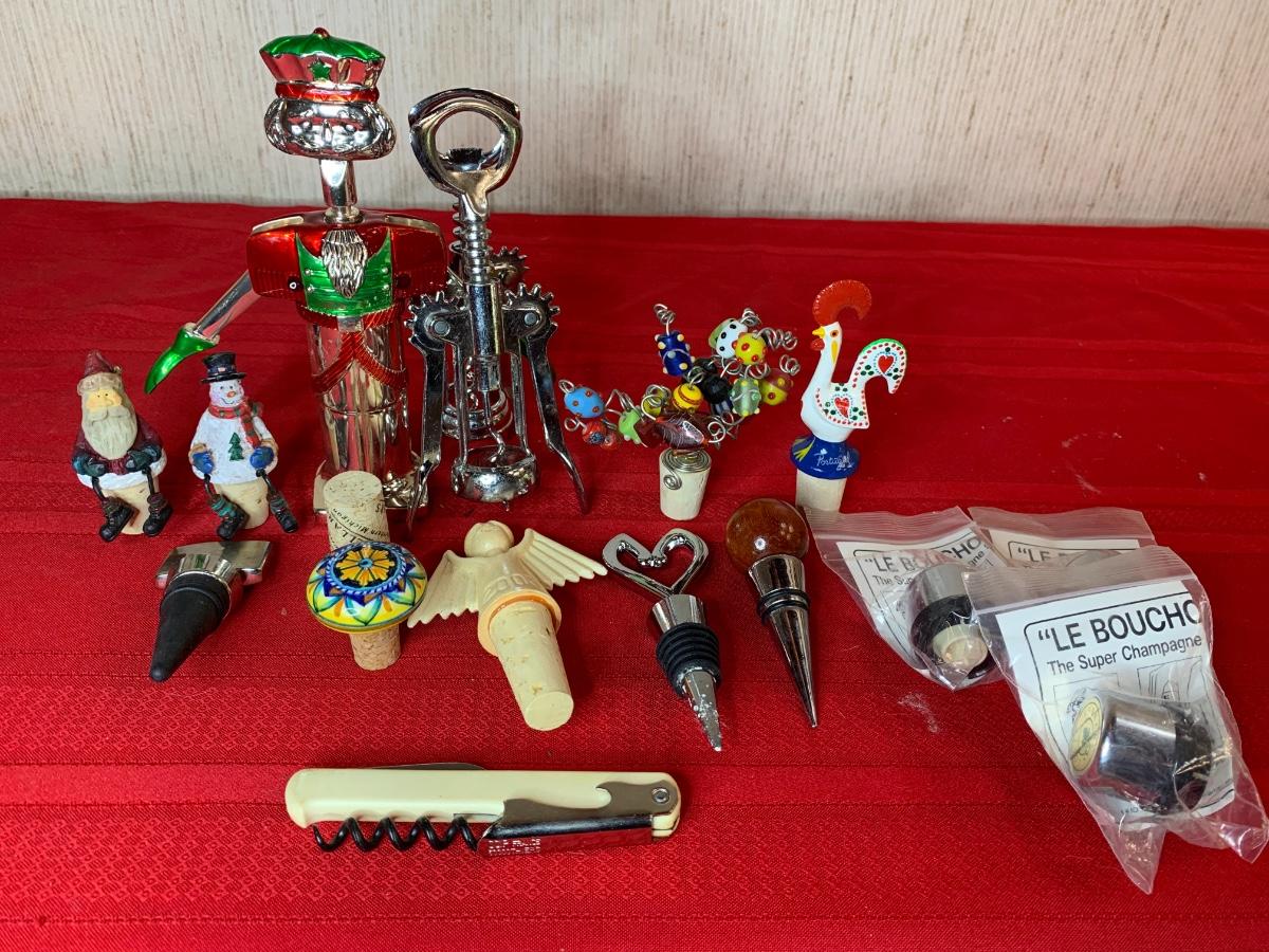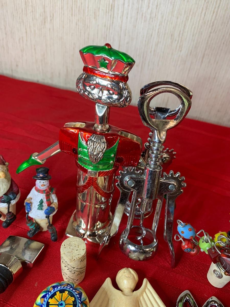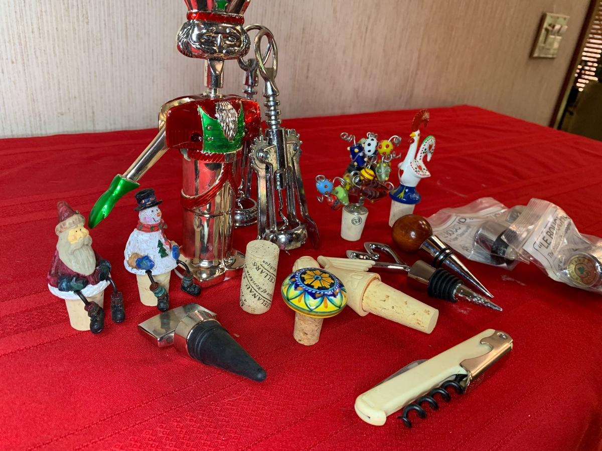Assorted ornate wine corks and corkscrews, perfecting for entertaining around the holidays!