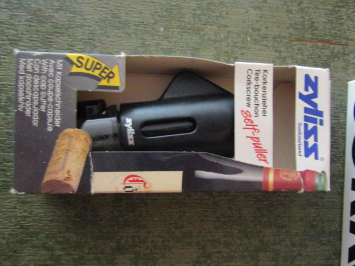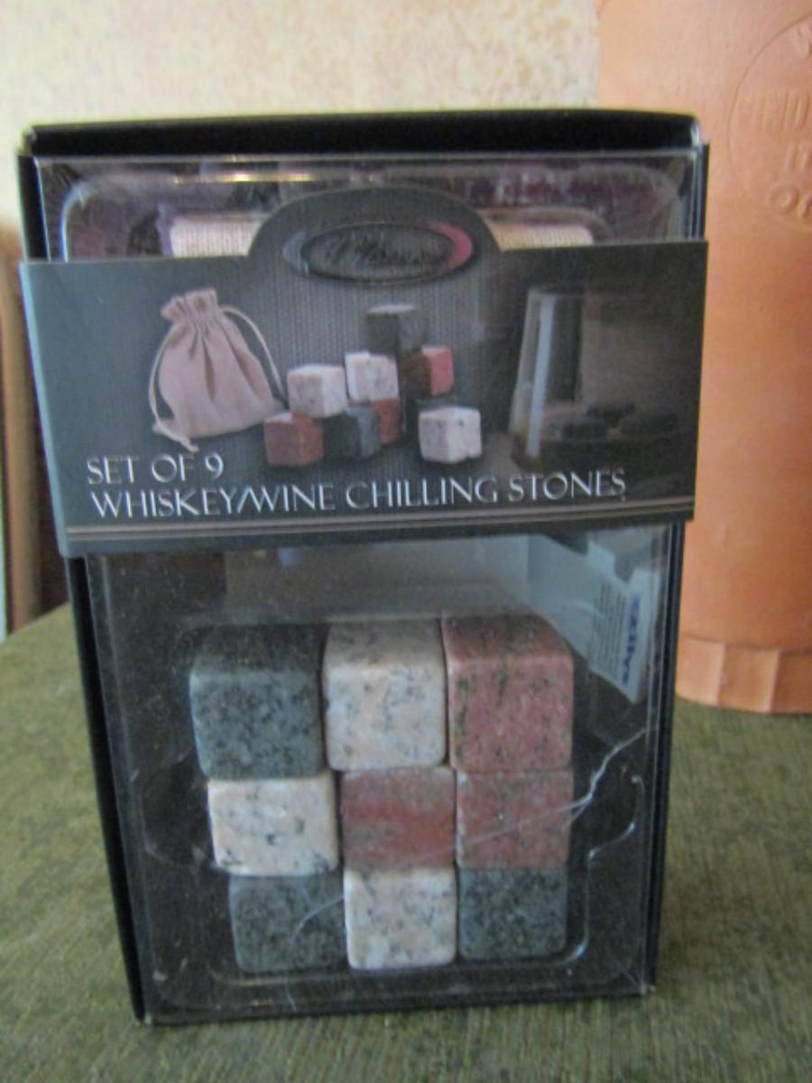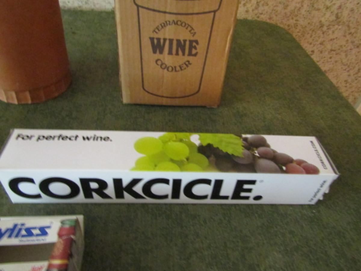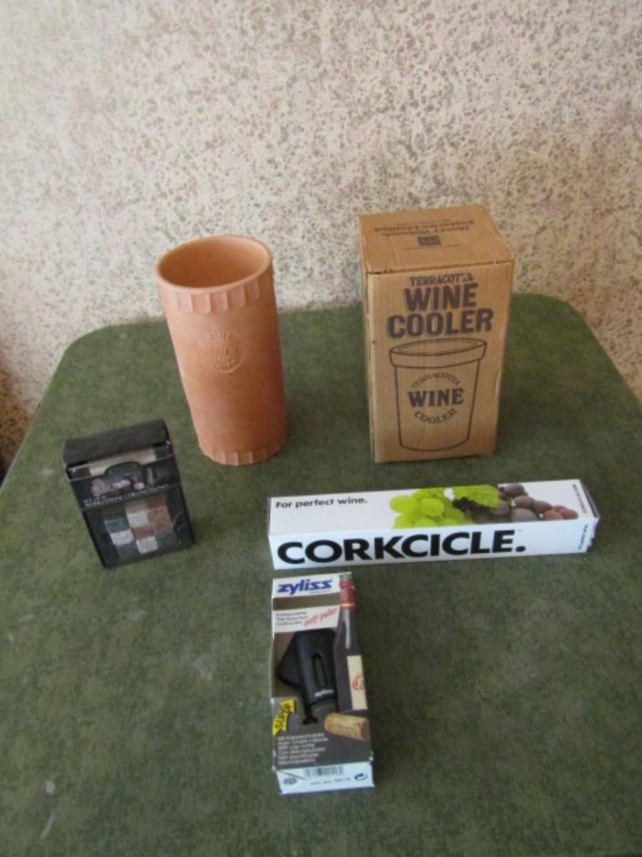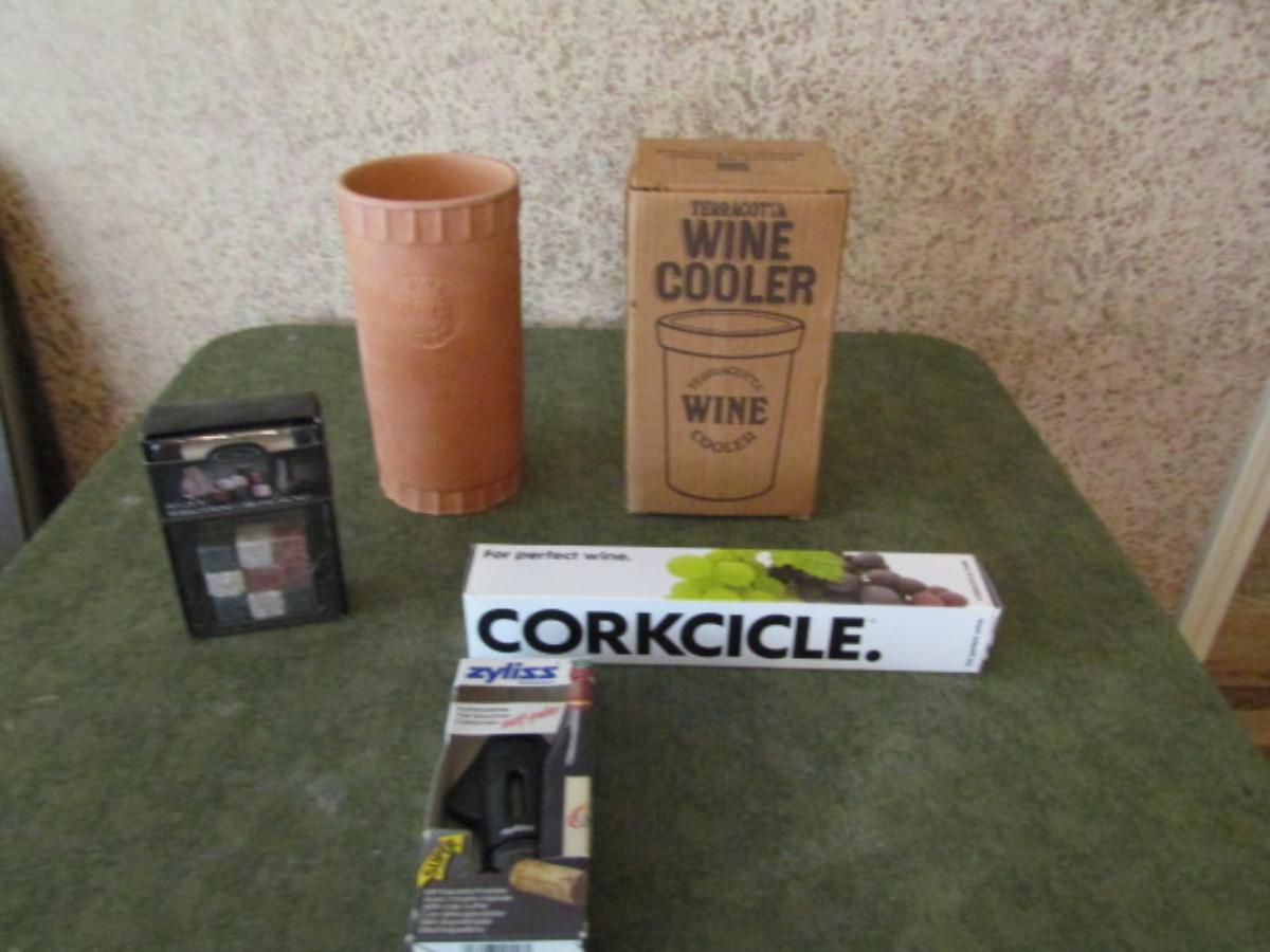 Wine Accessories. Two wine coolers, Corkcicle, cork screw, and chilling stones.