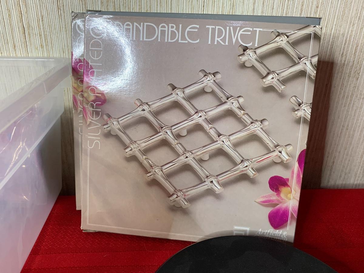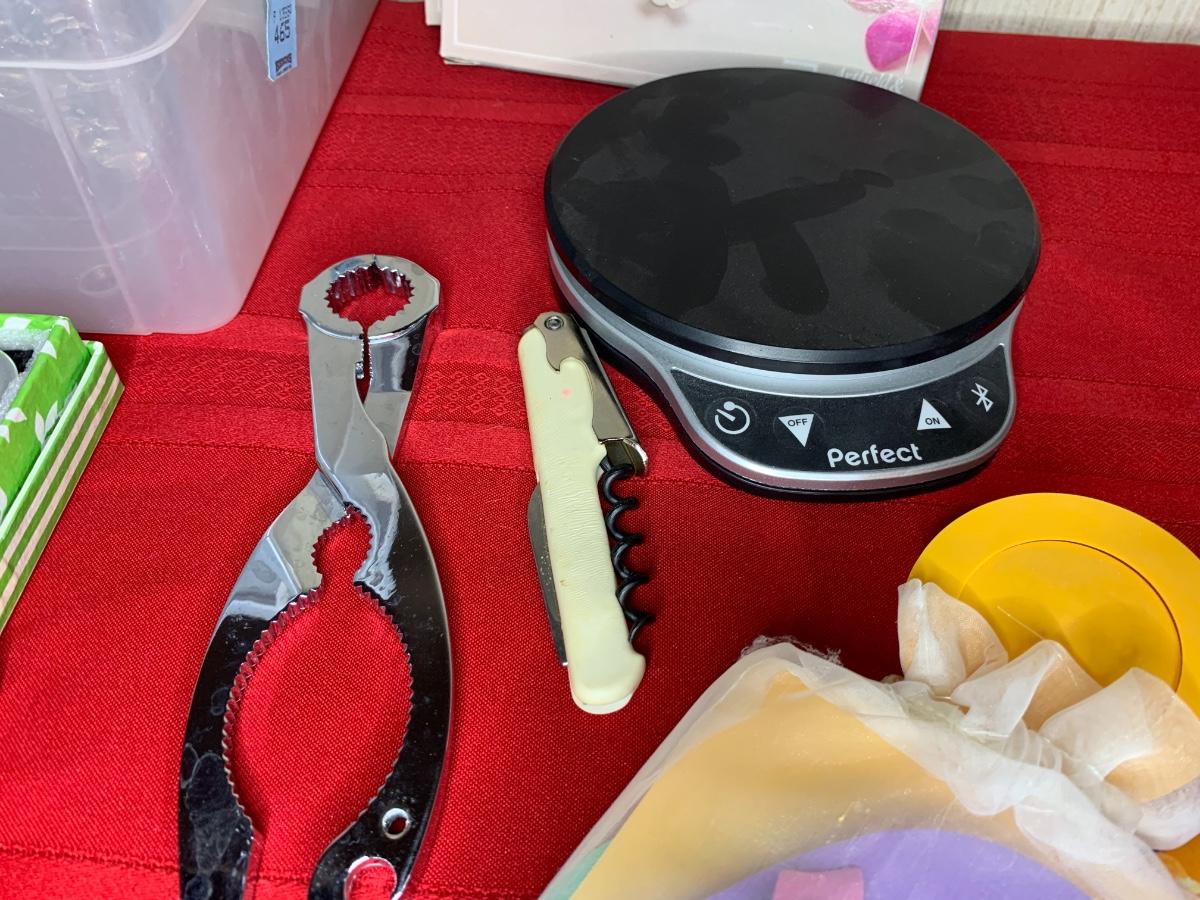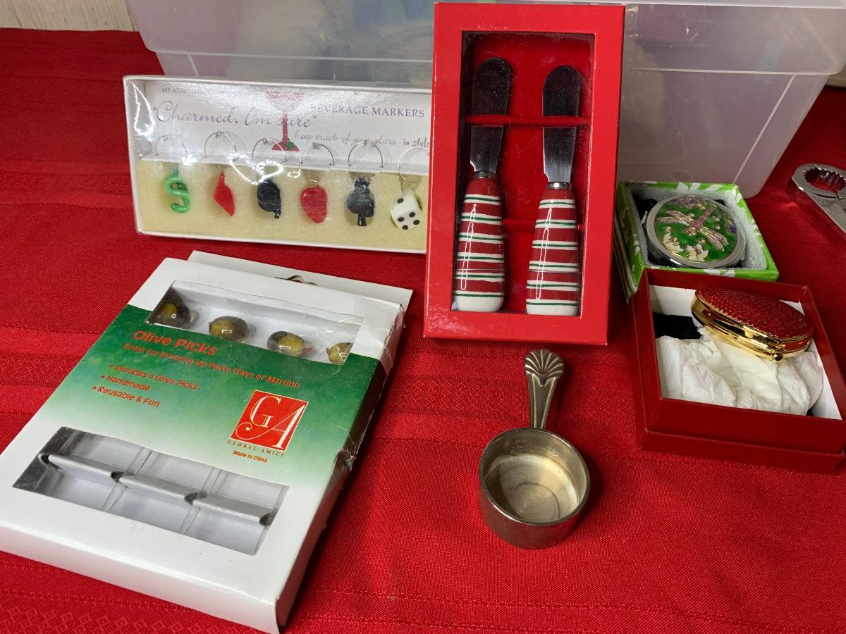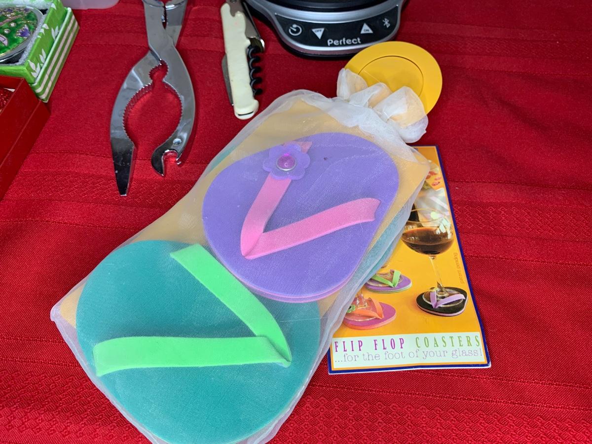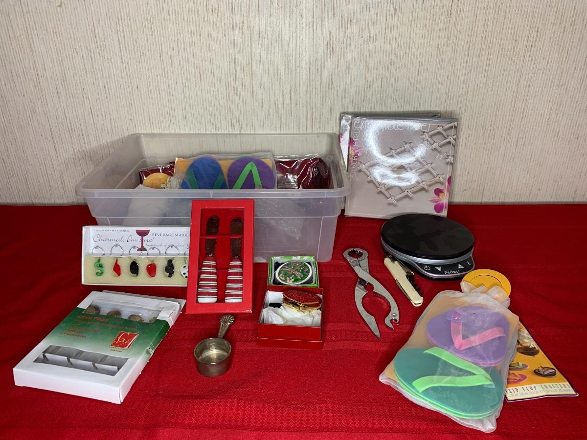 Wine Accessories including coasters, beverage markers, two expandable trivets, perfect scale, wine openers, nut cracker, cheese/butter knives.
