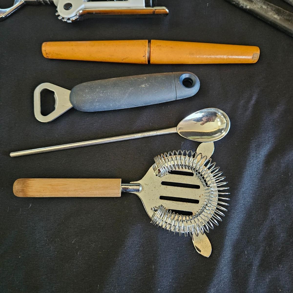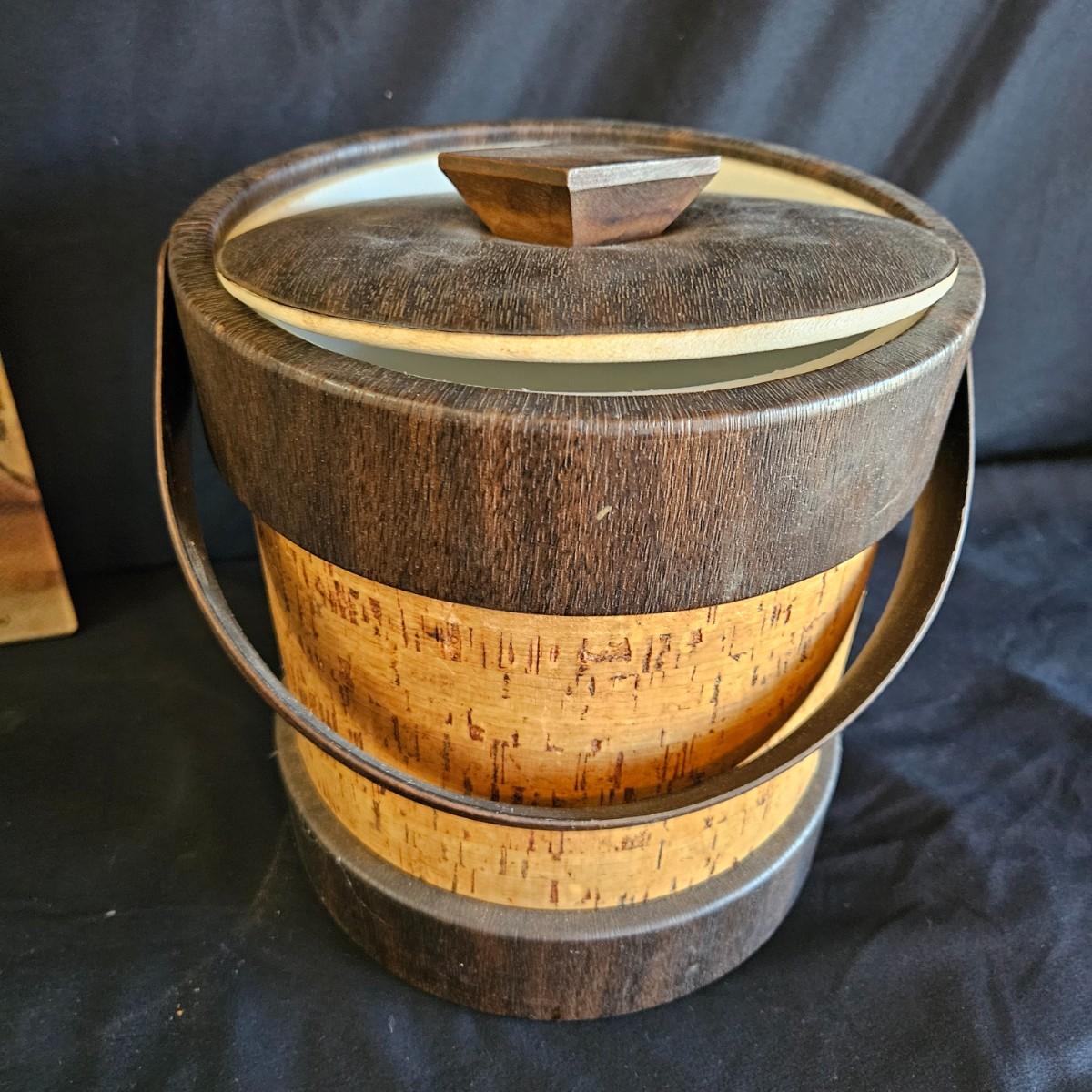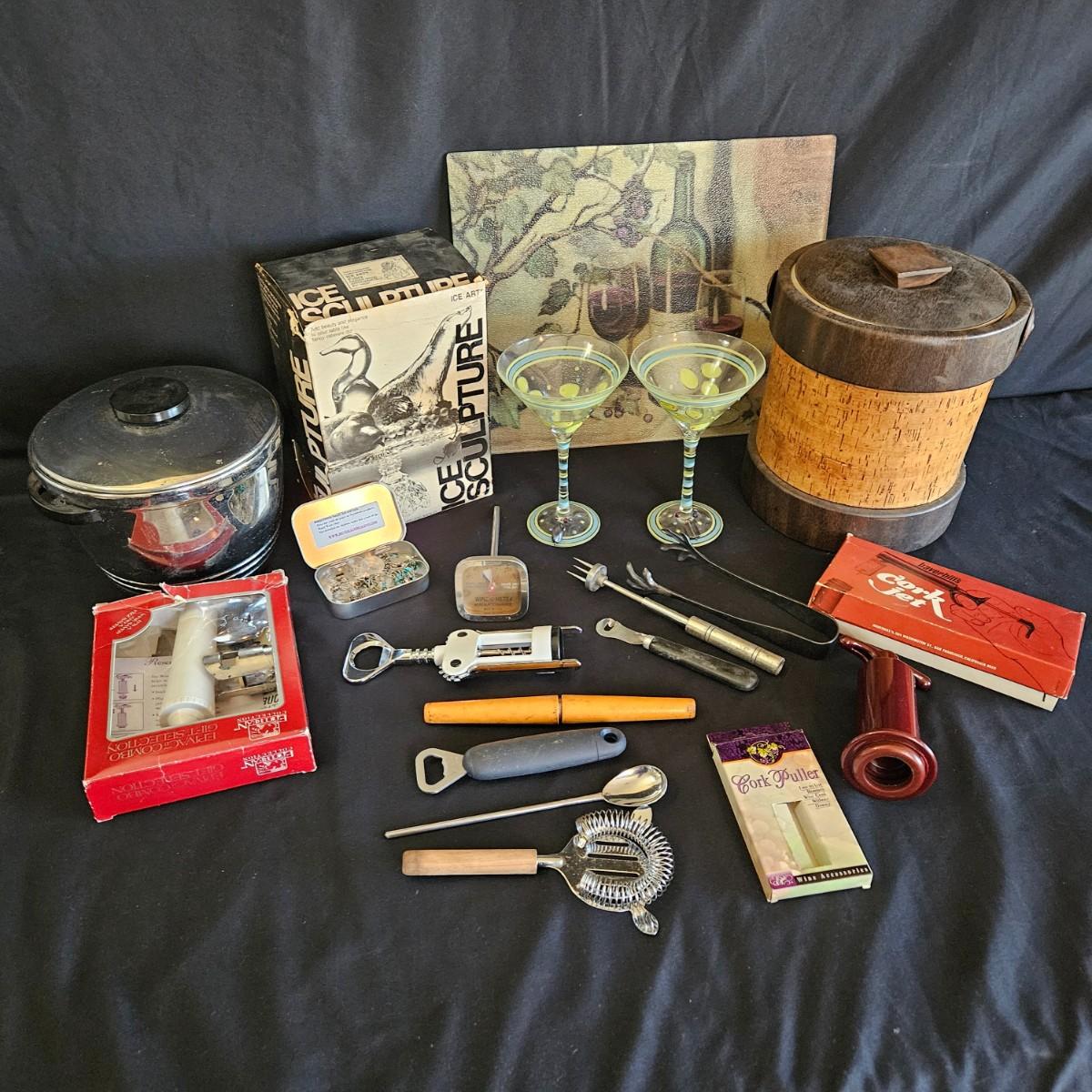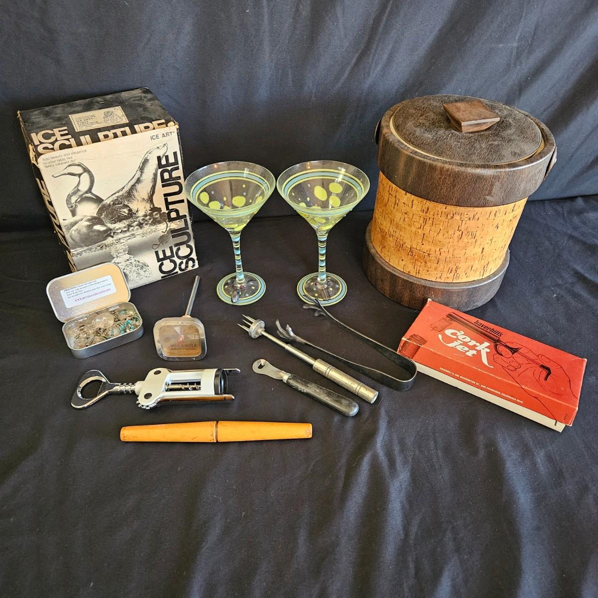 An assortment of wine and cocktail accessories that includes two ice buckets, two martini glasses, an ice mold, cork pullers, tongs, ice picks and more. The cork sided ice bucket measures approximately 8.5" x 10"H. Shipping available