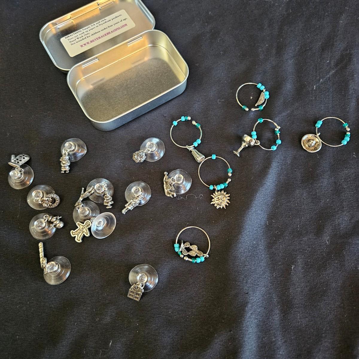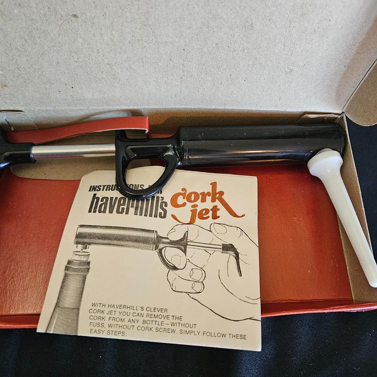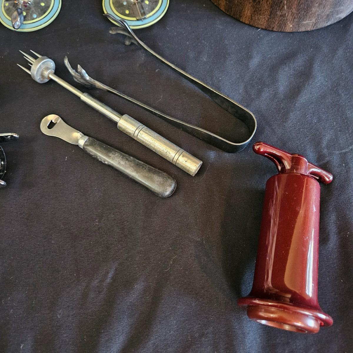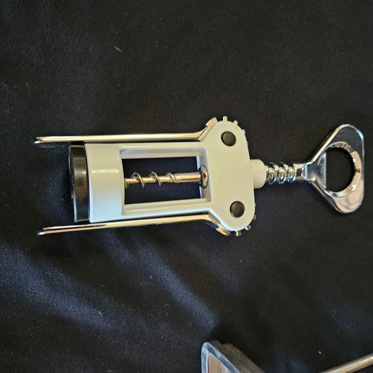 An assortment of wine and cocktail accessories that includes two ice buckets, two martini glasses, an ice mold, cork pullers, tongs, ice picks and more. The cork sided ice bucket measures approximately 8.5" x 10"H. Shipping available